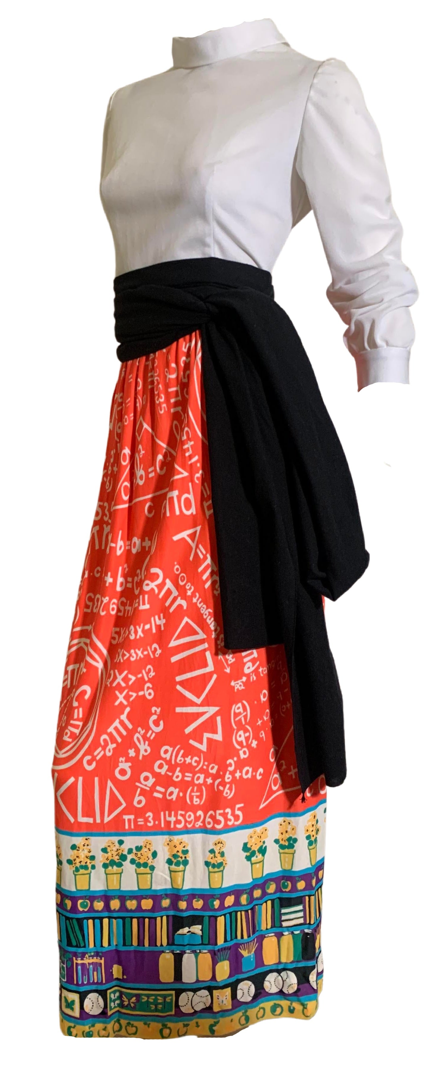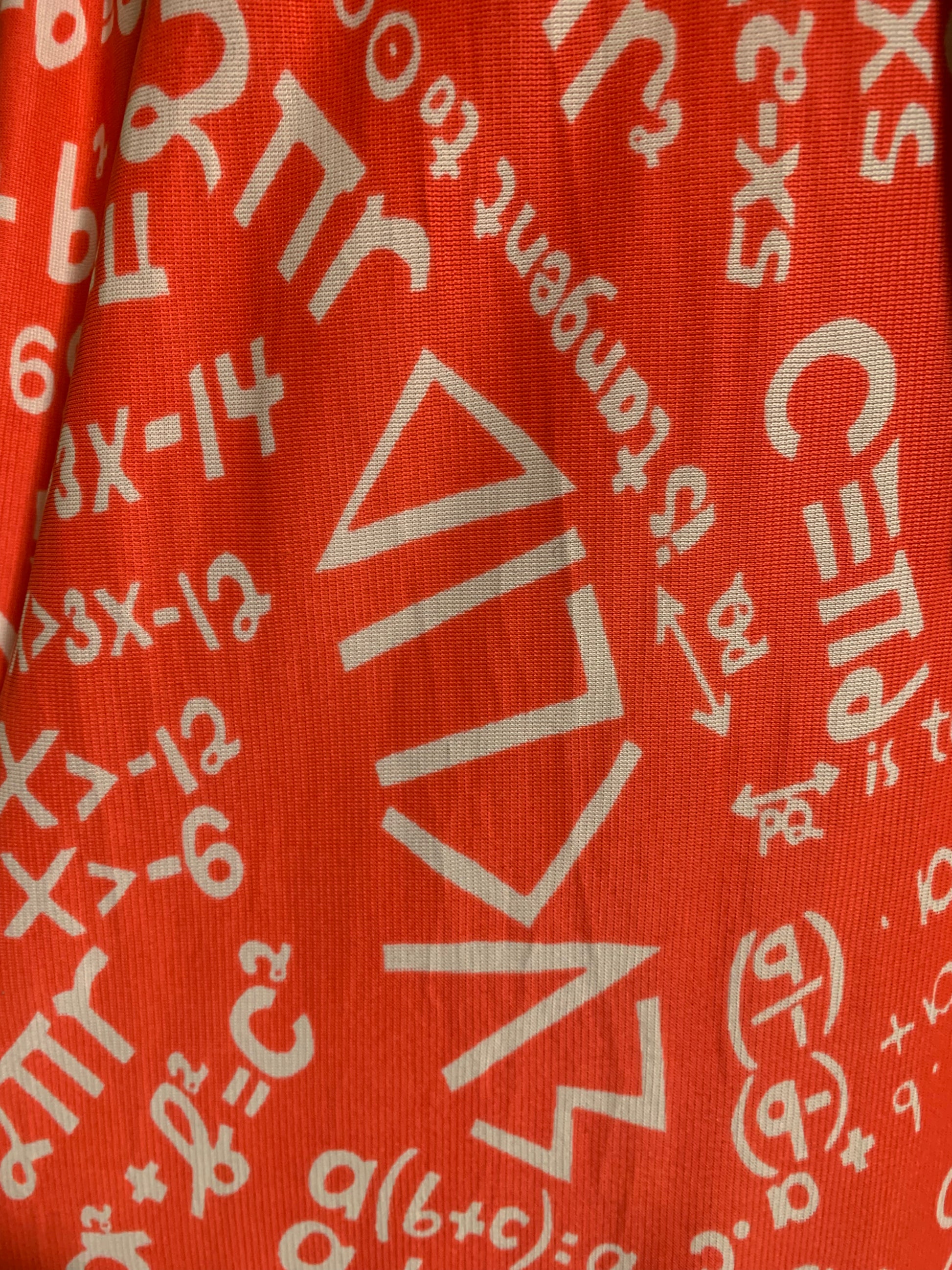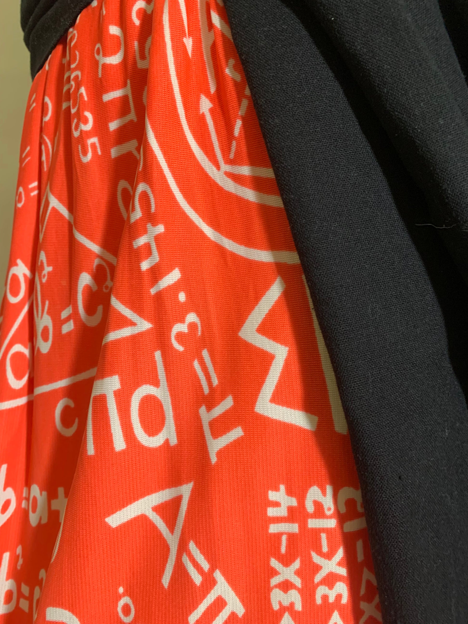 The SKIRT though! Red jersey nylon Euclidean Geometry print with a "teacher" theme border print. I've never seen anything like it! I'm showing it with a black cotton super long sash I got from Amazon- but it is not included. It definitely needs a waist accent.Â
