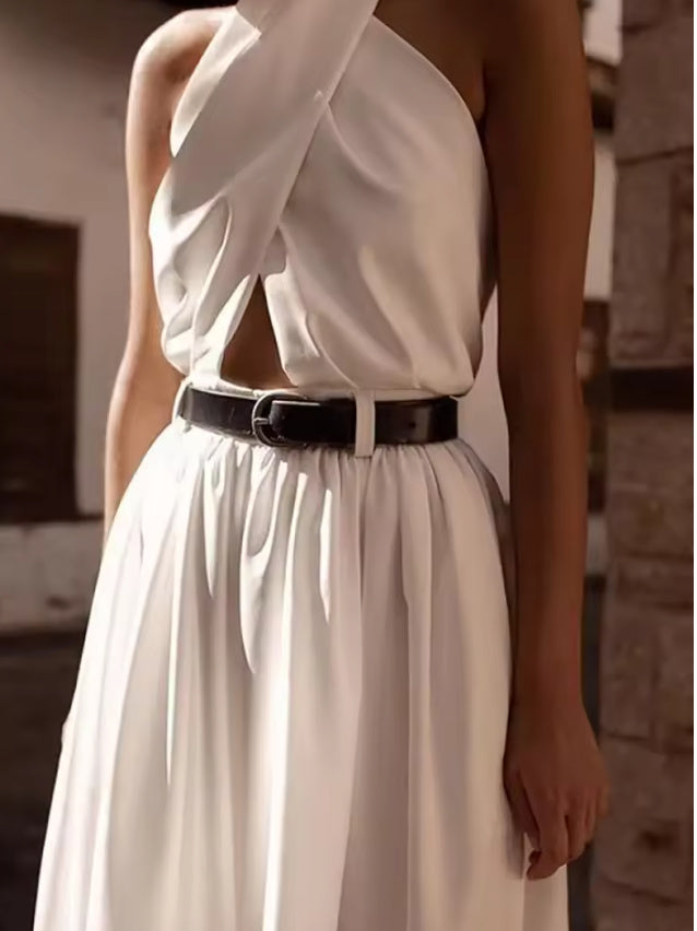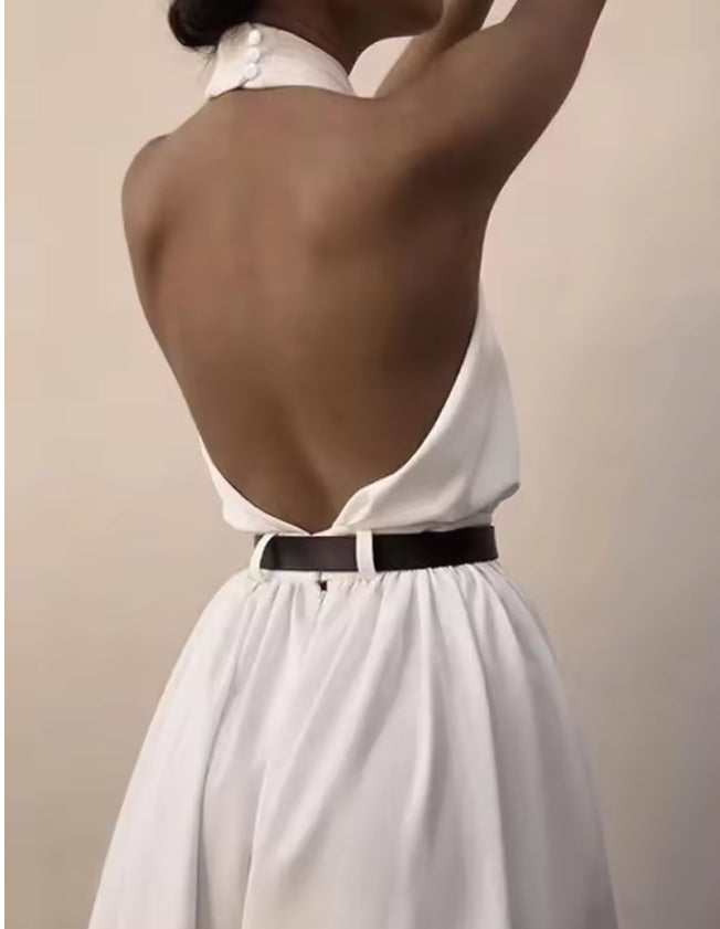 White polyester 30s inspired beach pyjama style jumpsuit with wrap front halter top and black belt- wide palazzo pants. Modern, 2-3 week delivery.