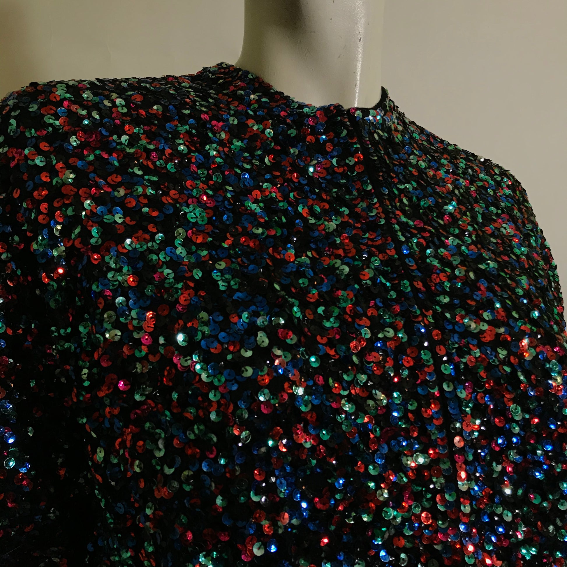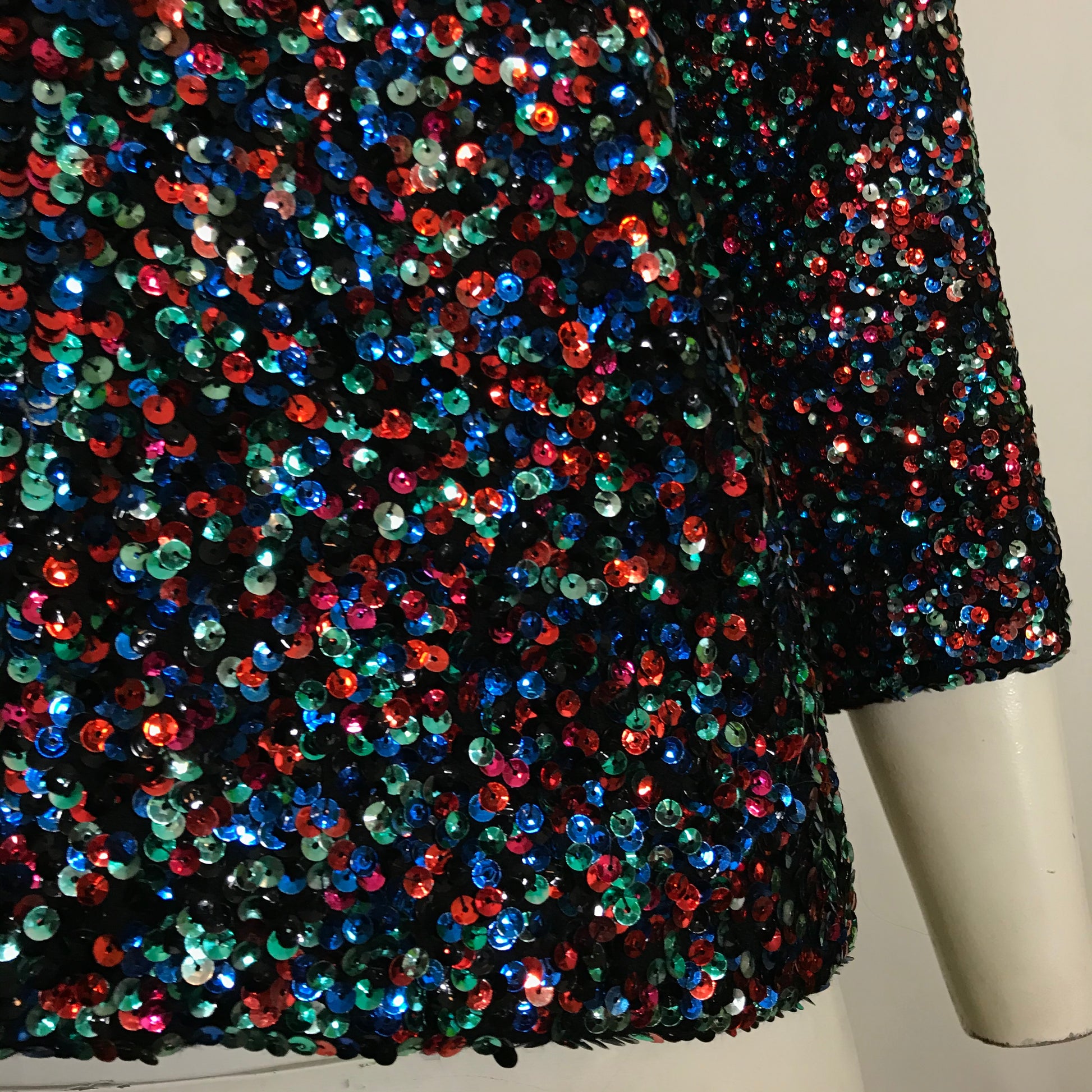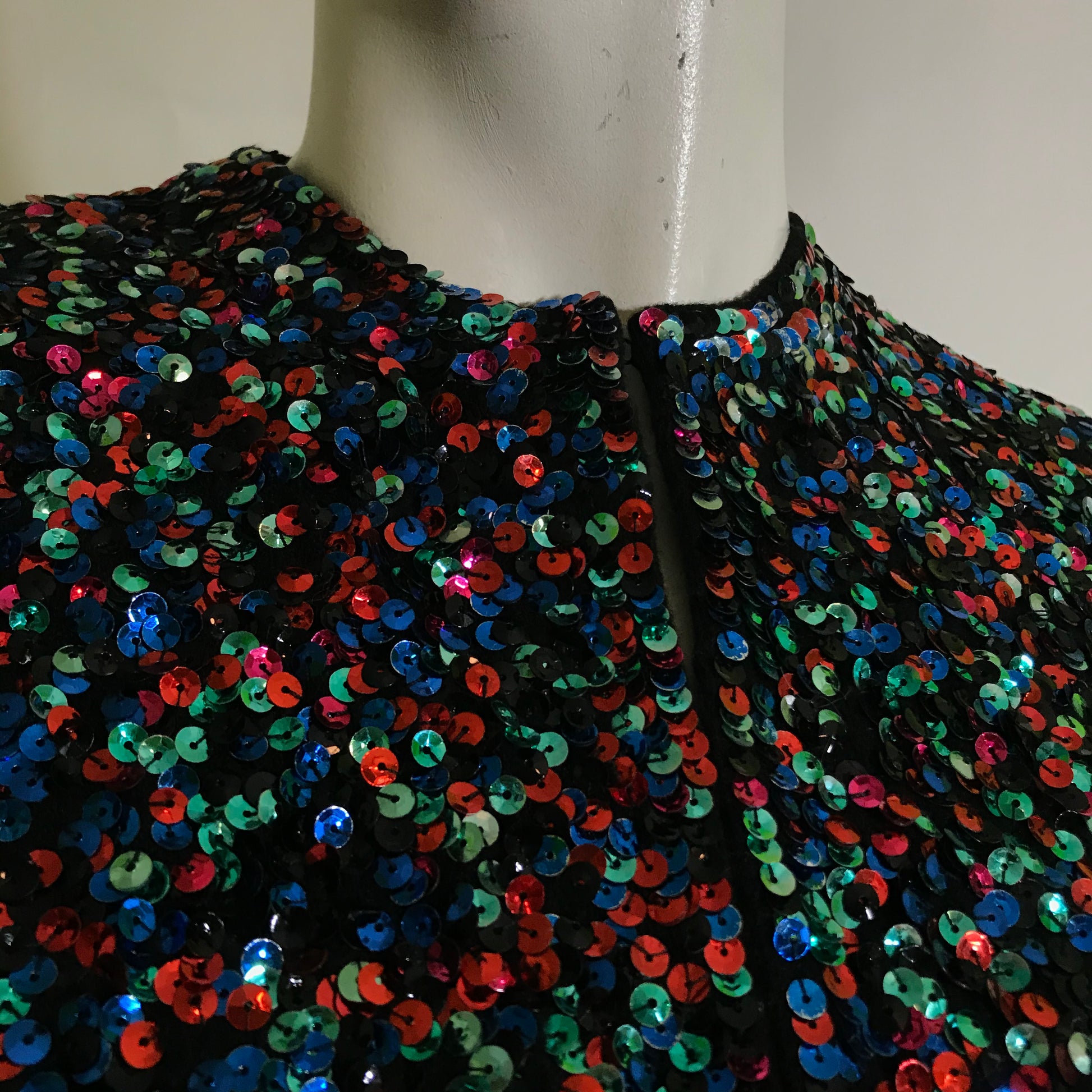 Heavily multicolored sequined black wool 1960s sweater with hook and eye up front, slightly high collar. Fully lined. Flawless and utterly gorgeous- wear over a cocktail dress or dress down with jeans!
