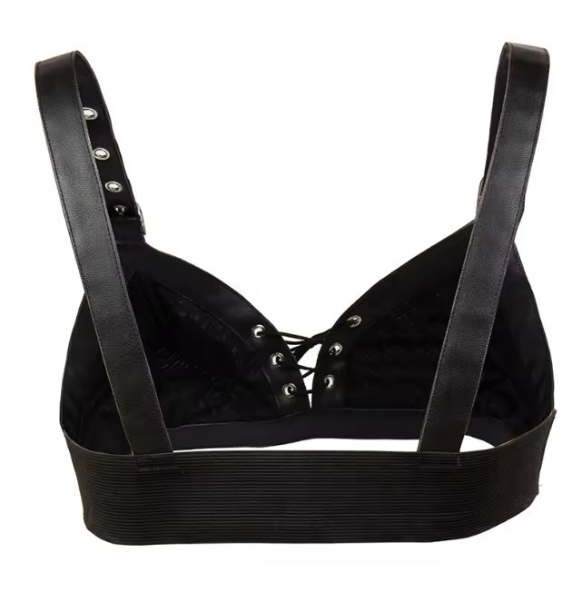 Cotton and faux leather bra with lace up front, grommets and buckles on straps. B cup. Modern, 2-3 week delivery. See chart for measurements.