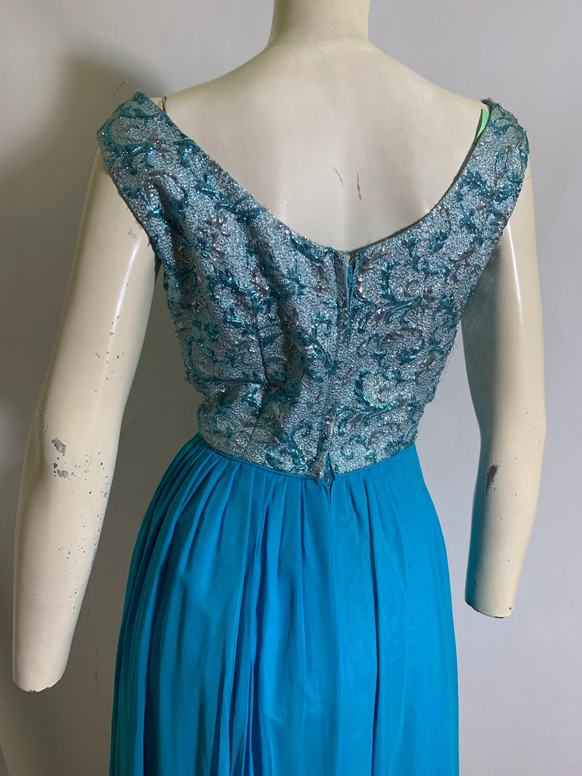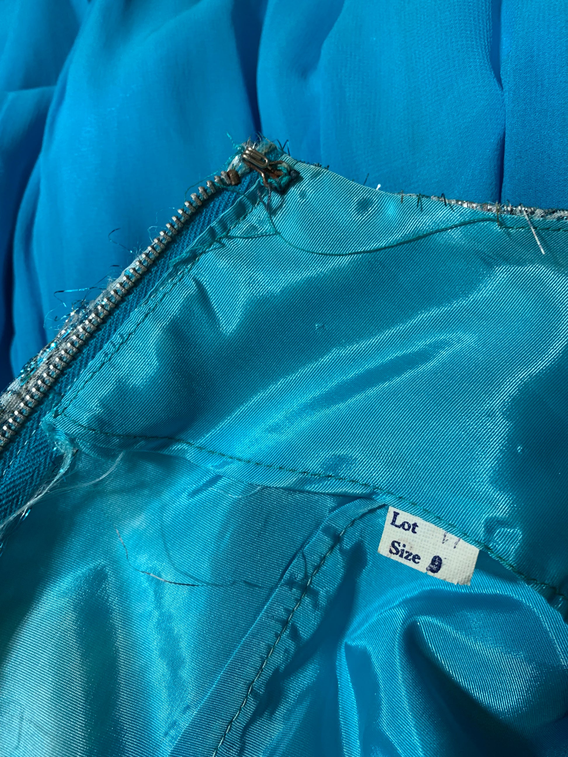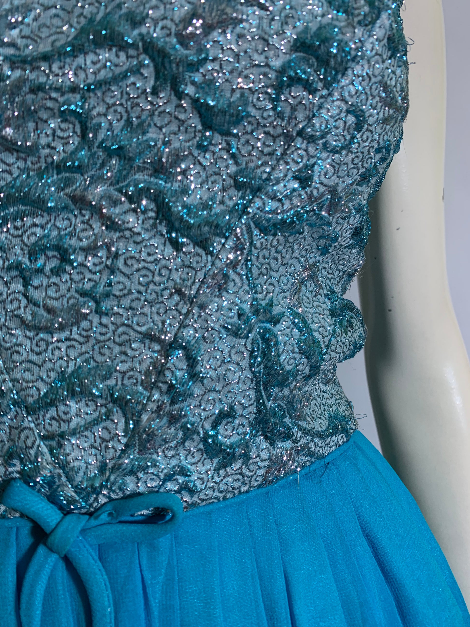Classic 1960s cyan chiffon skirted cocktail dress with tinsel lurex bodice, scoop neck lower in back. Metal zipper. Some loose tinsel threads, no stains or holes. No label.
