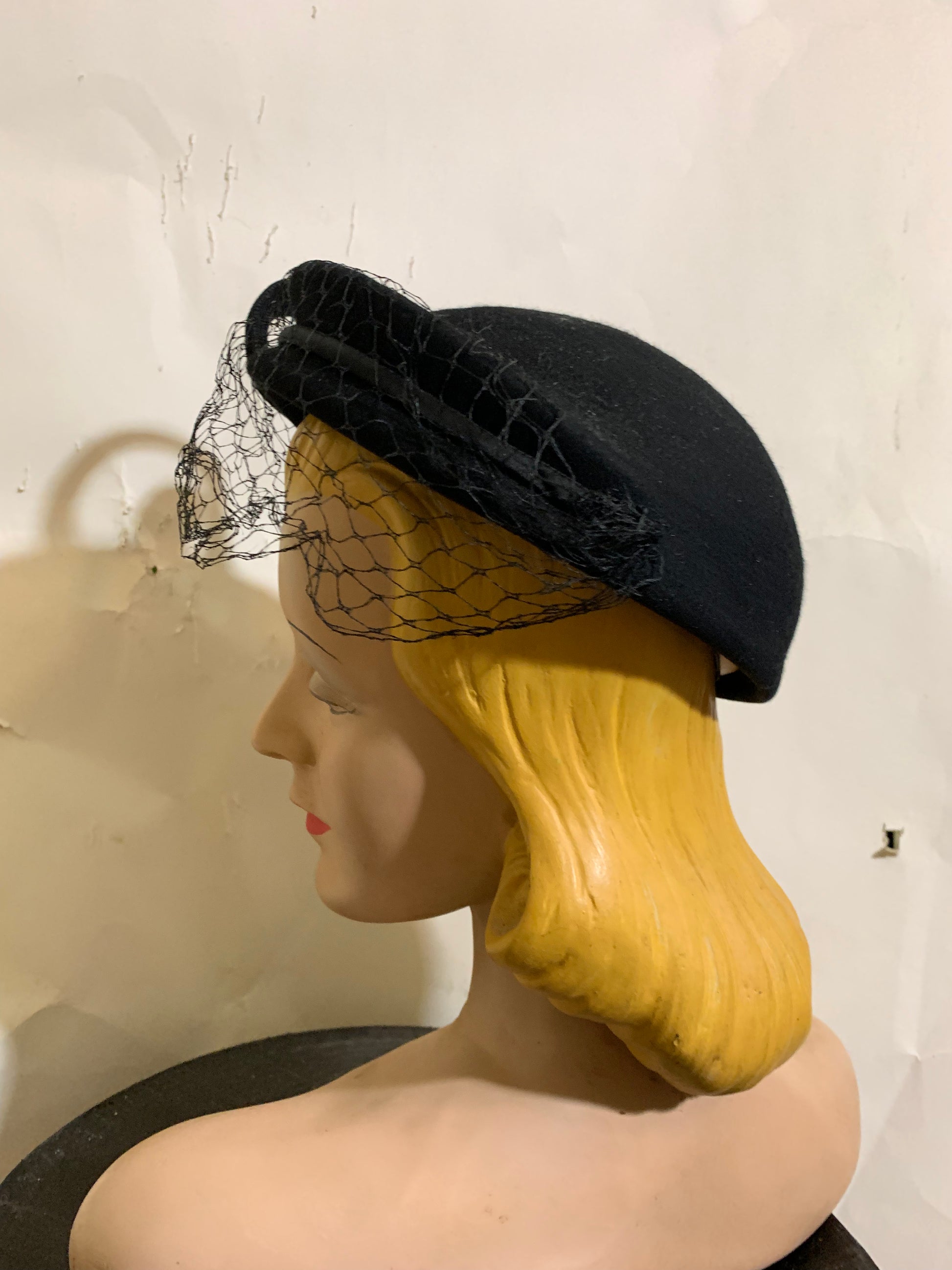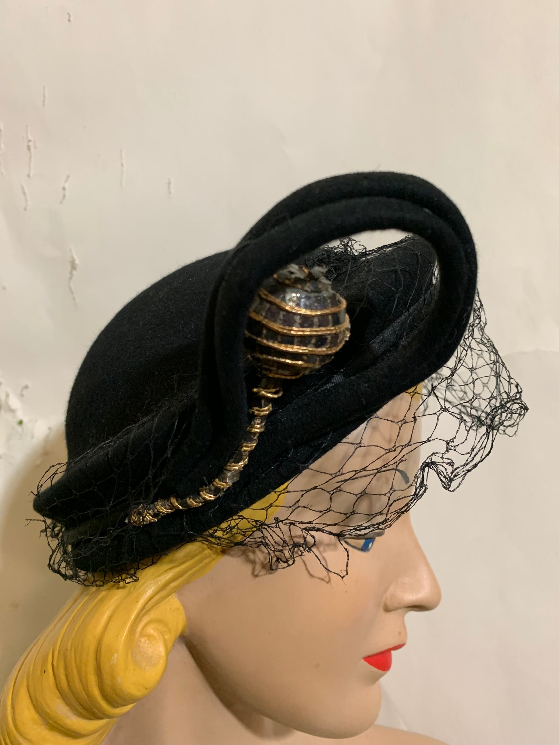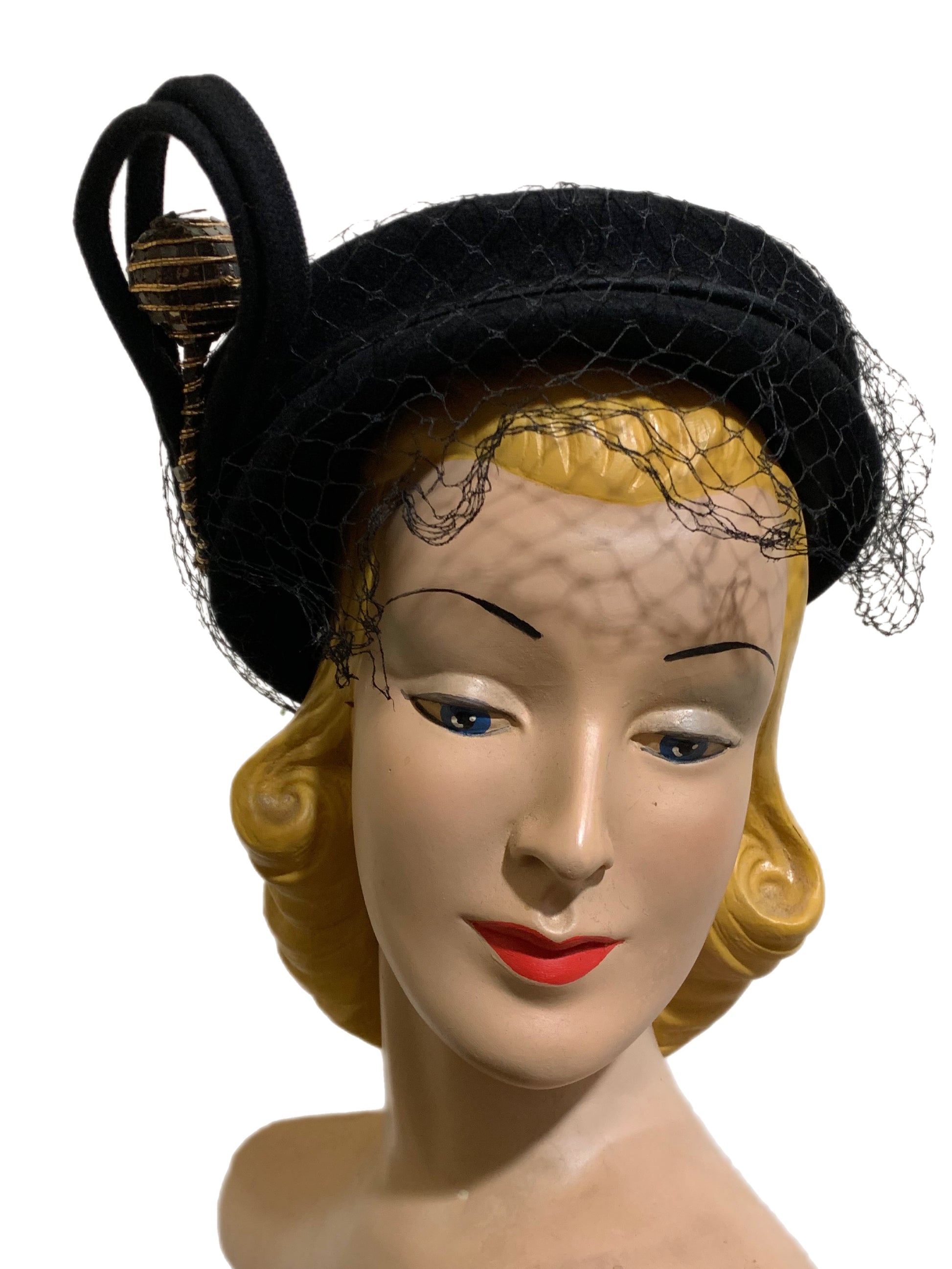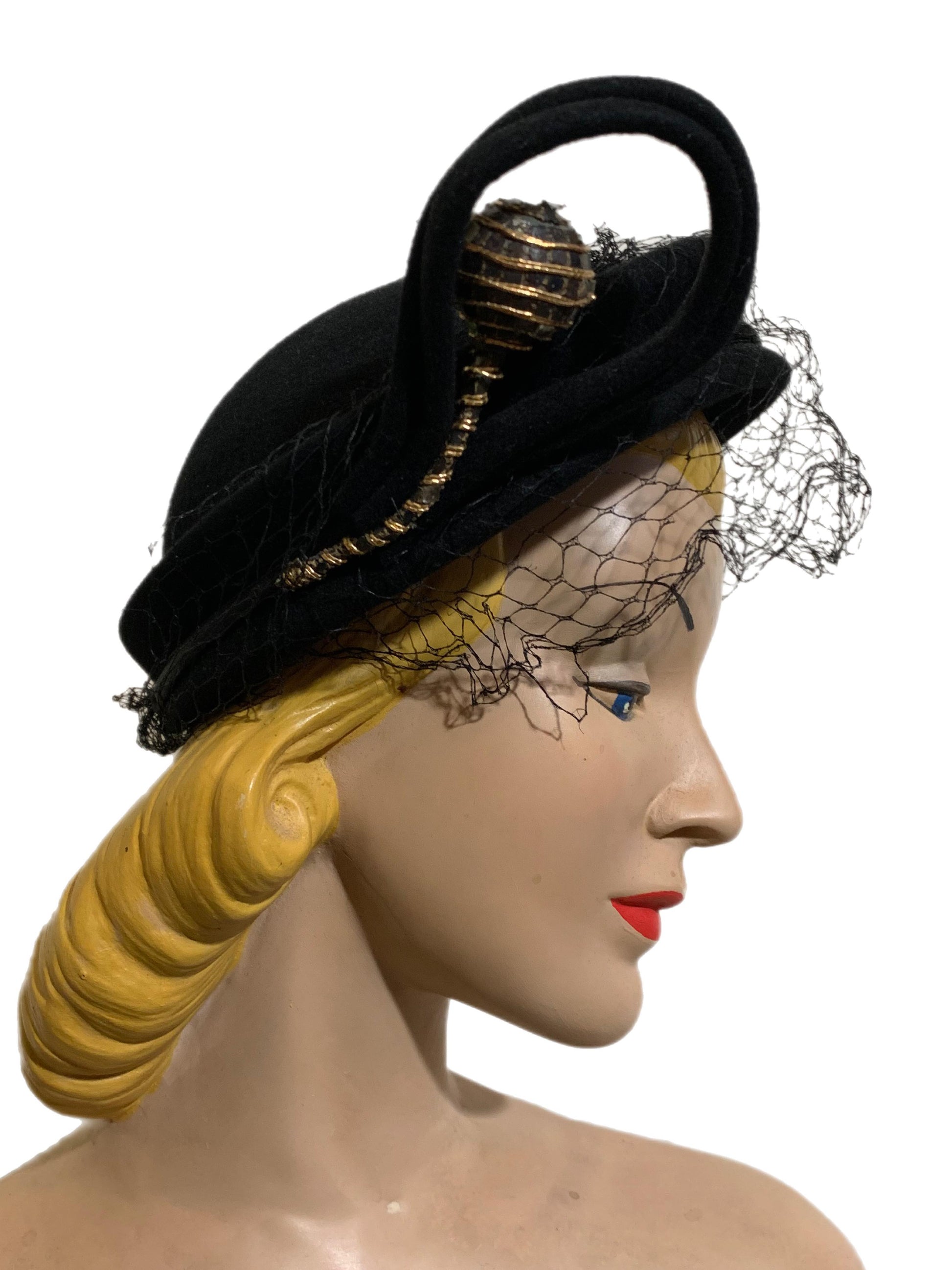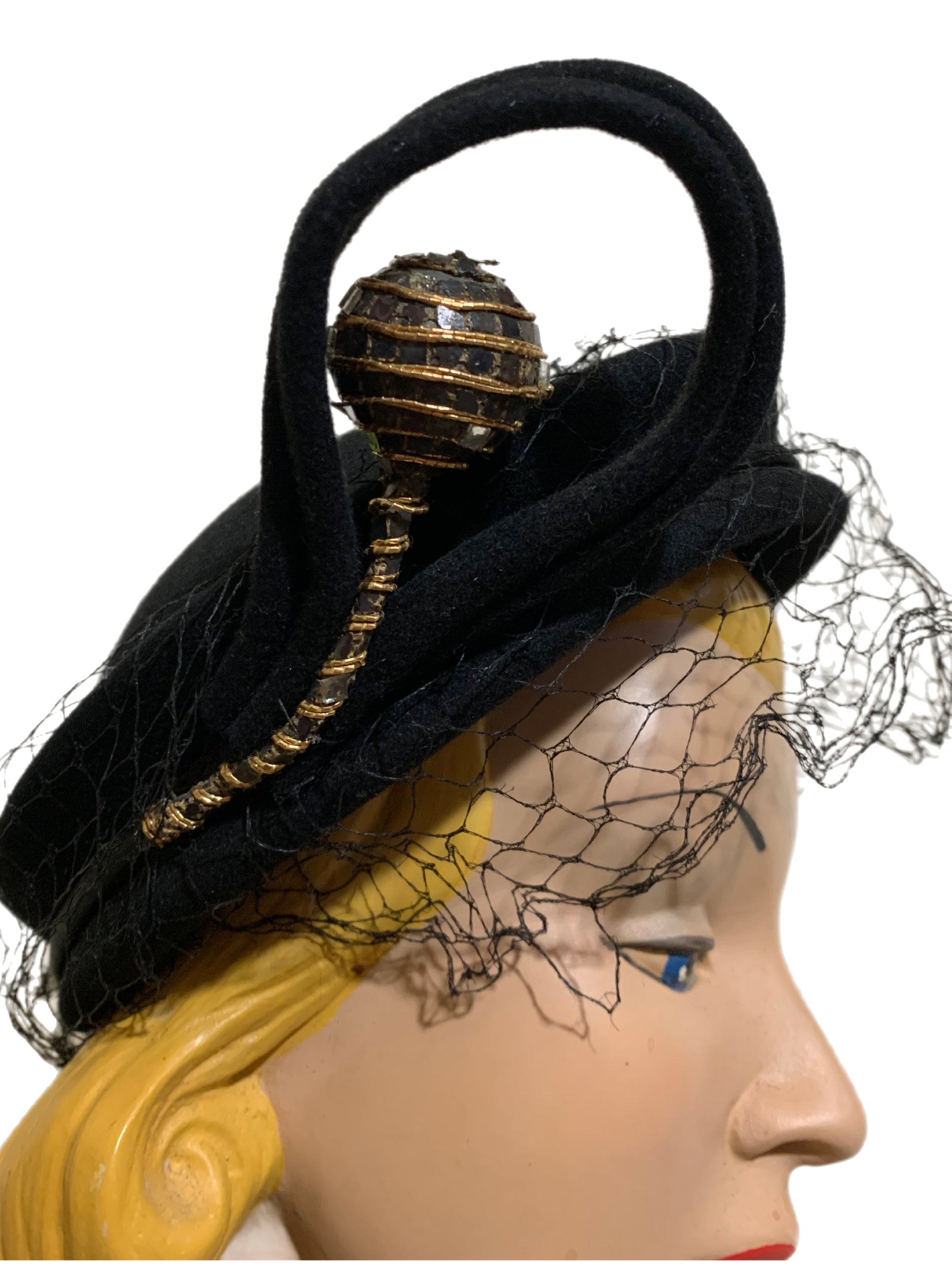 Incredible 1930s black felted wool asymmetrical angled hat with veil, swirled curlique and gold metallic trimmed ball accent on stem Veil has a little damage. Size 22 1/2.  Really unusual!