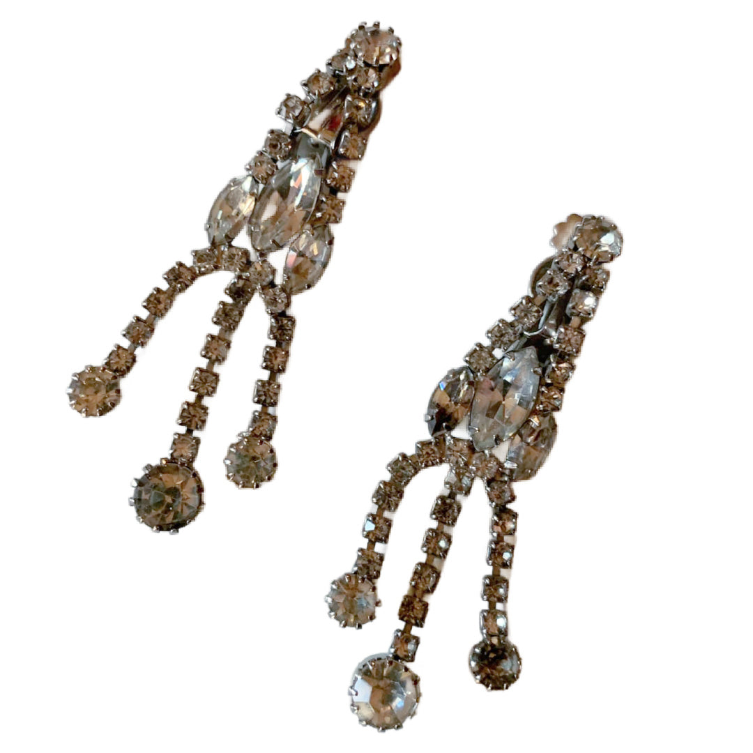 Glamorous Clear Rhinestone Dangle Clip Earrings circa 1960s
