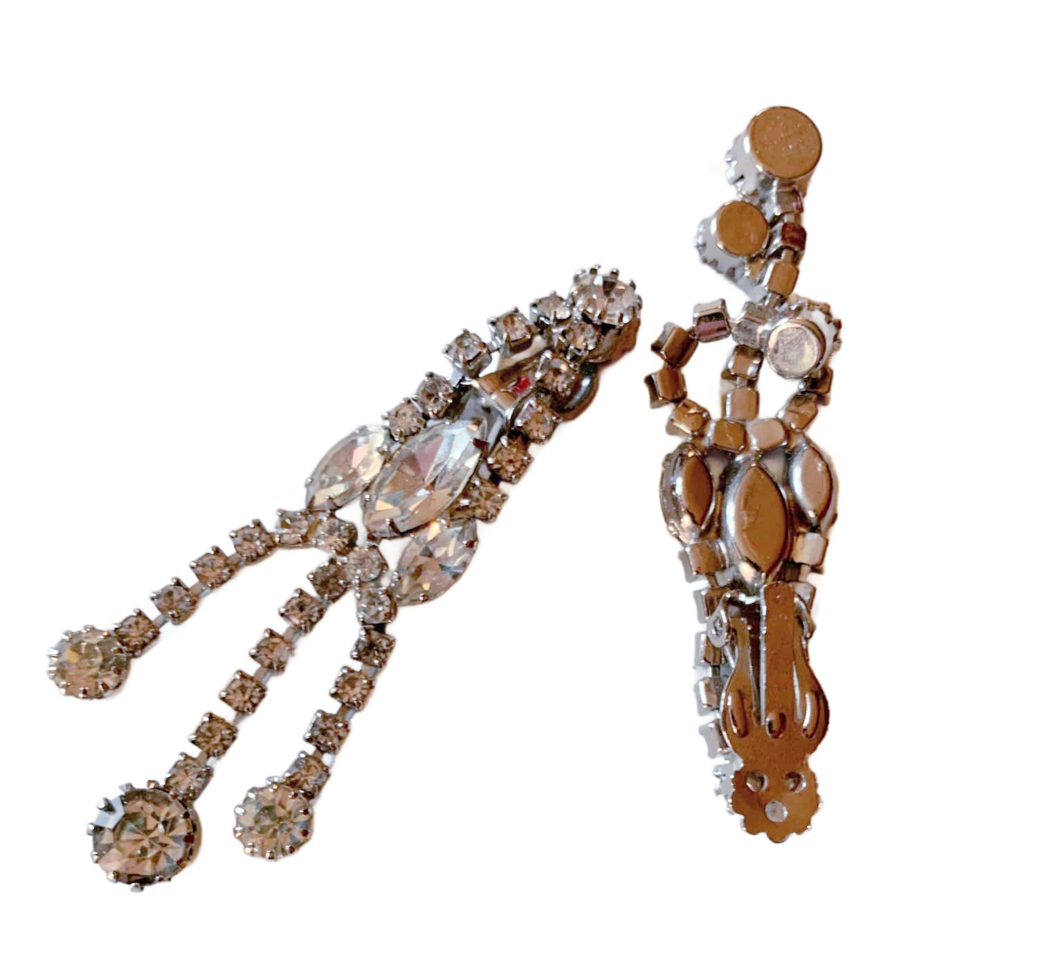 1960s clear rhinestone dangle earrings set in silver tone metal, clip style. 3" long! A couple darkened stones. No markings.