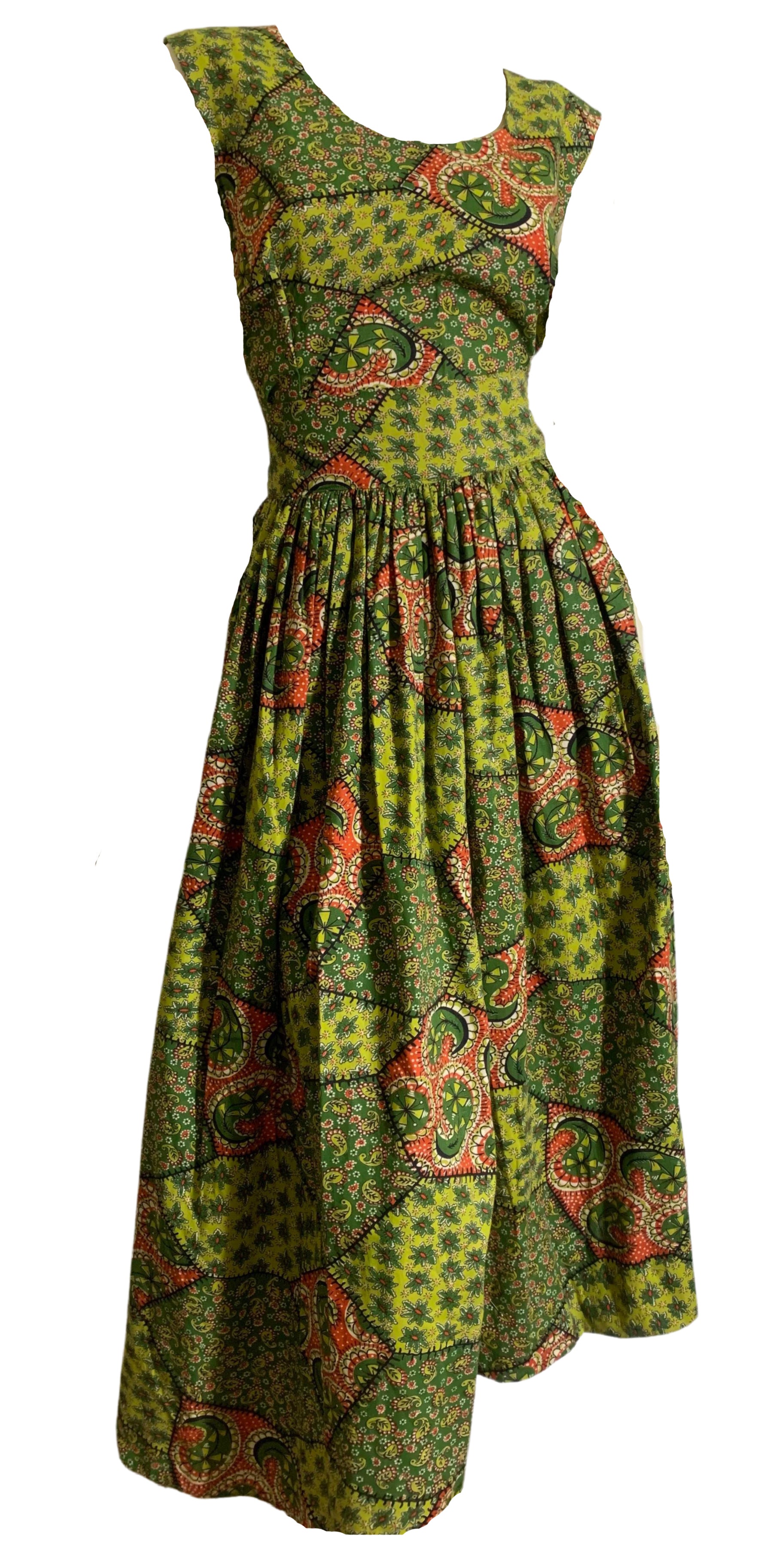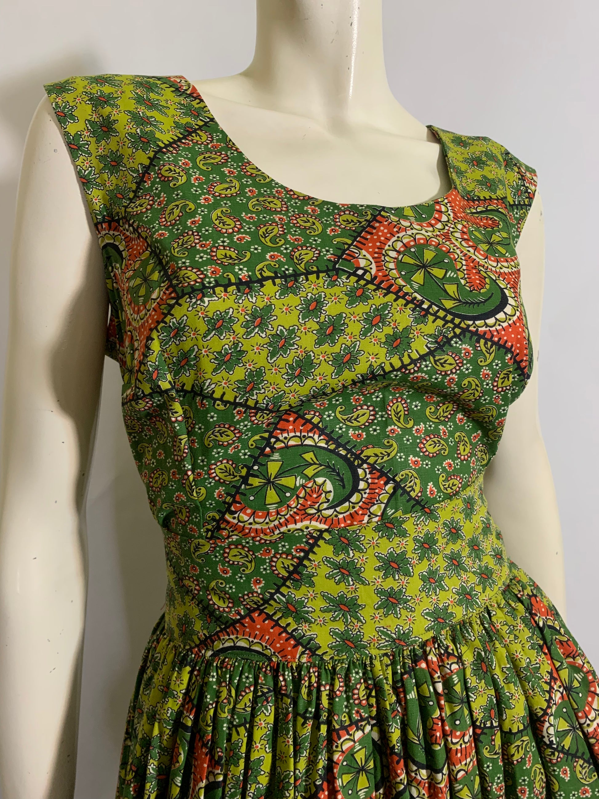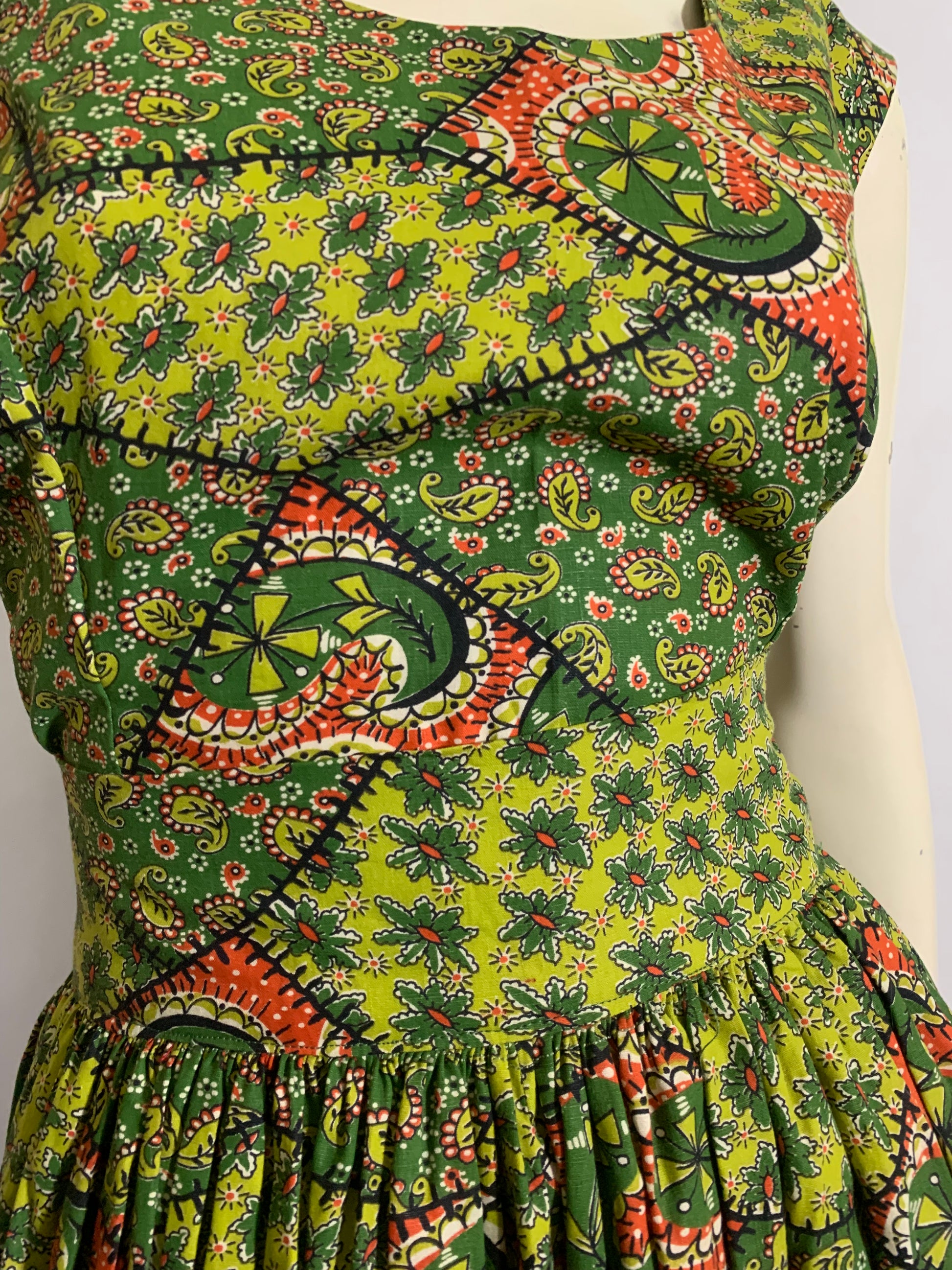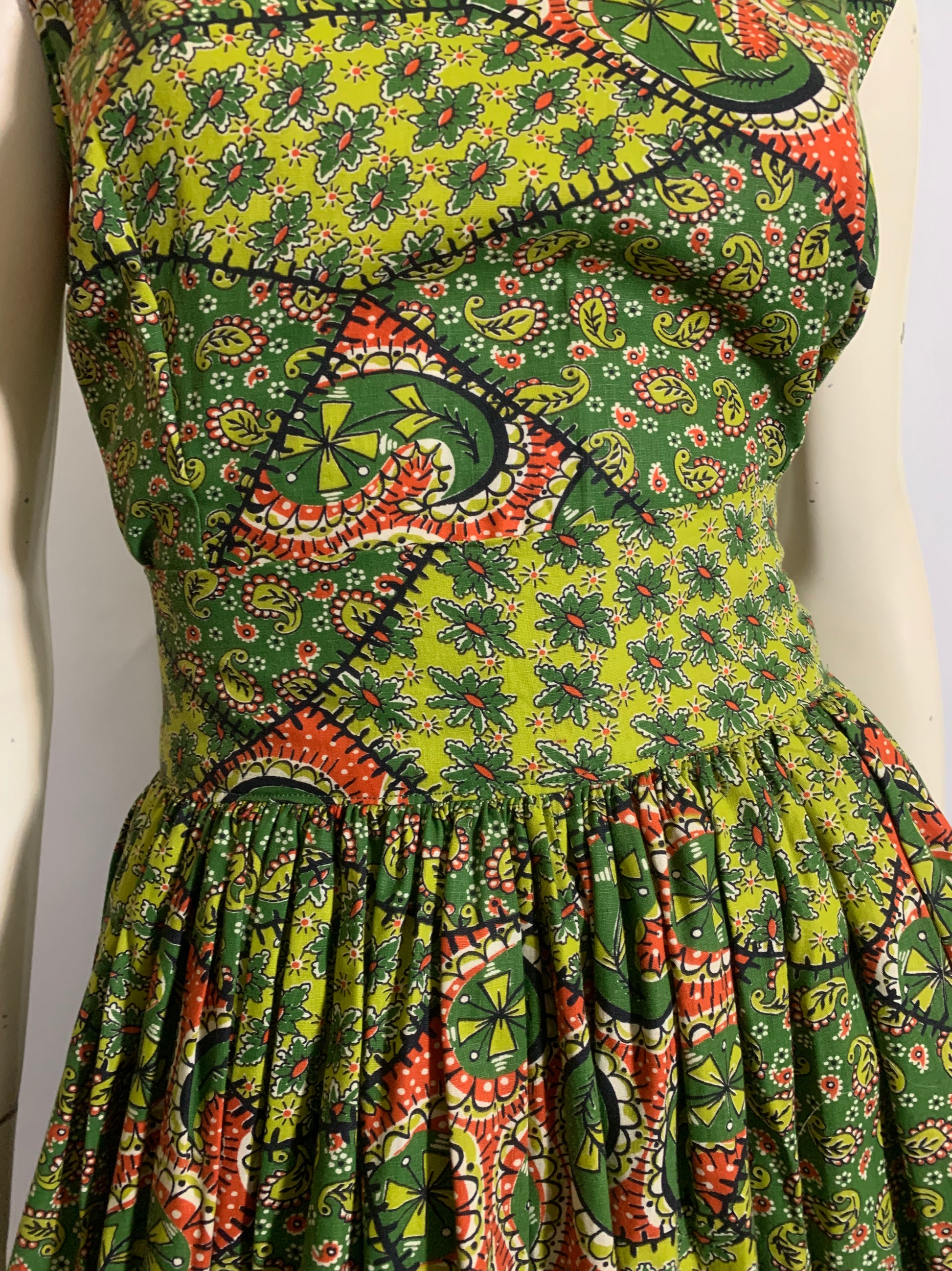 Green and Red Paisley and Patchwork Print Cotton Full Skirt 2 Pc Dress Set circa 1950s