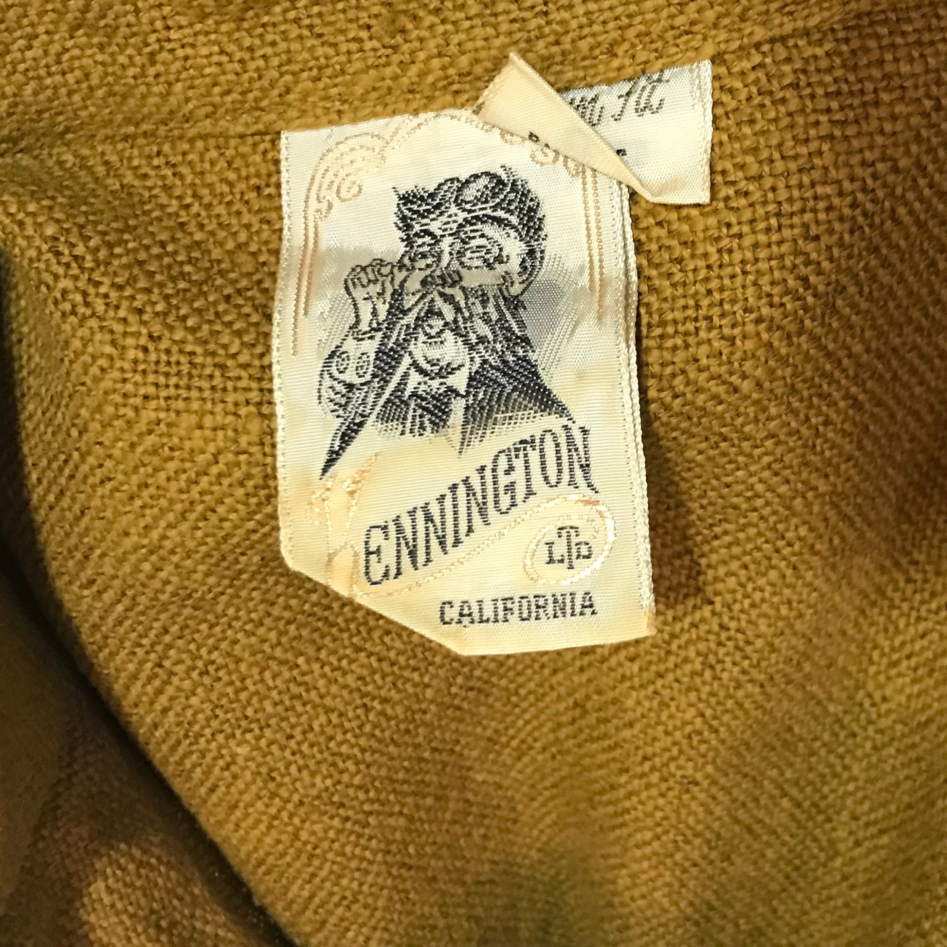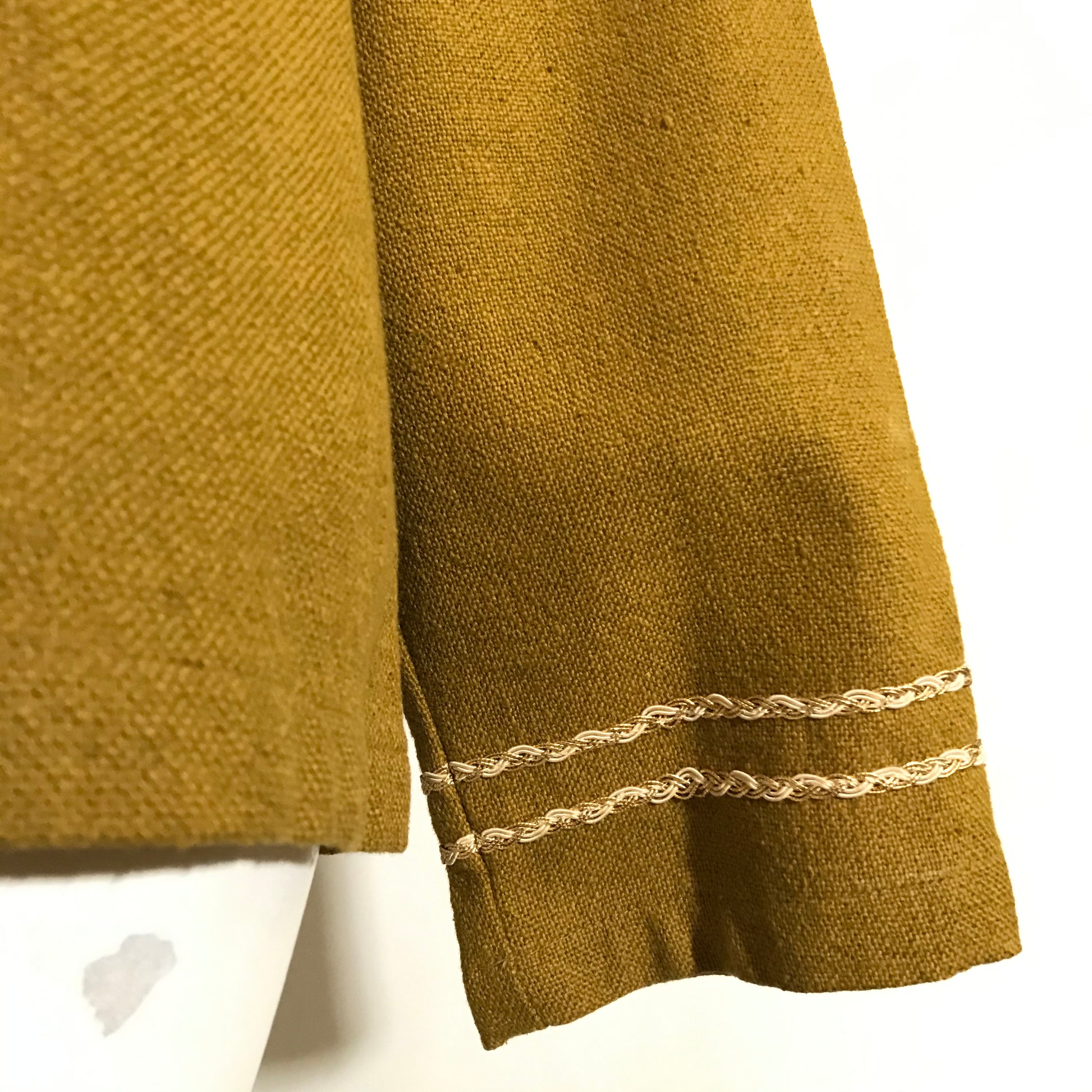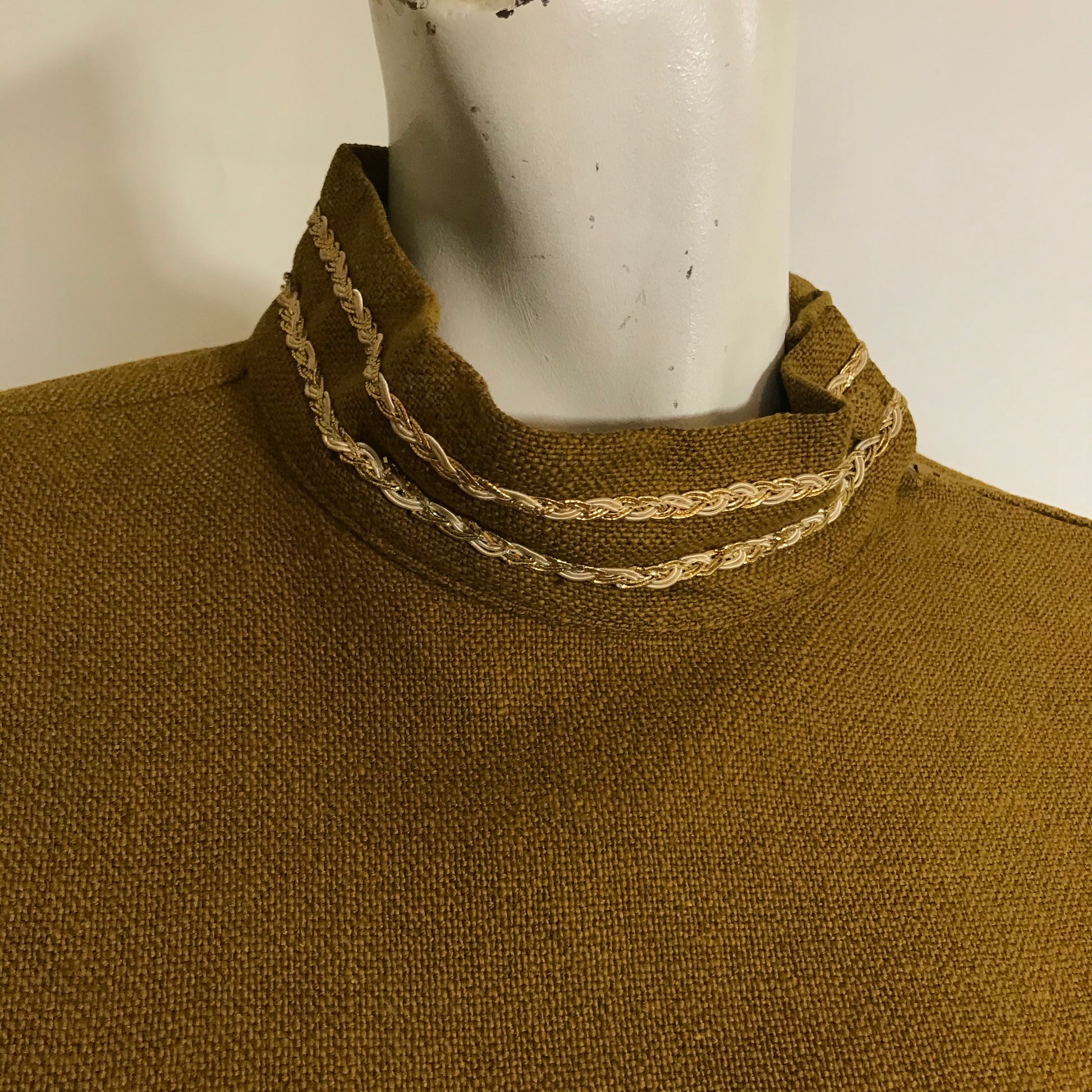 Kennington of California cinnamon hopsack cotton high neck tunic with metallic gold trim on wide cuffs and collar, button on side of collar and zipper on top of shoulder. No flaws.