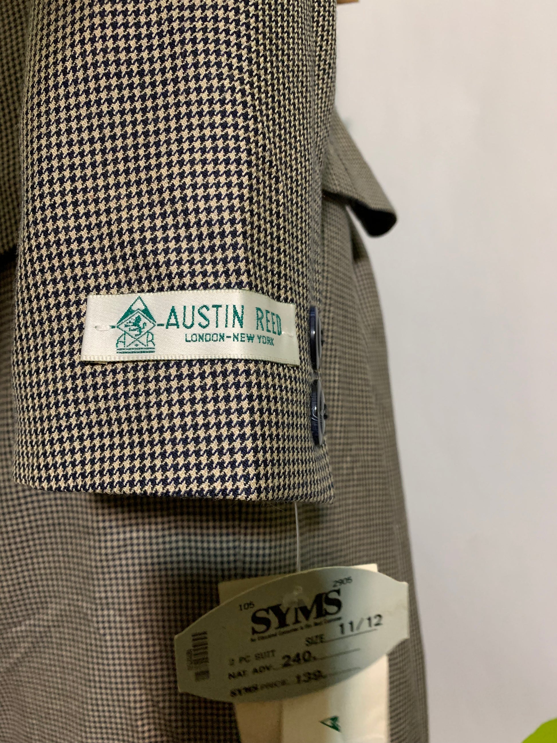1940s inspired 1980s wool houndstooth suit with long, lean pencil skirt that has buttons up back slit. One loop and button closes waist, another button inside jacket secures- padded shoulders, lined. I can absolutely see this on Elaine Benis with little white socks and penny loafers! From the British store Austin Reed.