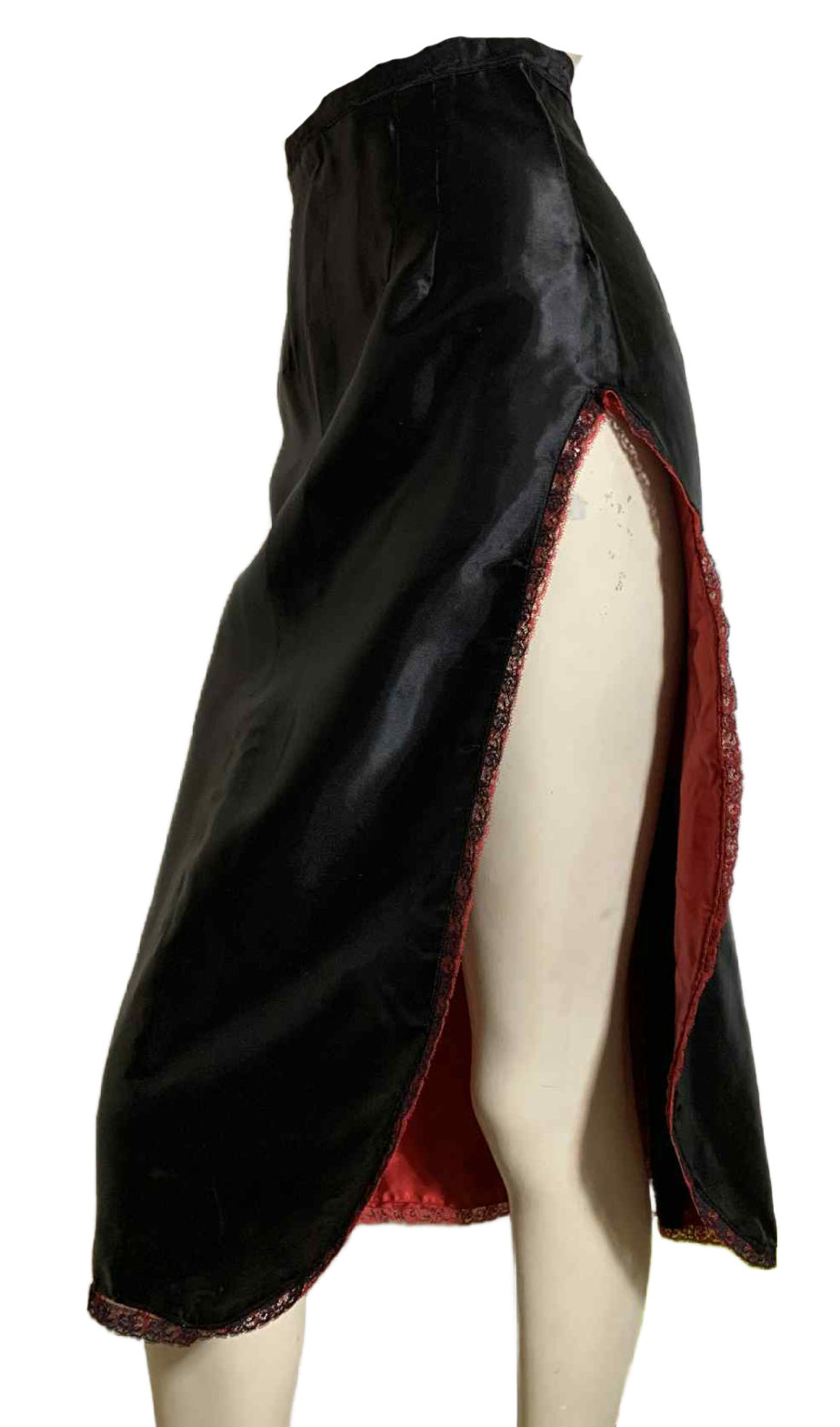 Extremely rare lates 40s to early 50s black satin burlesque or dance skirt with VERY risque side slit- fully lined in red satin, edged in red and black lace. Metal zip and hook/eye in back center. Likely hand made for stage wear. No label, flawless.