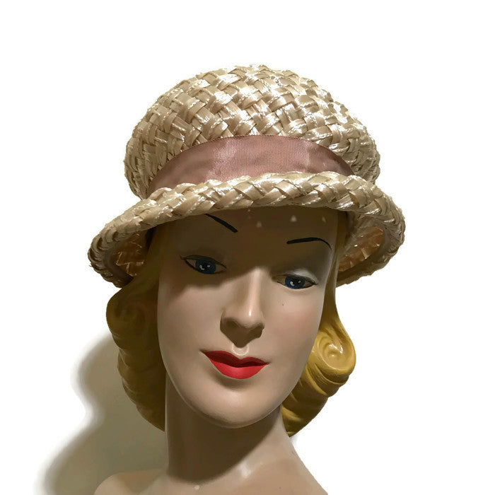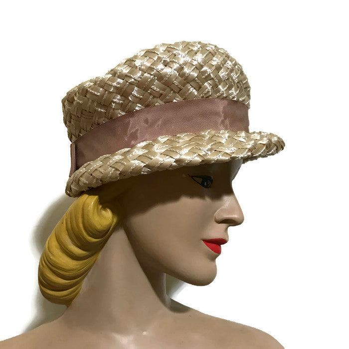 1960s ivory cello braided crusher hat with tan grosgrain ribbon band. Flat bow in back. Size 22, no label, no flaws.