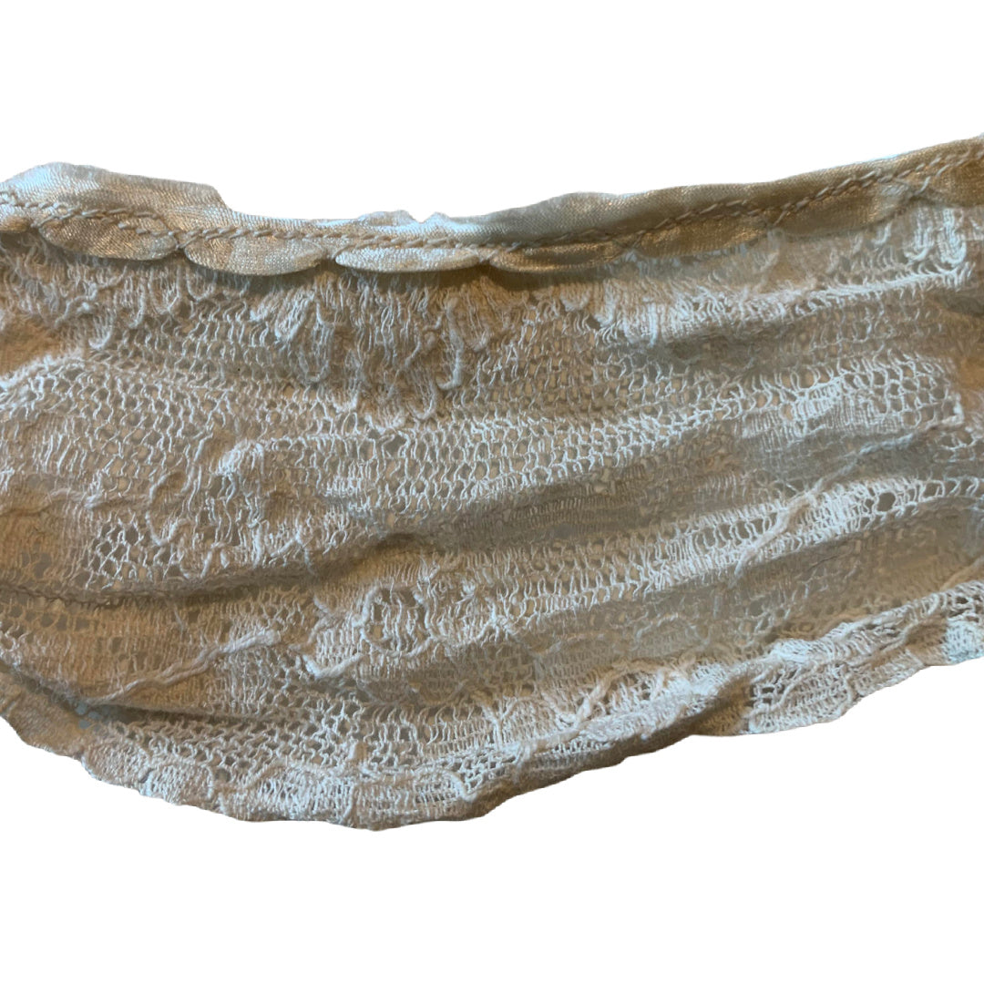50" long 2 1/2" wide ivory floral lace with silk along top. No flaws.