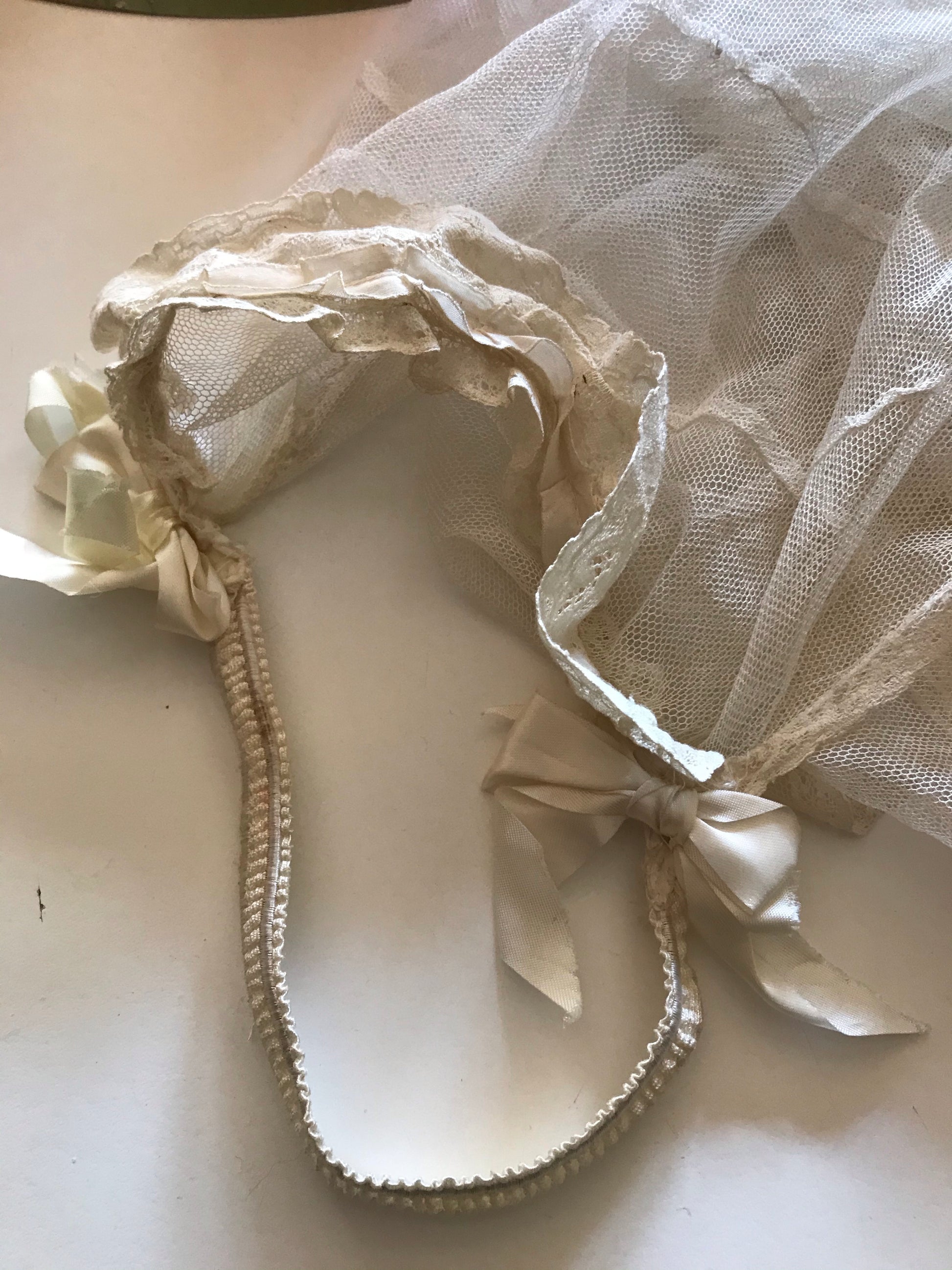 Late teens to early 1920s soft ivory lace and mesh bridal headpiece. Elastic band around head, 2 bows at sides- veil around the rest. Band is 20-24" around, veil is 29" long. No flaws.