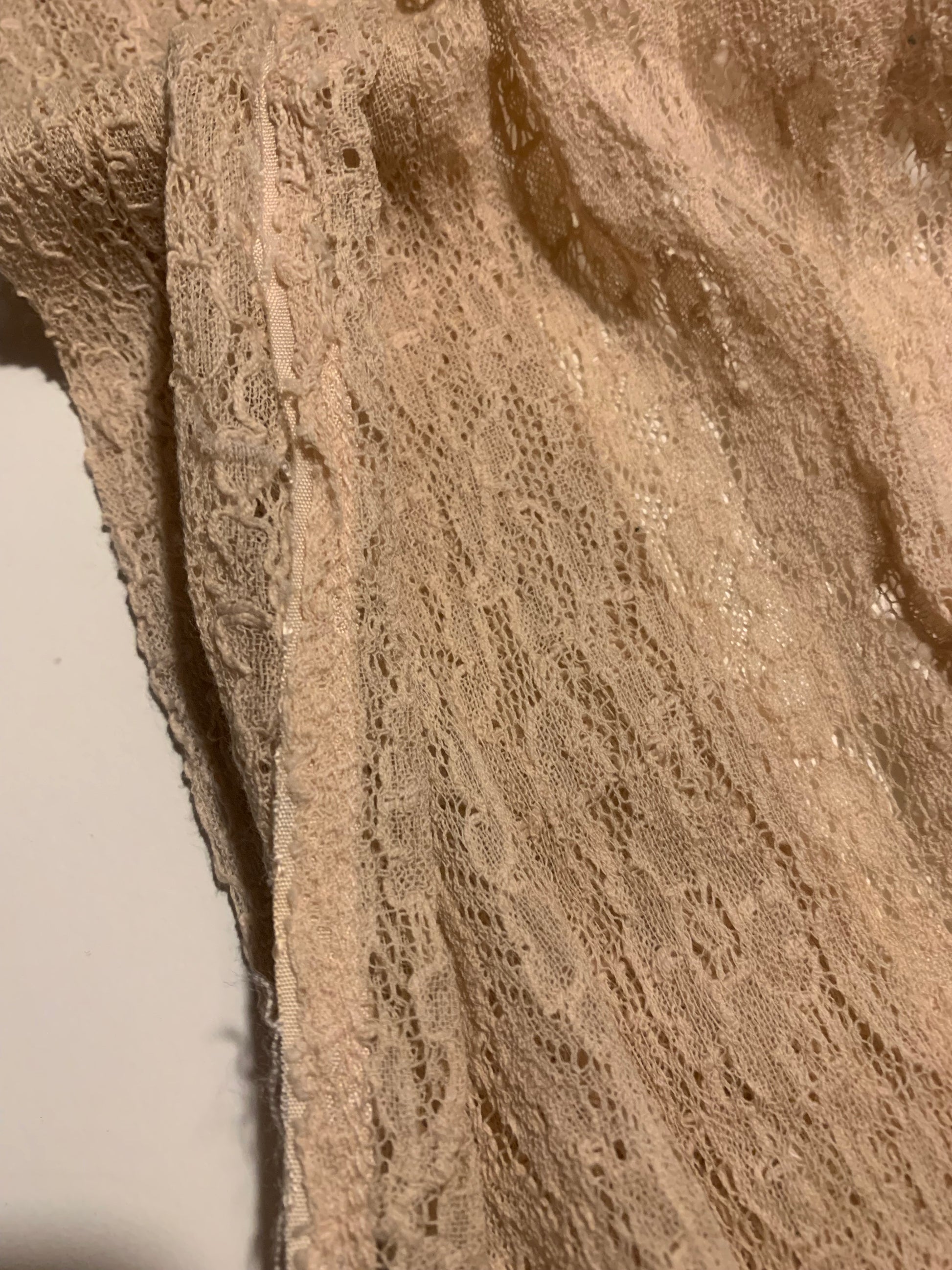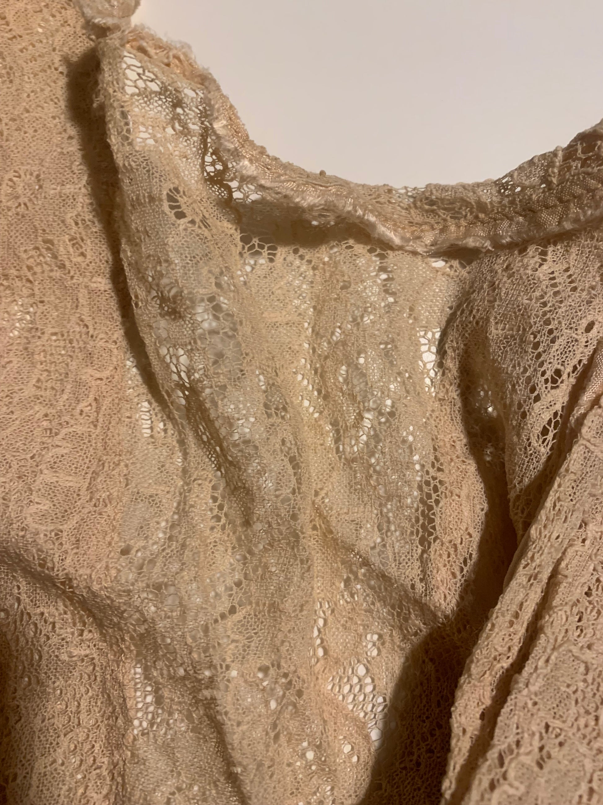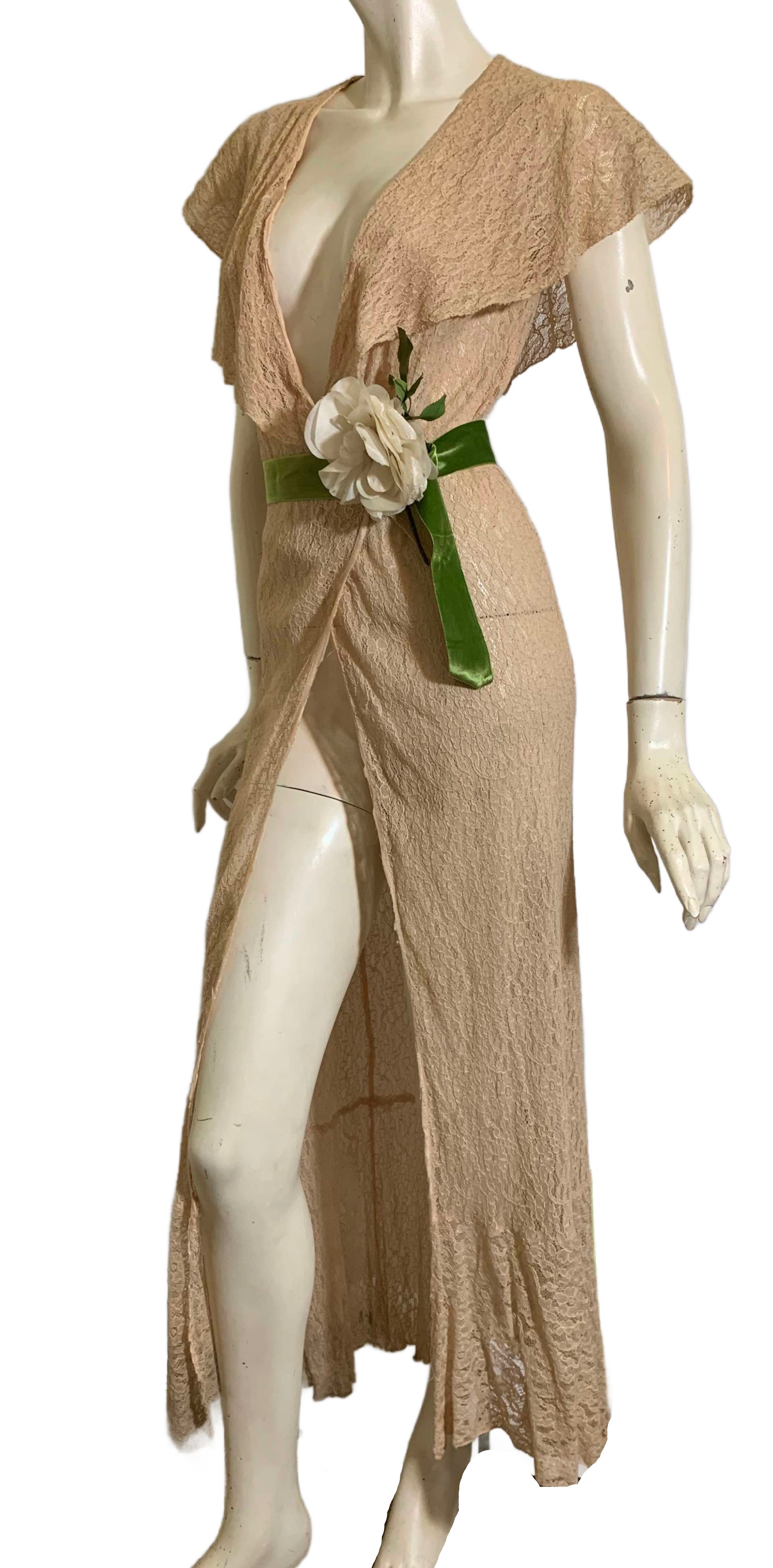 1930s sheer lace peignoir wrapper/robe with elegant caped collar, deco design in back. Had a lining that was falling apart so I have taken it out. Snaps shut. I added a velvet ribbon sash in lovely fern green with a flower pin.