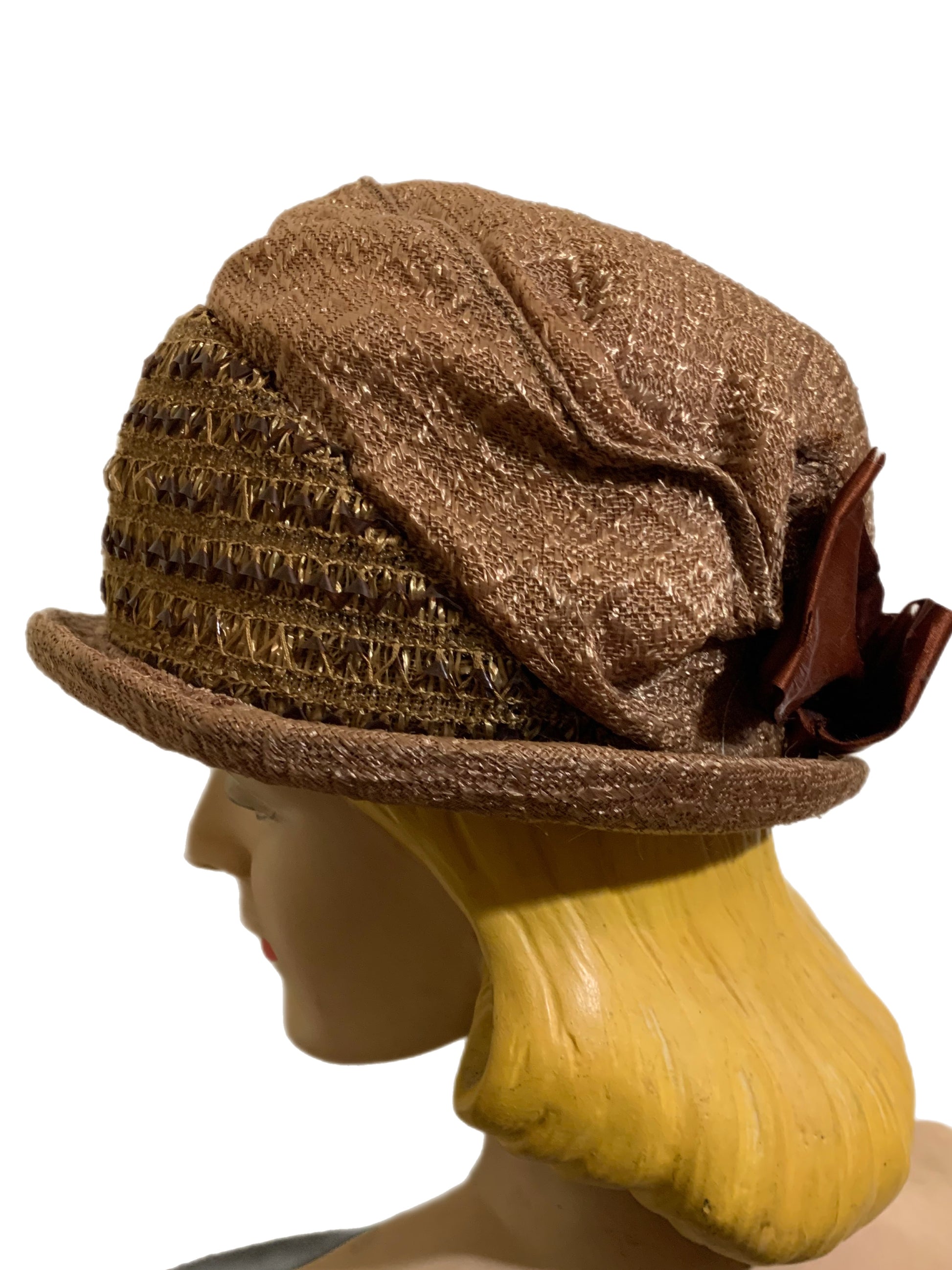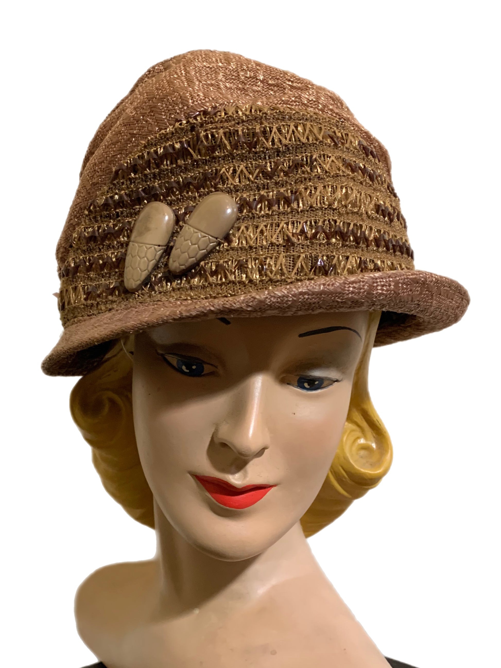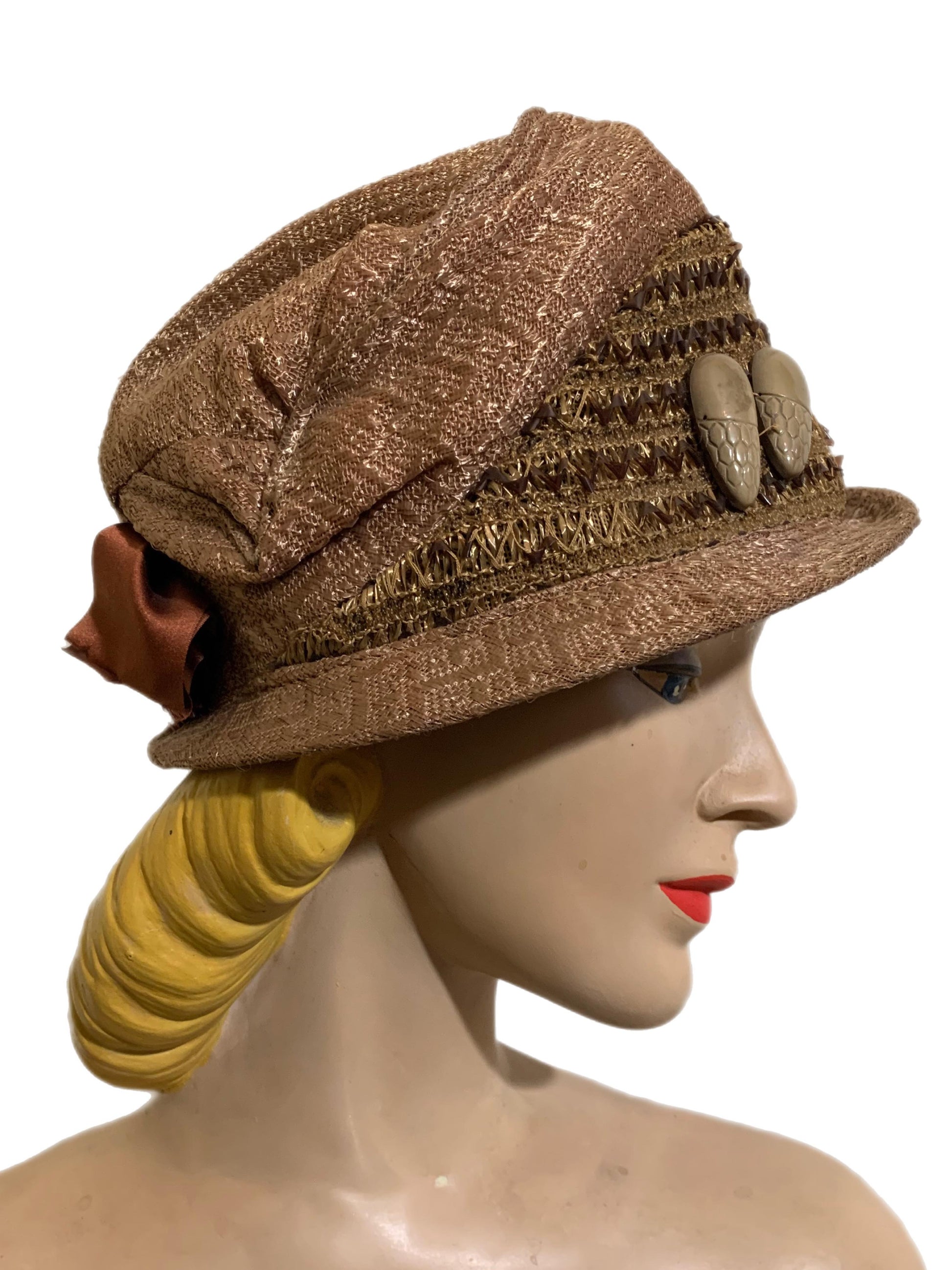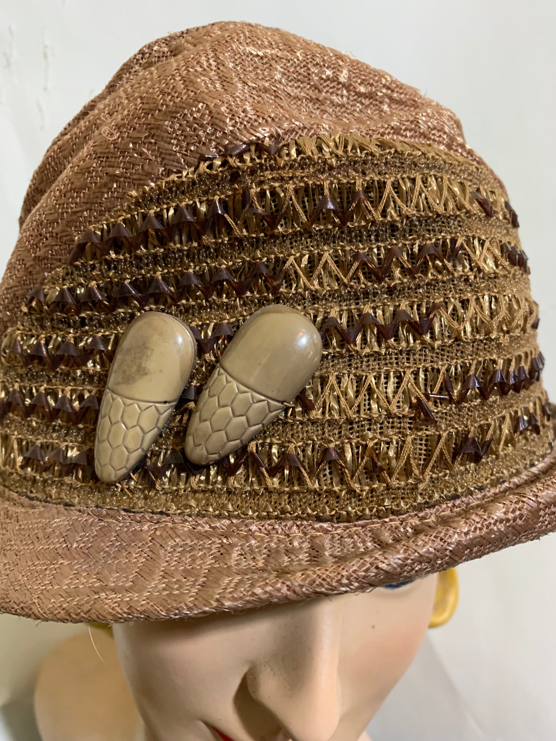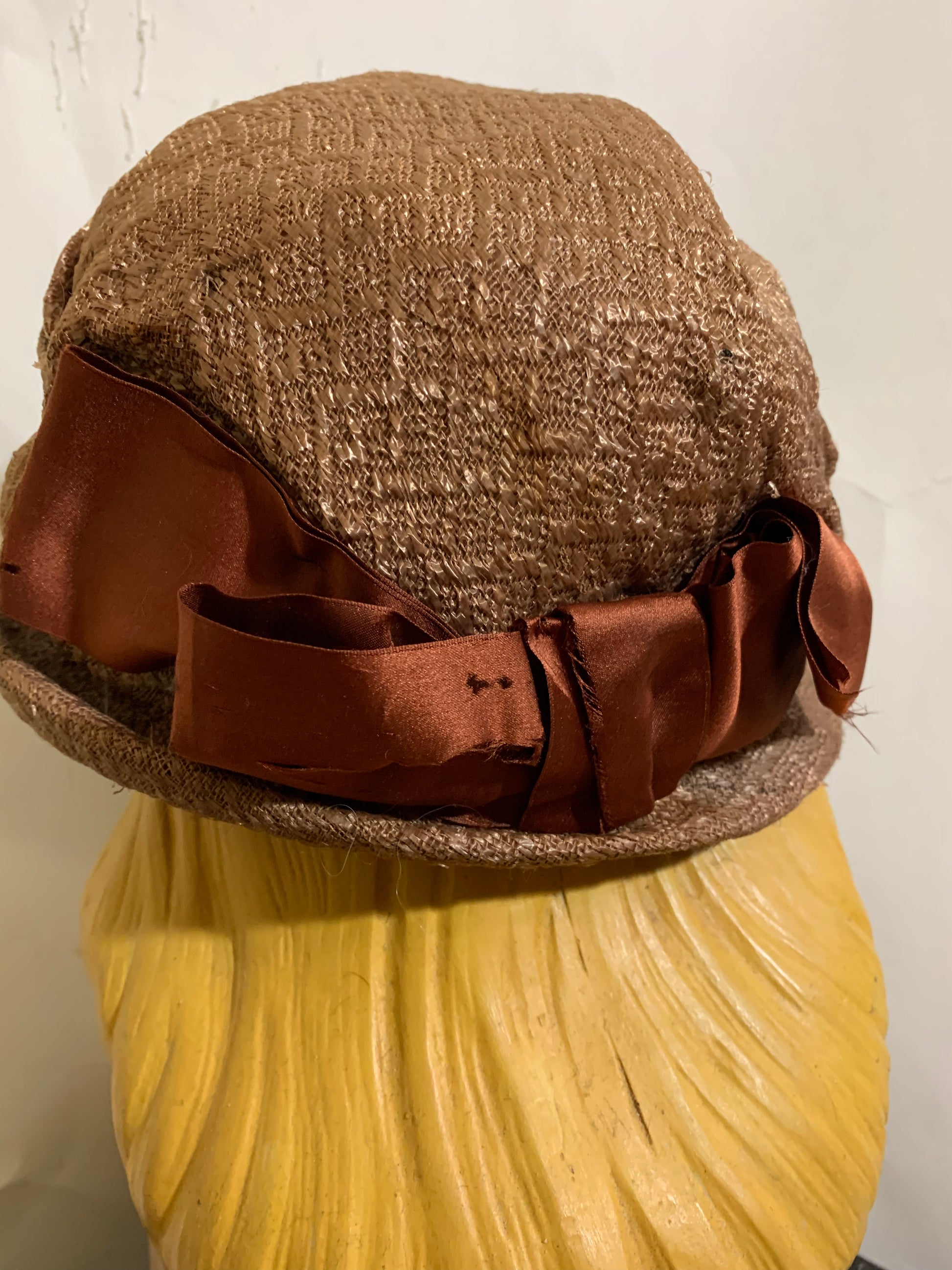 Late Teens/Early 20s Brown Ribbon and Carved Bakelite Trimmed Cloche Hat circa 1920s