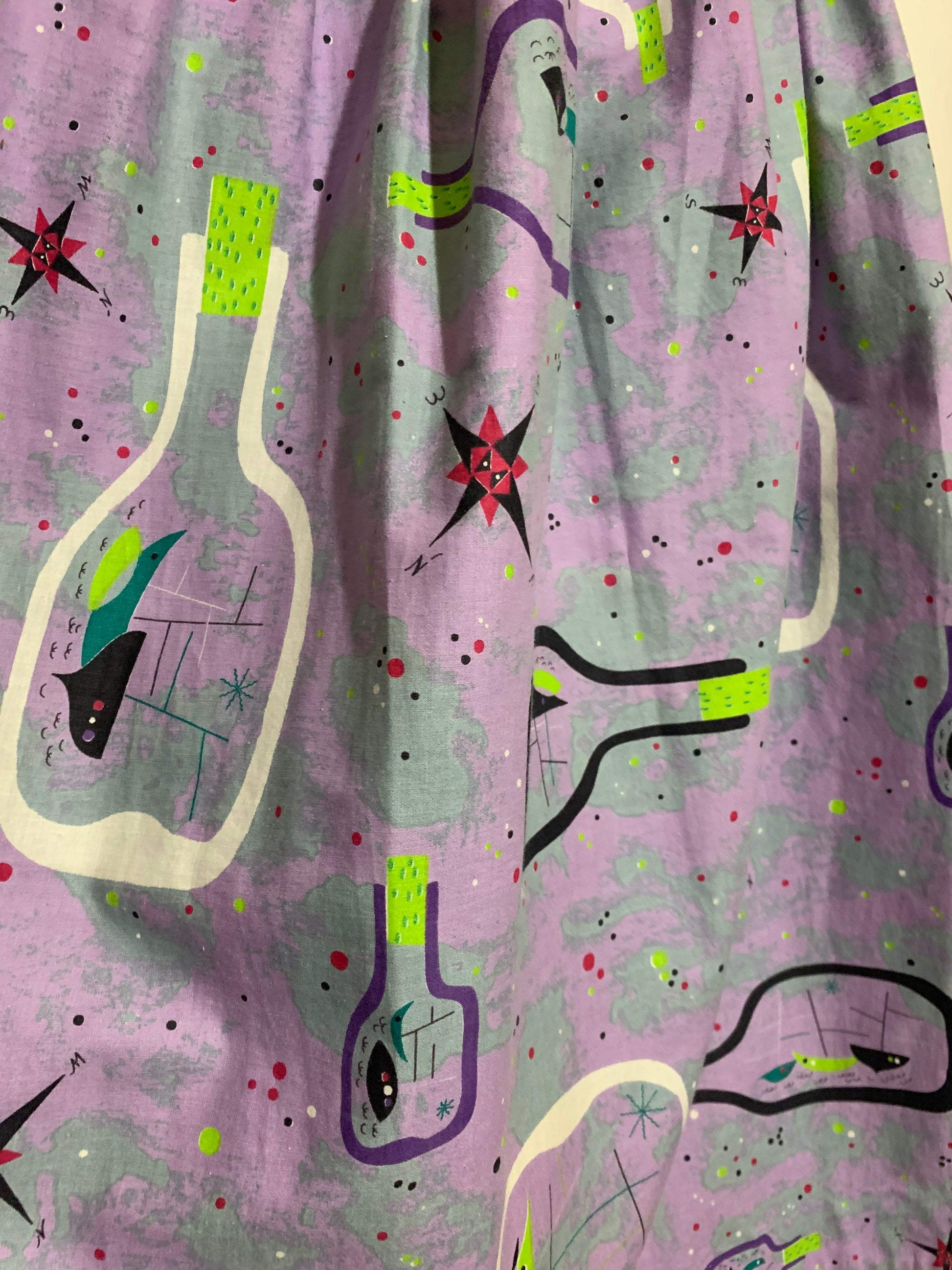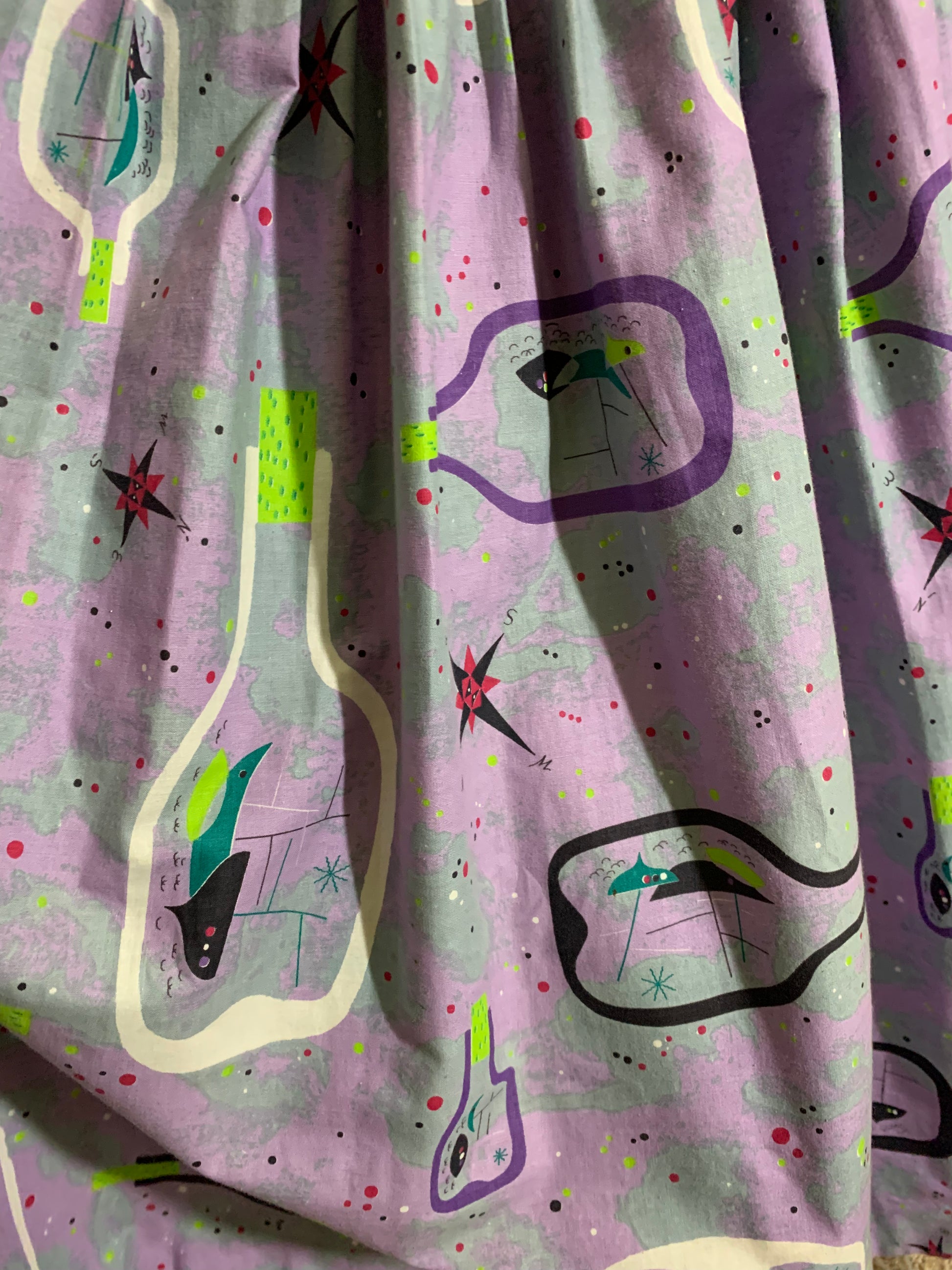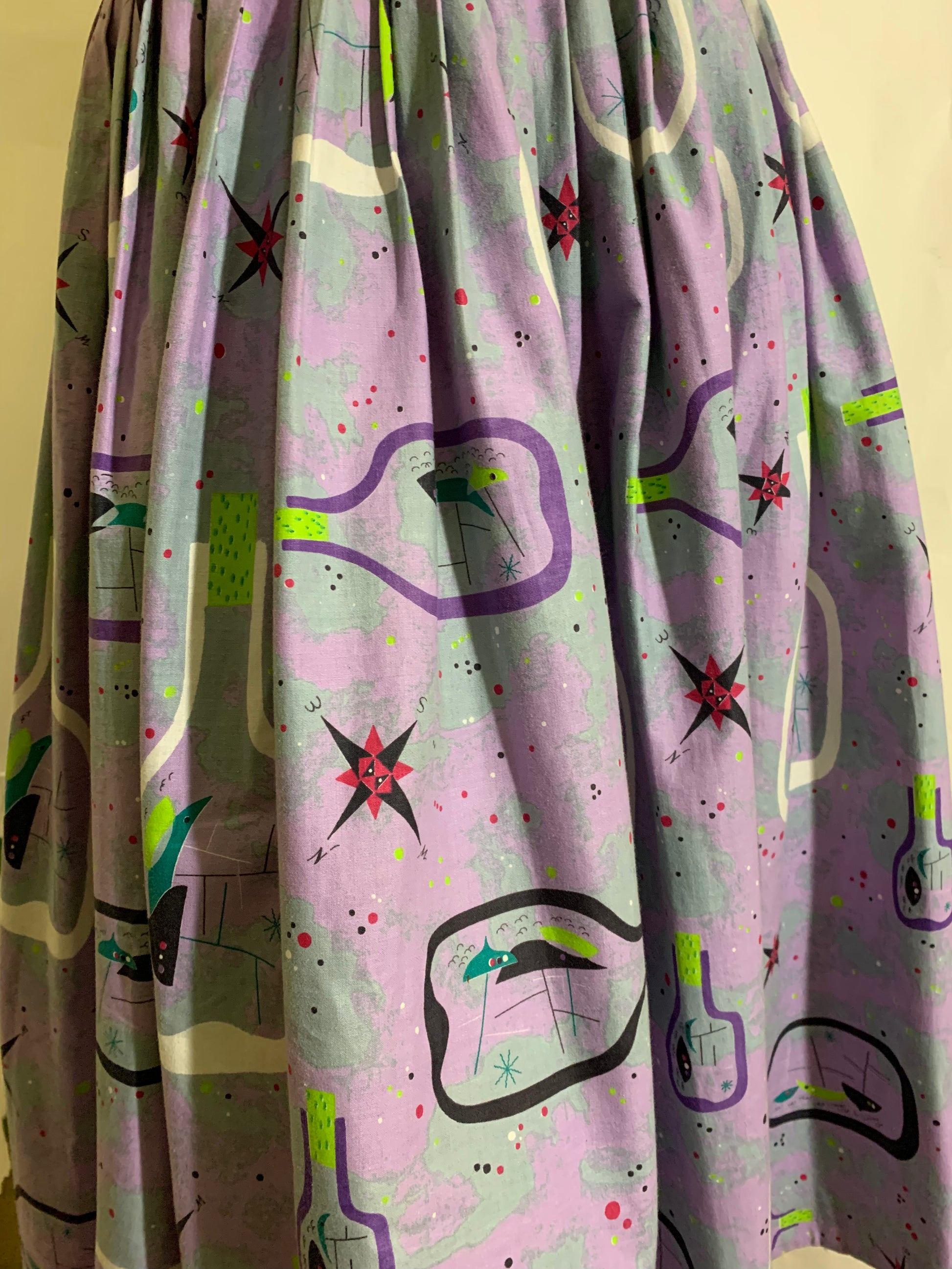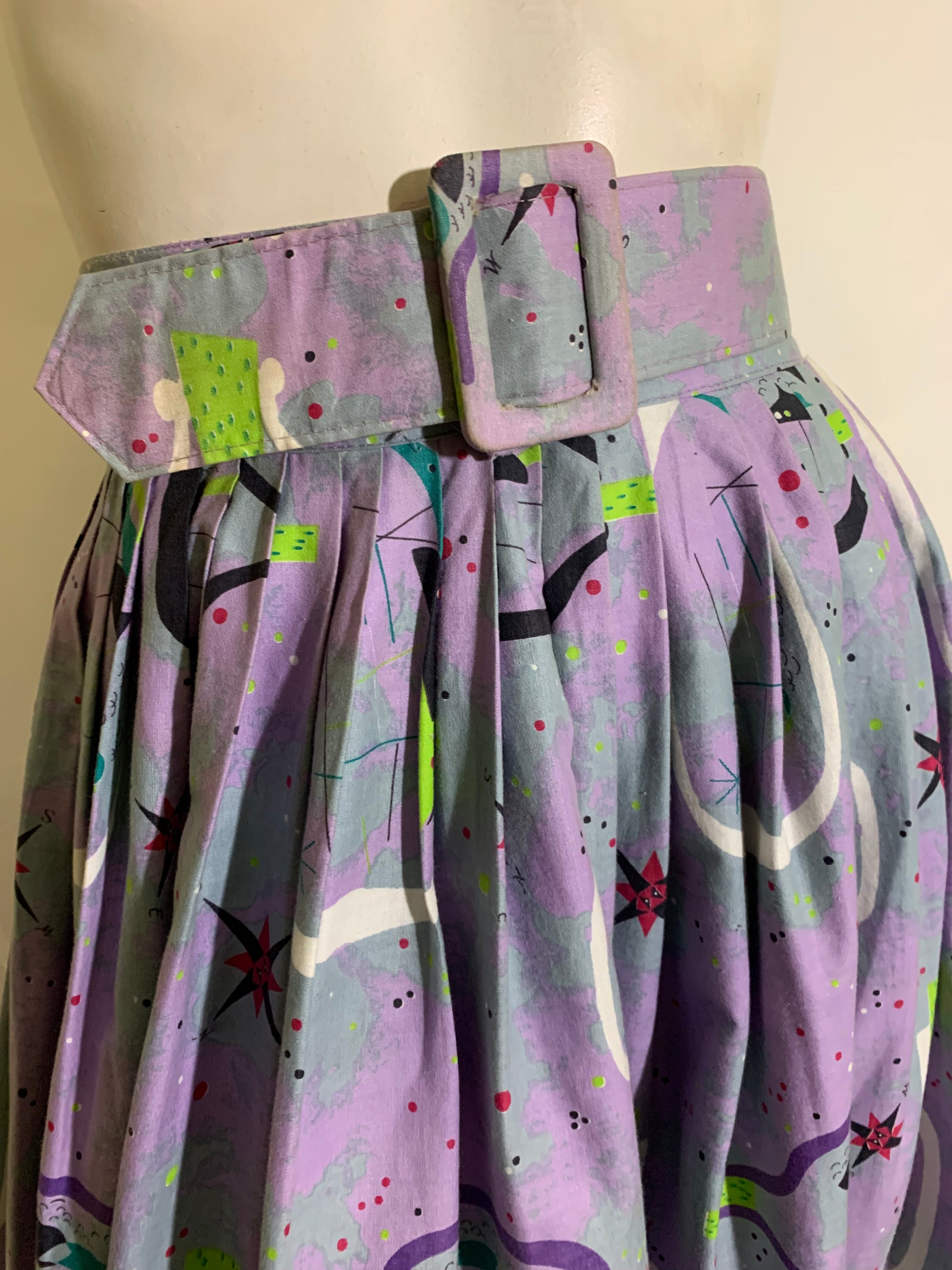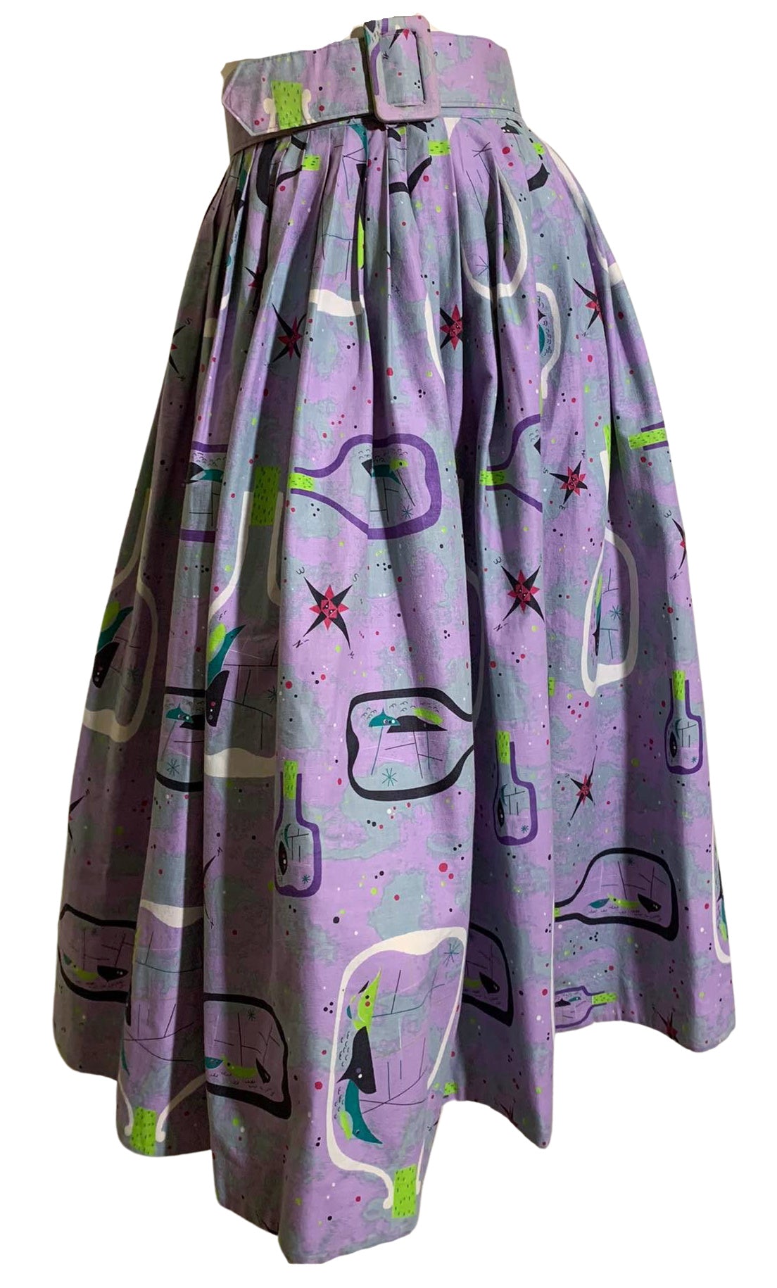 Fabulous 1950s lavender cotton super full skirt (not circle) with whimsical midcentury atomic print of amoebas, fish in bottles and more. Side metal zipper and button. No flaws.