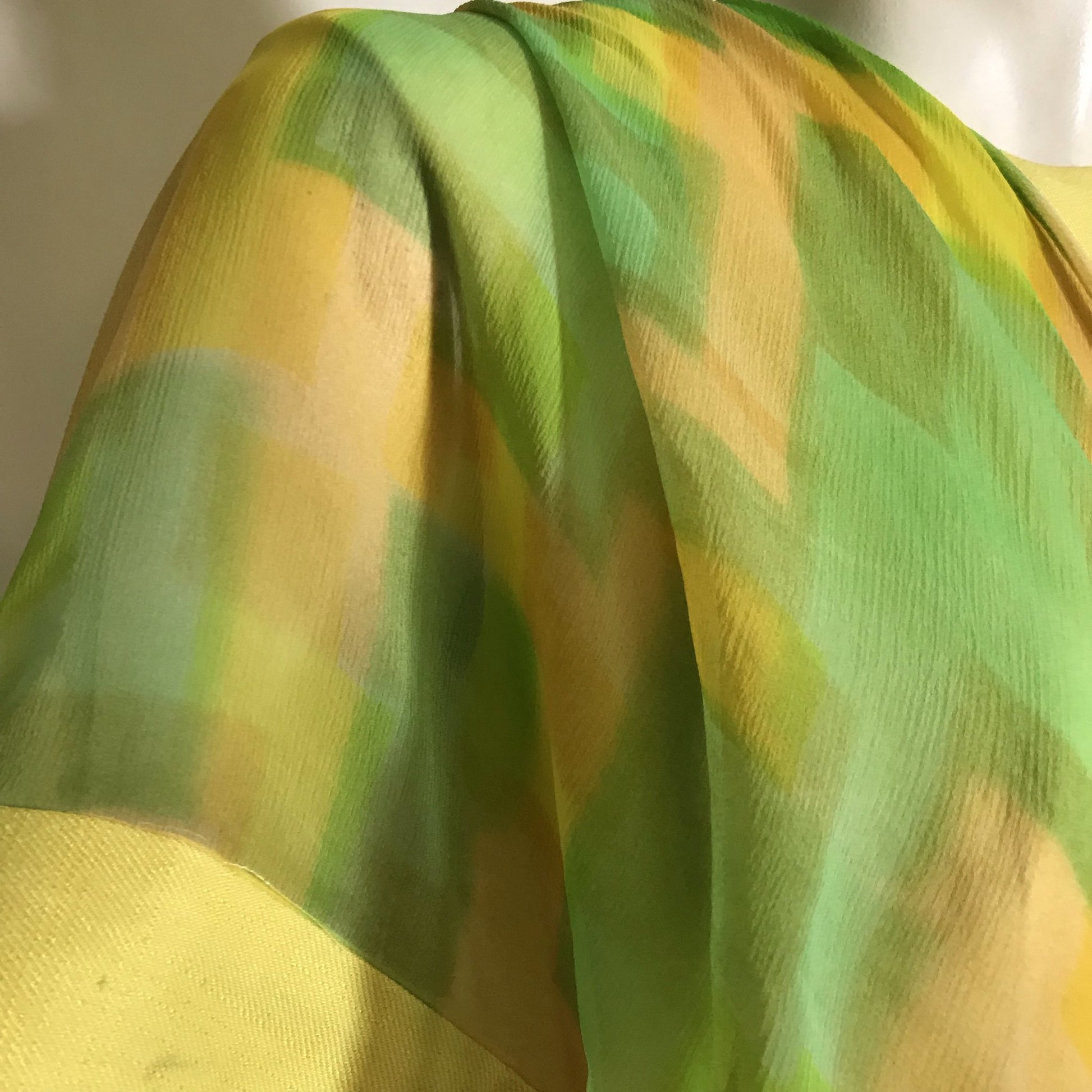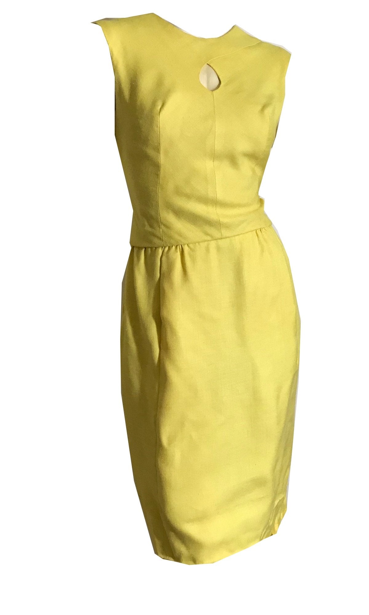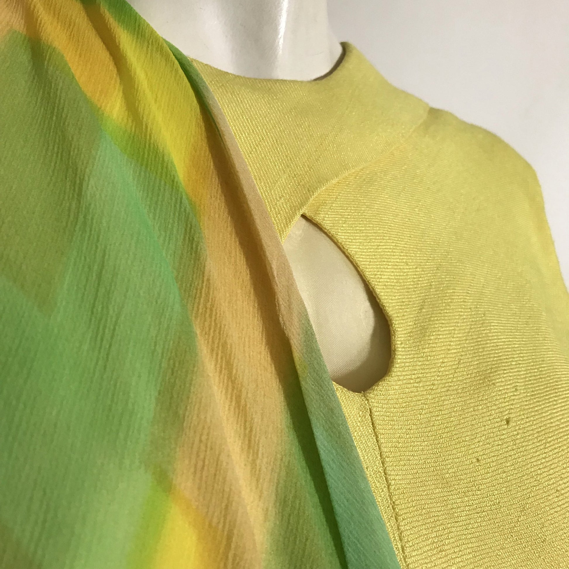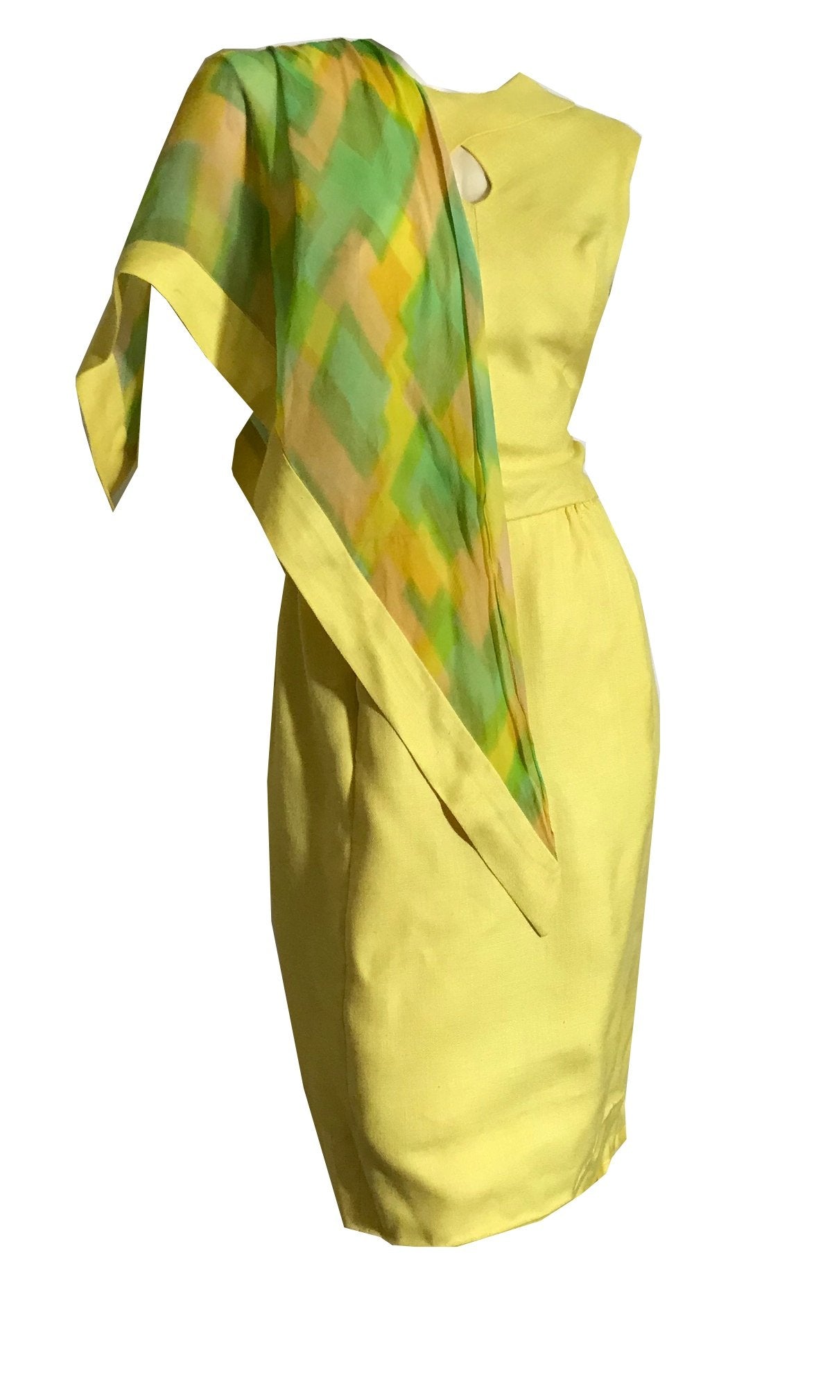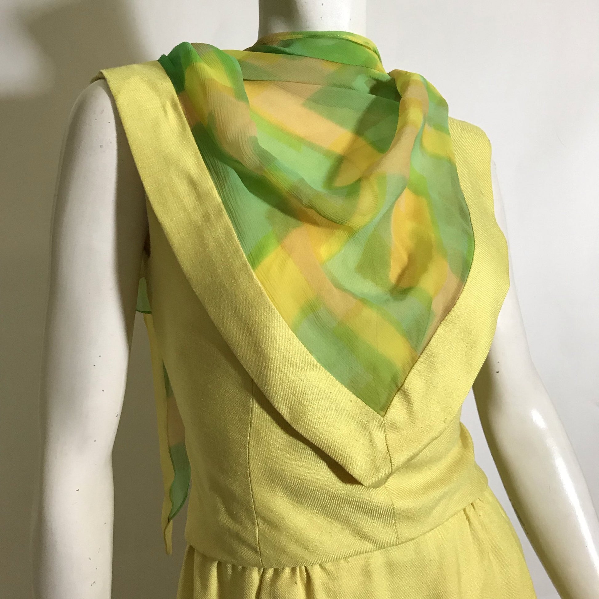 Lemon yellow linen weave rayon sleeveless sheath dress from the 1960s. Peek-a-boo neckline lined in silk chiffon- coordinating rayon edged triangle shaped wrap scarf in vivid chartreuse and lime. Metal zip up back, lined. No flaws.