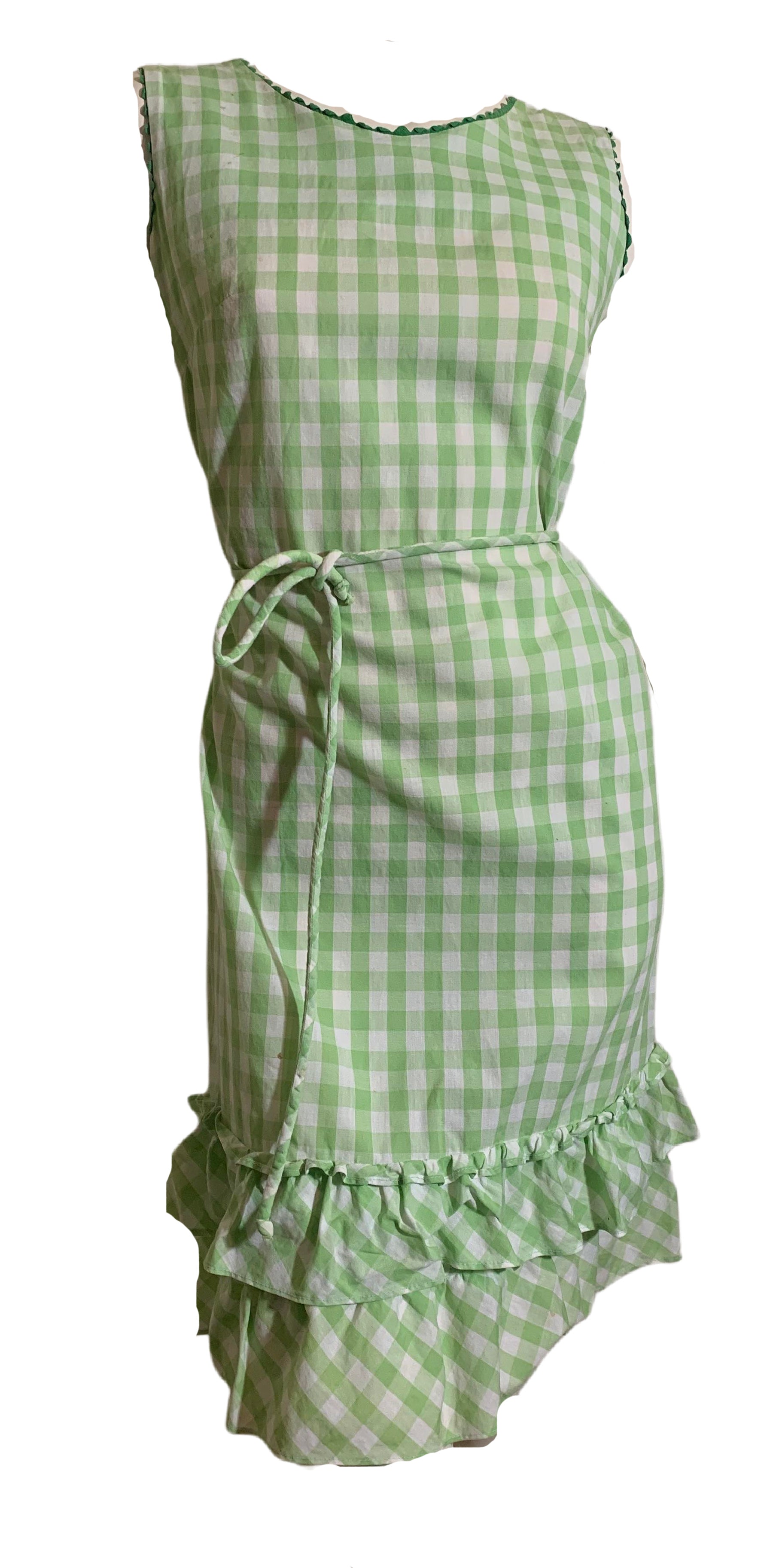 Lime green and white cotton gingham belted shift dress with ruffled hem. A few spots as shown. Back metal zip, no label.