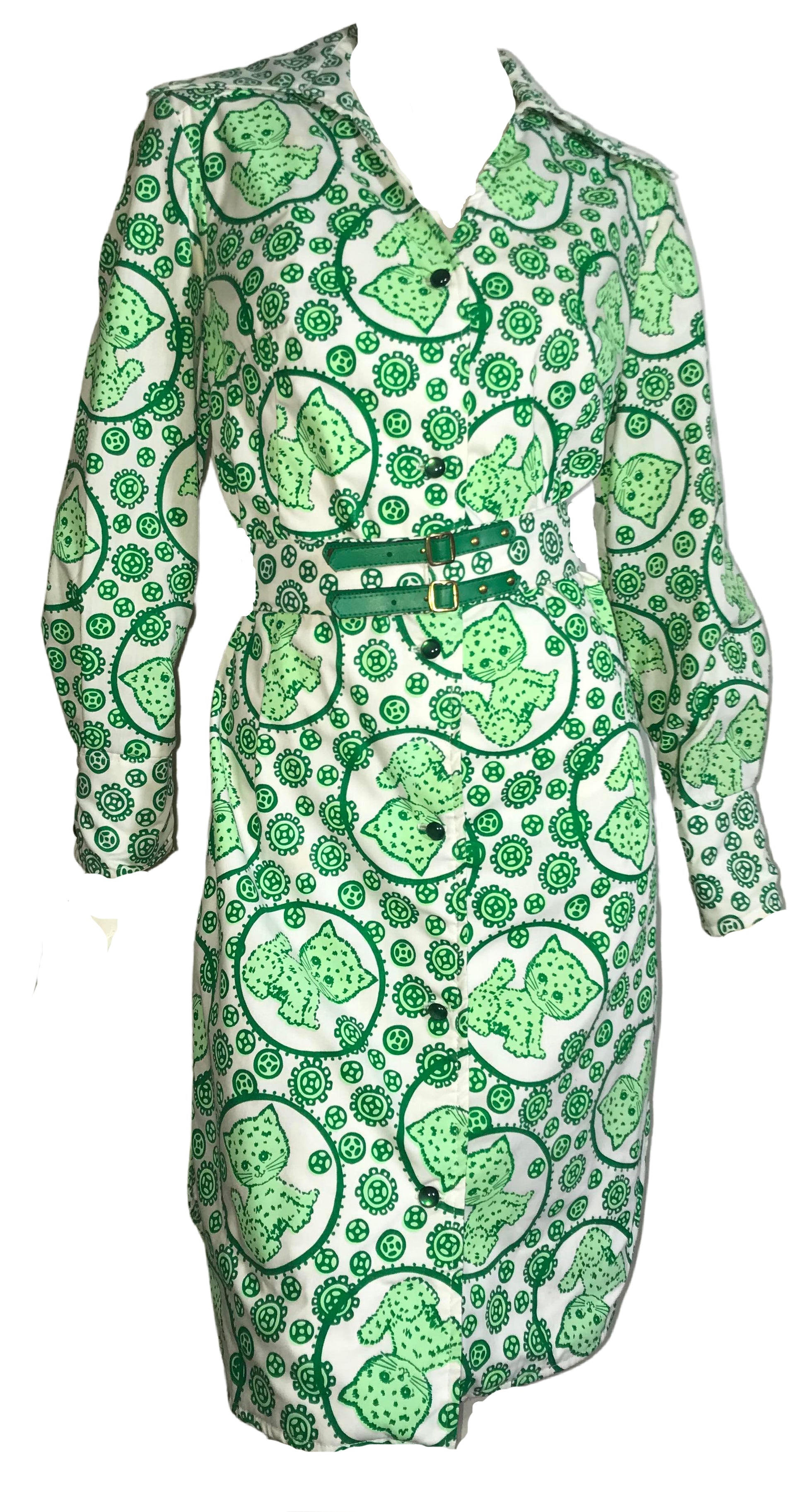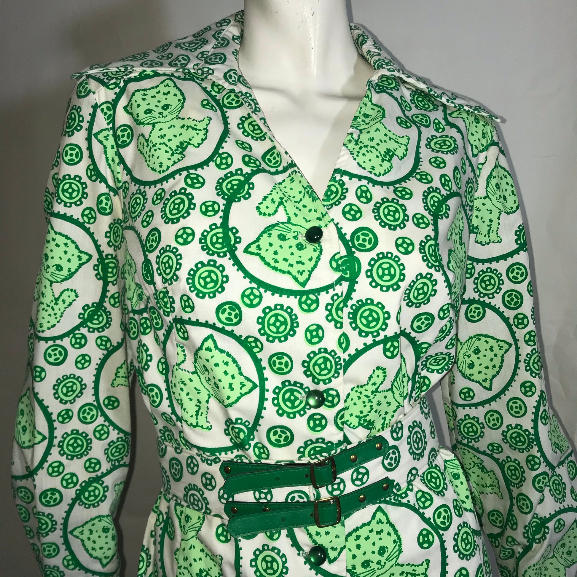 Lime Green Kitty Cat Novelty Print Shirt Dress with Belt circa 1960s