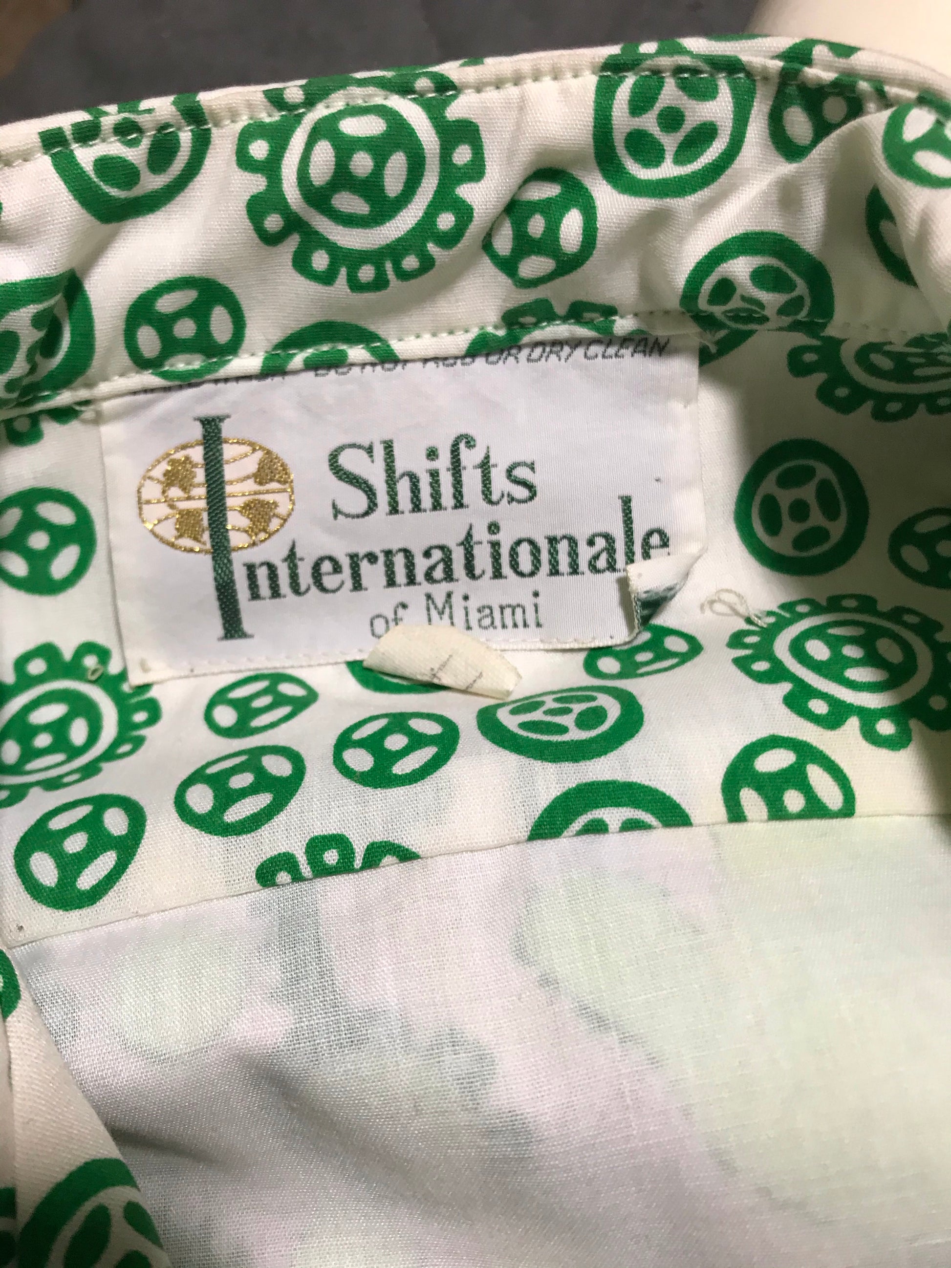 1960s crisp medium weight cotton button down shirt dress with whimsical lime green kitty cat novelty print. So CUTE!! Matching belt with green vinyl double buckle in front, green domed buttons on front and 2 at each cuff. Unlined. By Shifts Internationale, flawless condition.