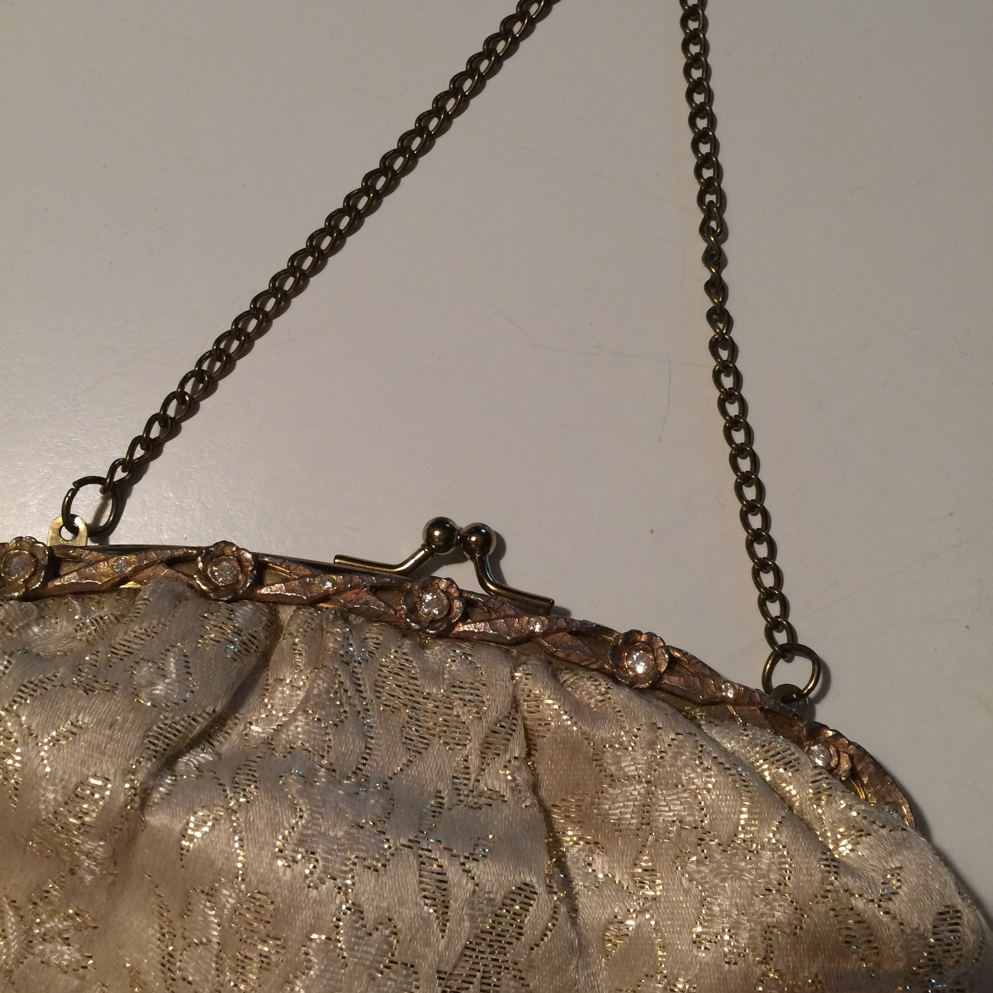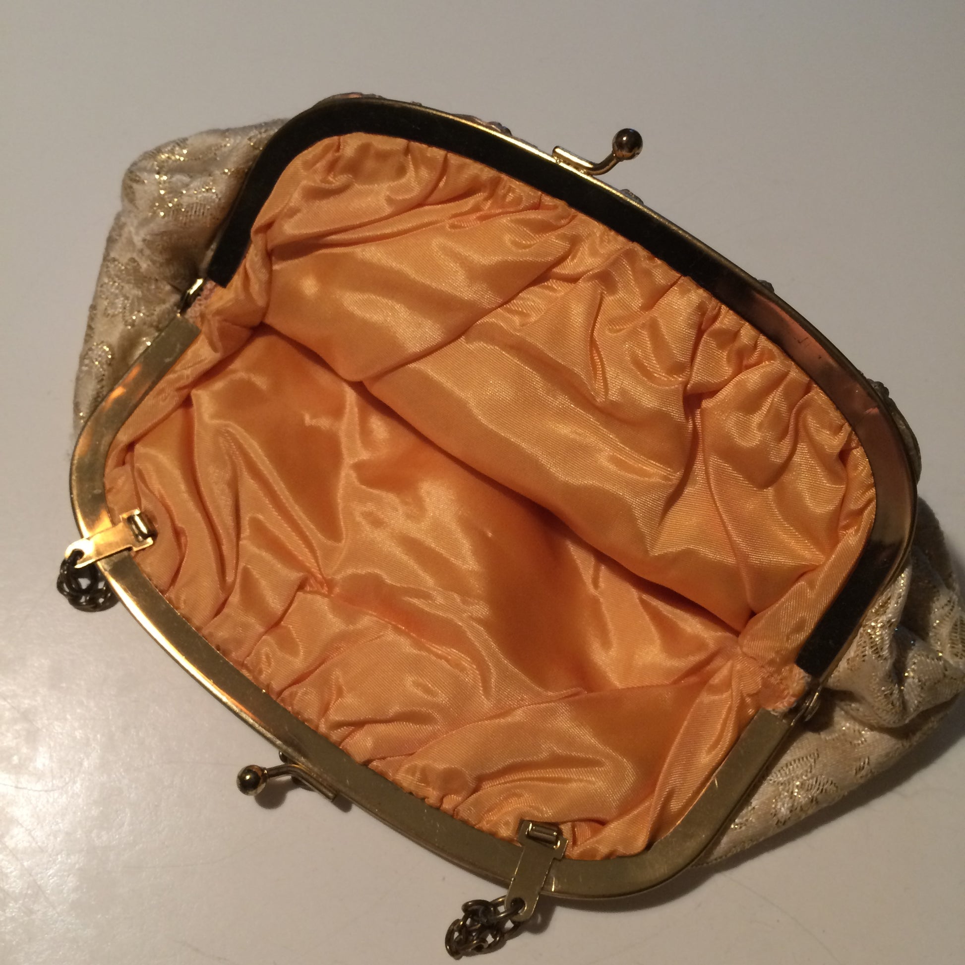 1950s champagne silk handbag with metallic gold floral embroidery, gold tone metal frame with rhinestones, chain strap. Golden yellow lining, no label, no flaws.