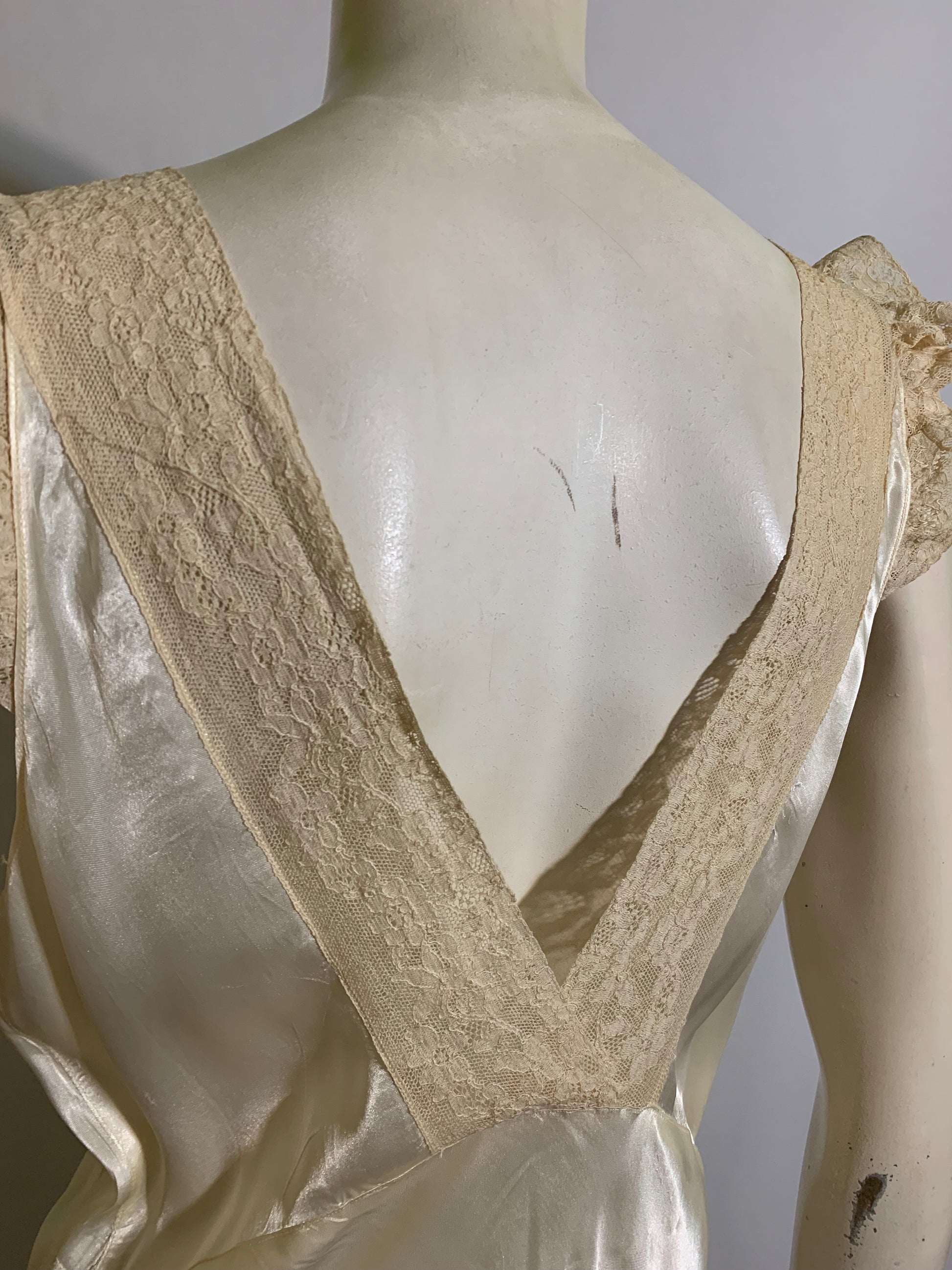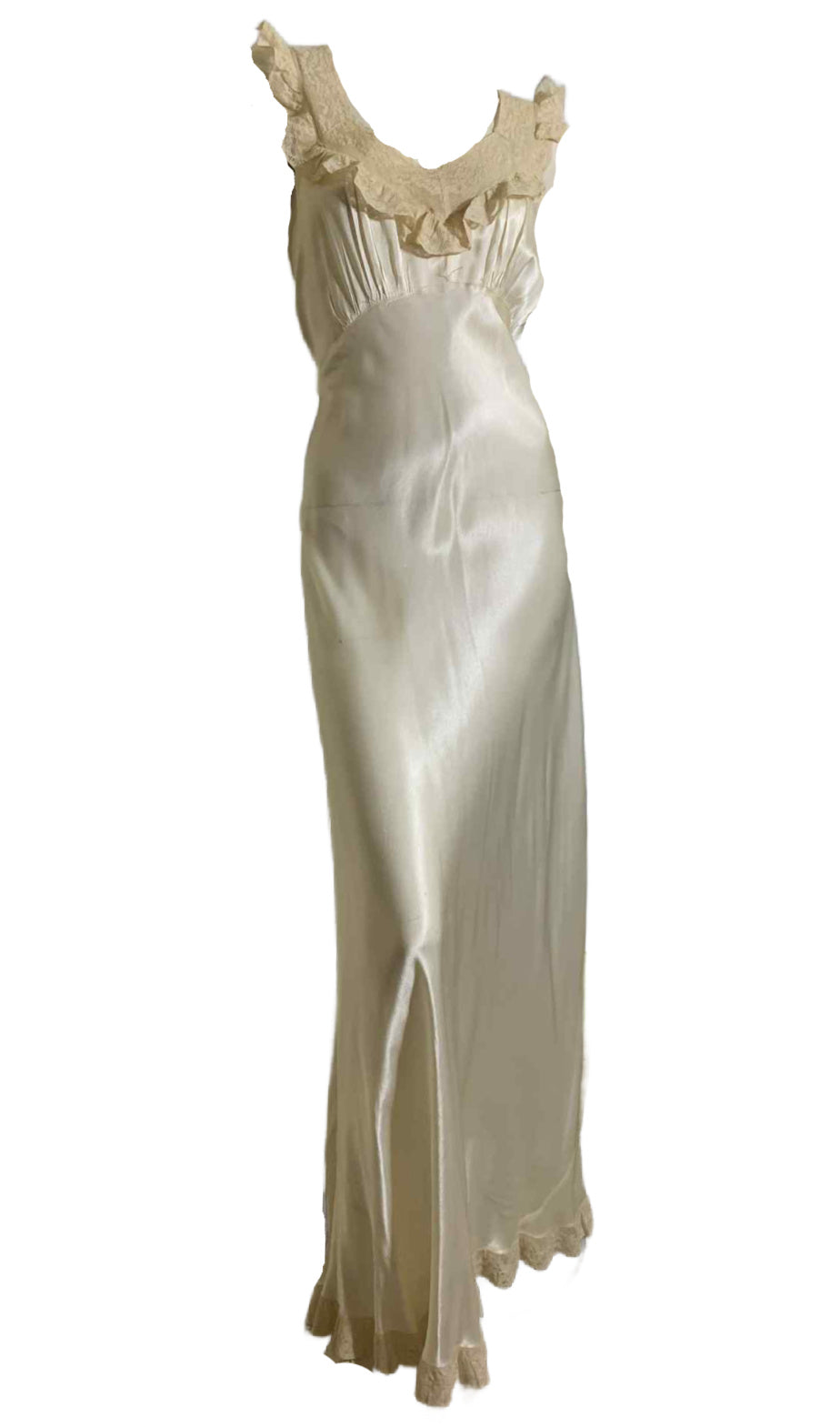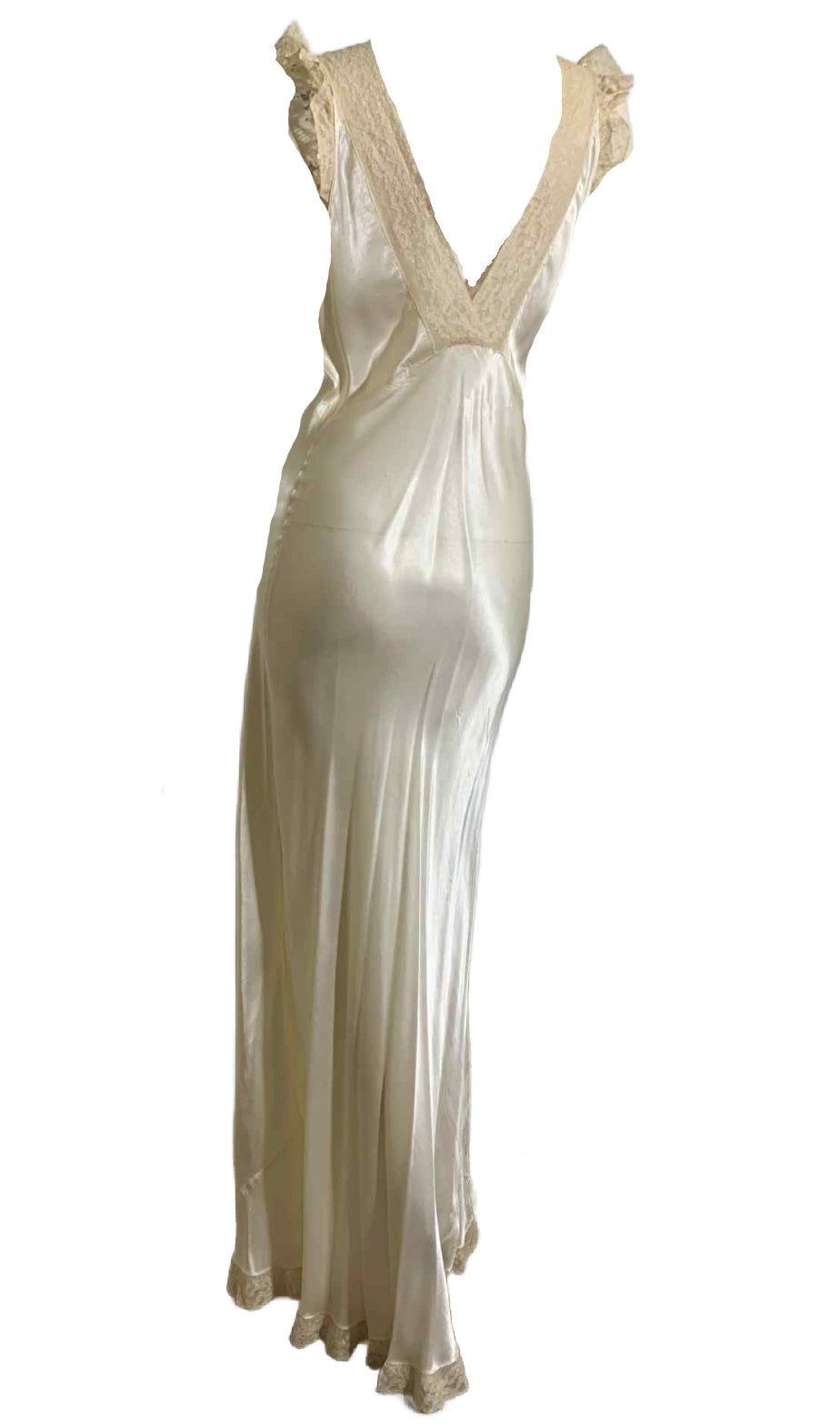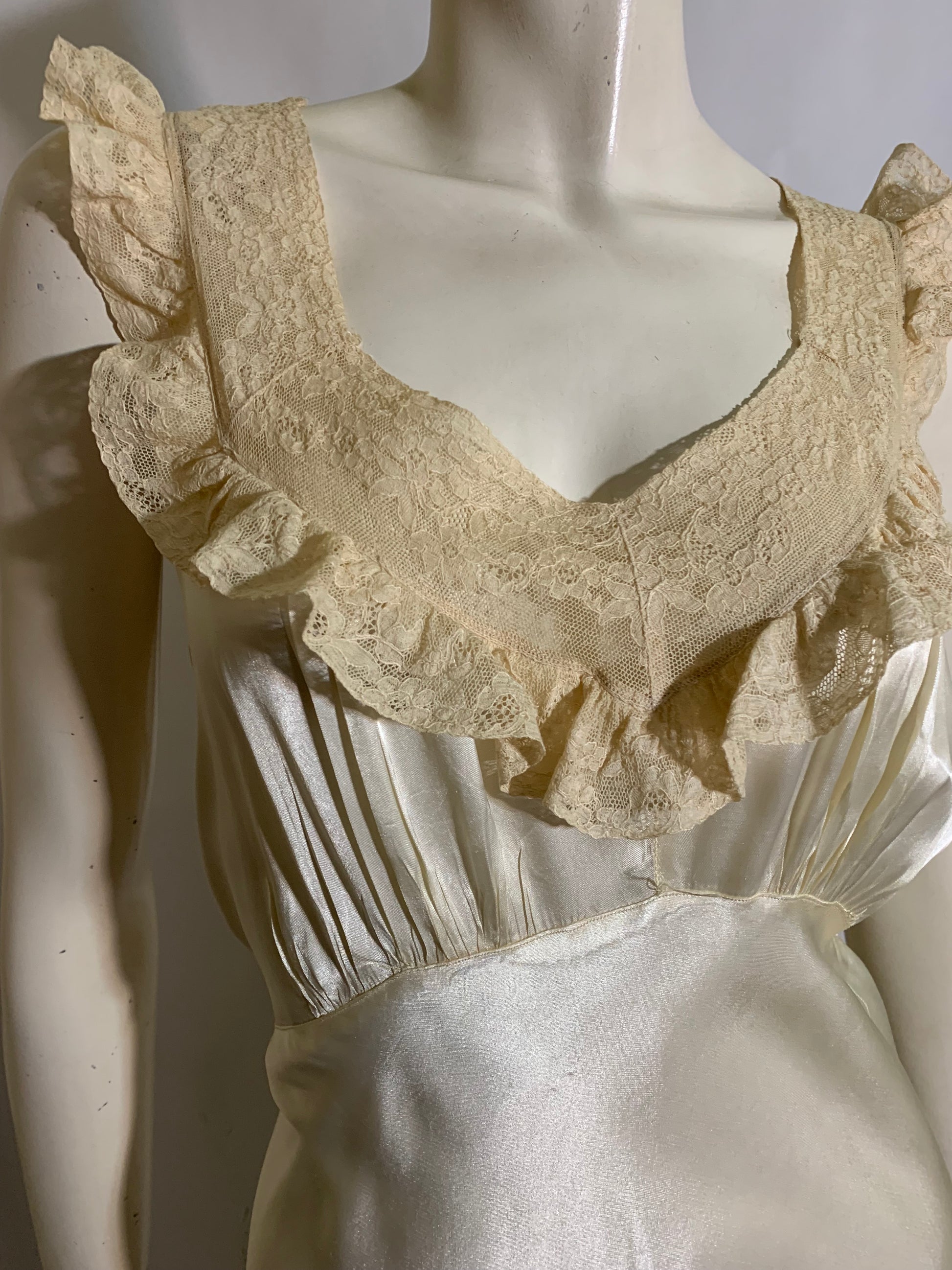 Ivory satin rayon 1940s bias cut nightgown with ruffled lace neckline, low back. No label, no flaws.