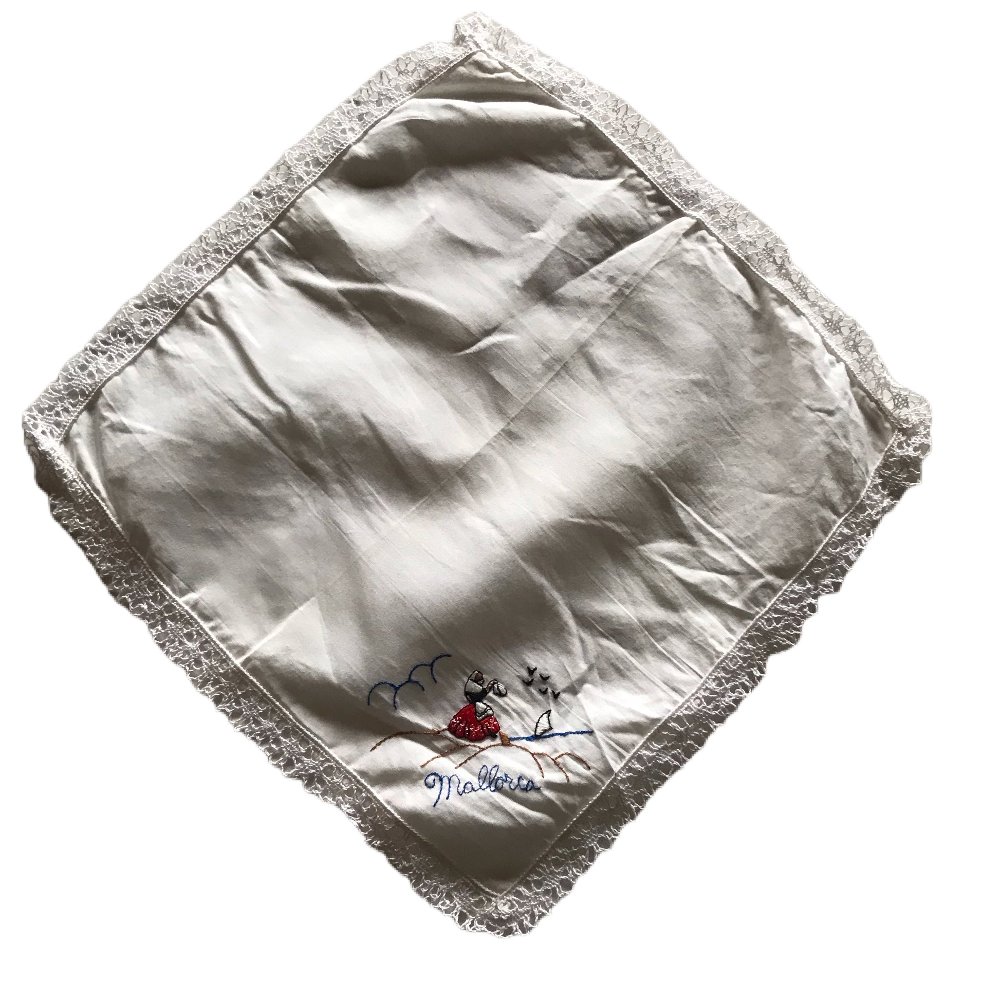 11" square cotton handkerchief with embroidered Mallorca design in corner, white tatted edges. No flaws.