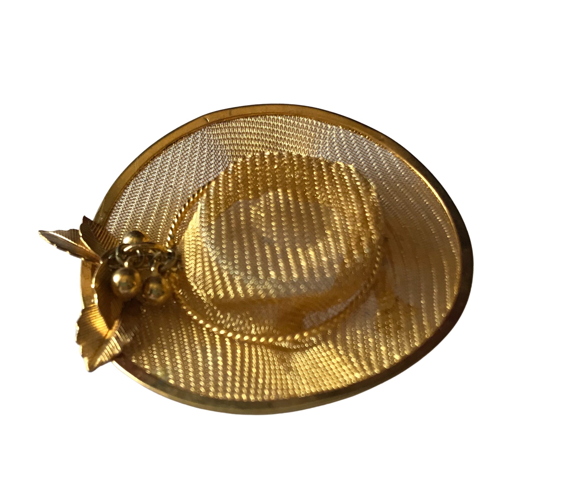 Mesh Gold Tone Metal Hat Shaped Brooch with Holly circa 1980s