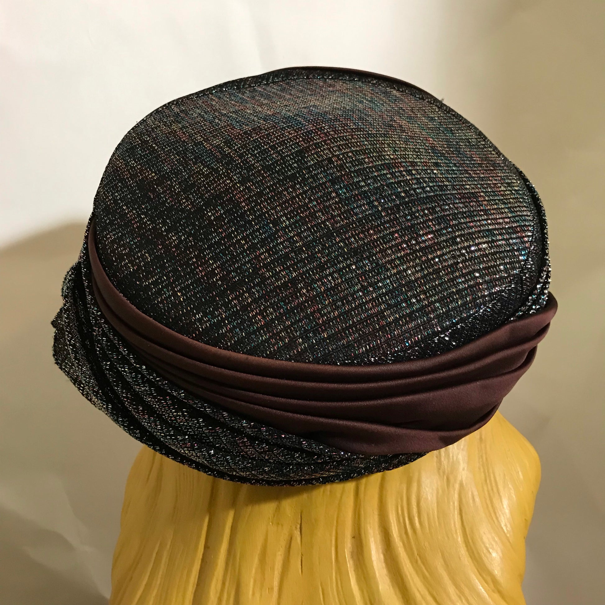 Metallic Bronze, Blue and Black Fabric Wrapped Pill Box Hat circa 1960s