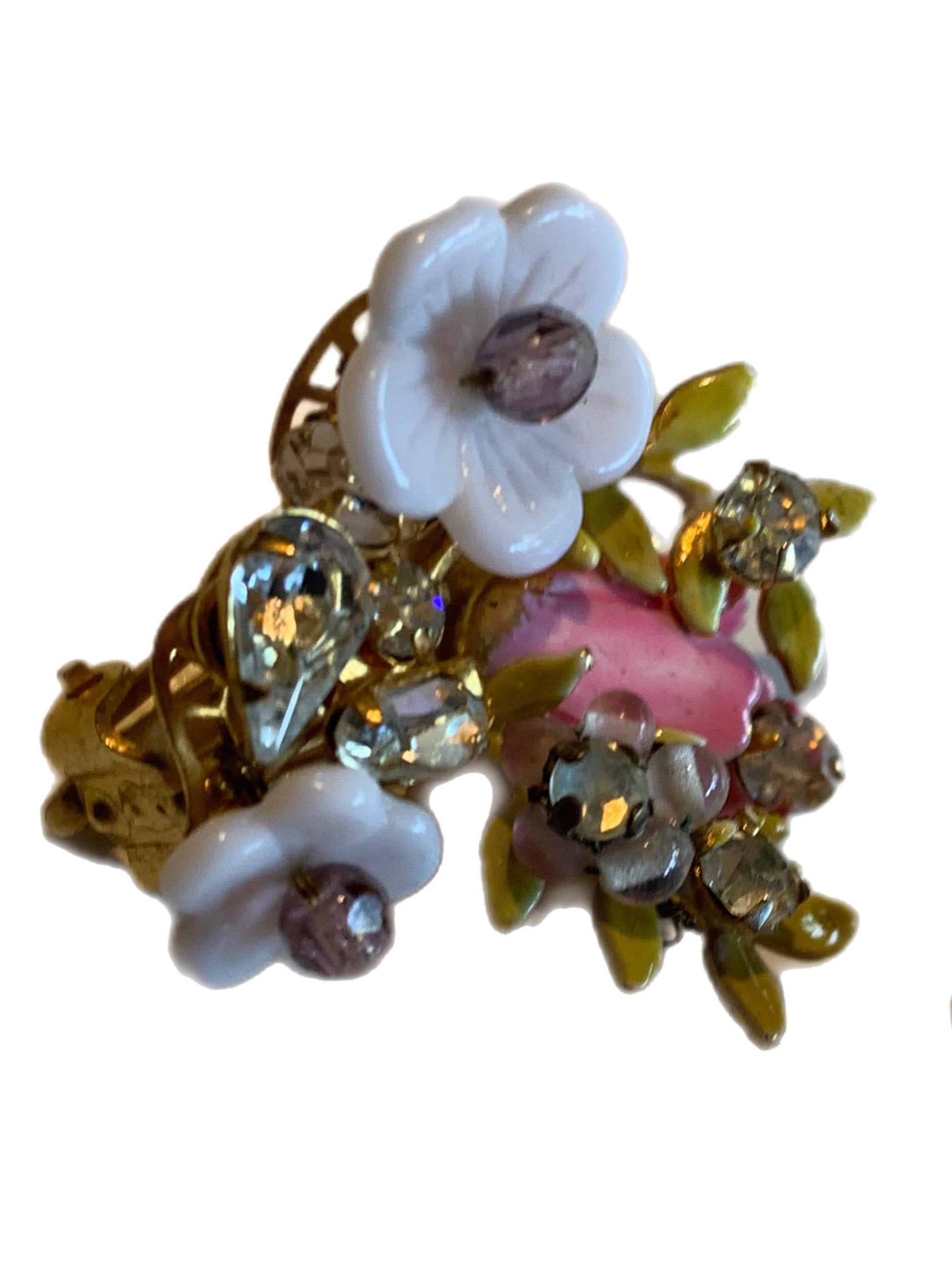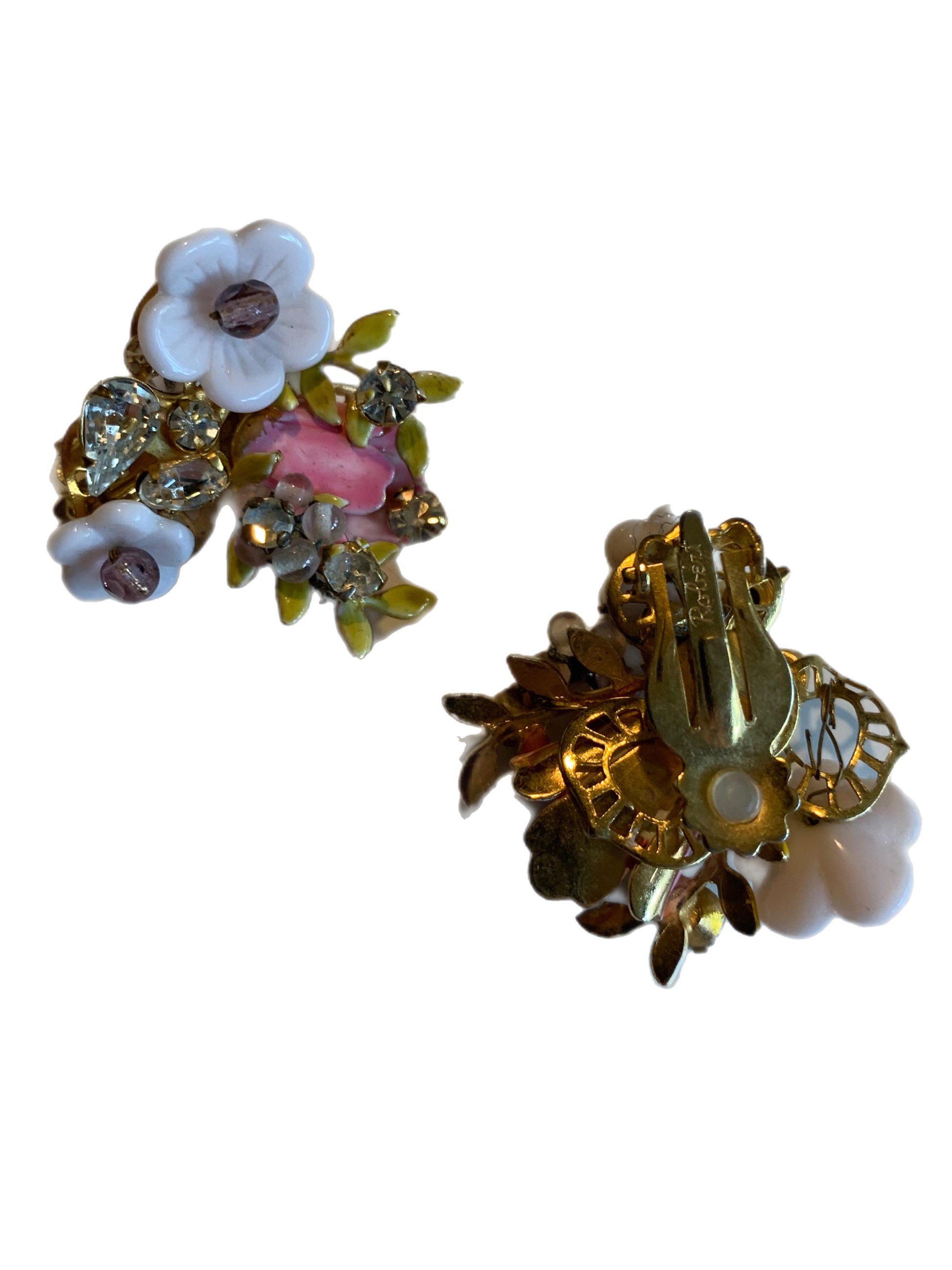 Milk Glass and Rhinestones Pastel Floral Cluster Clip Earrings circa 1950s