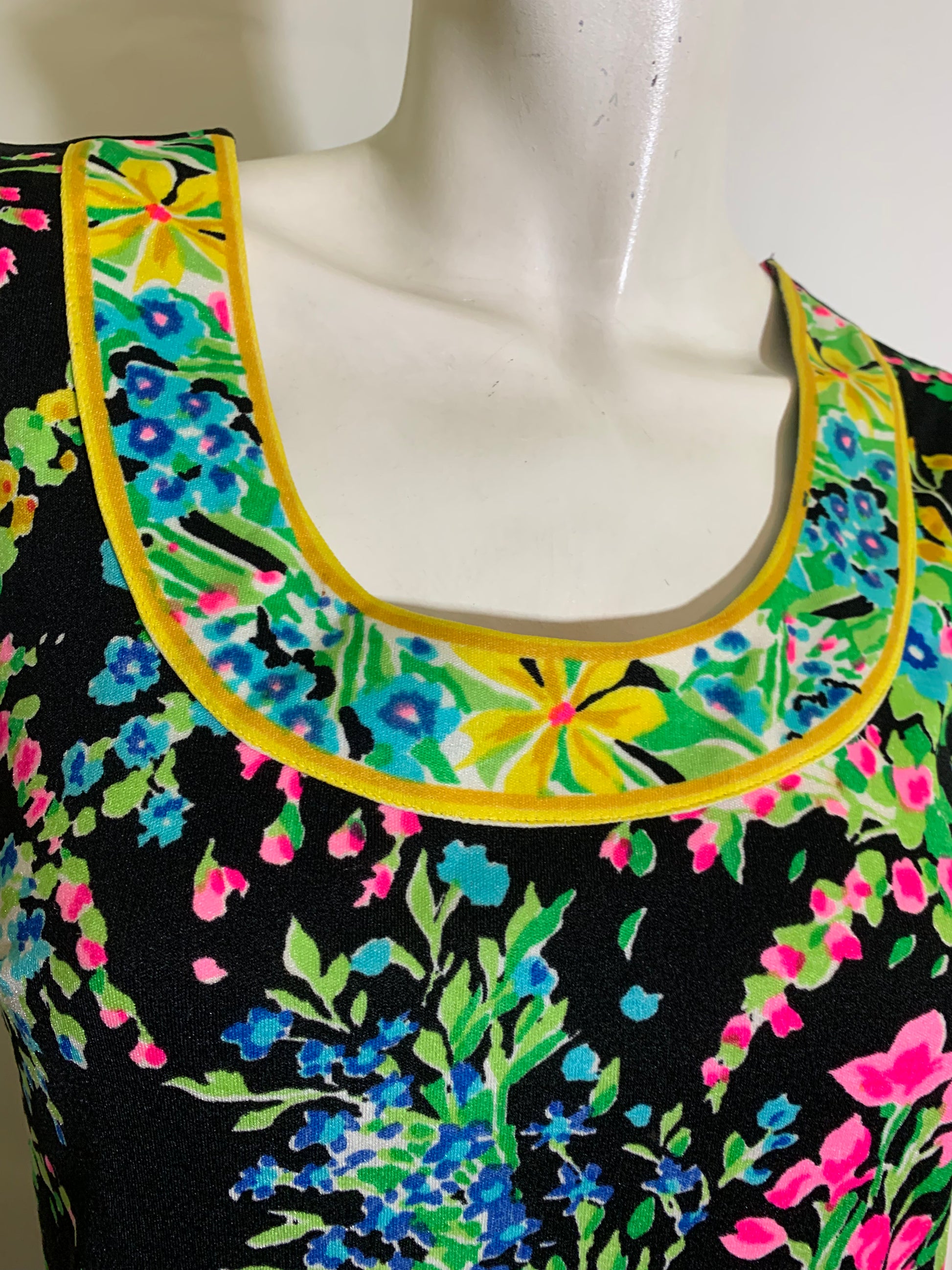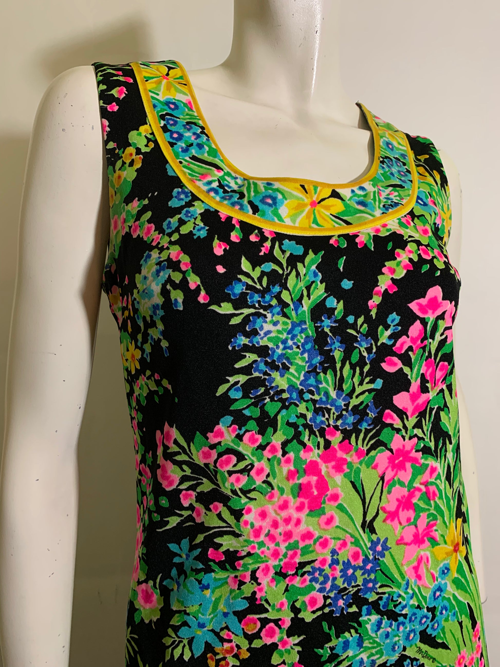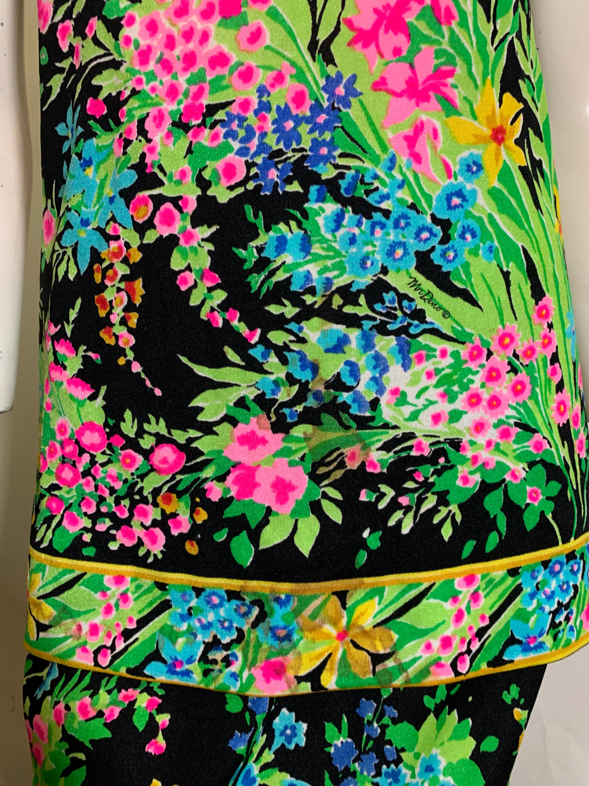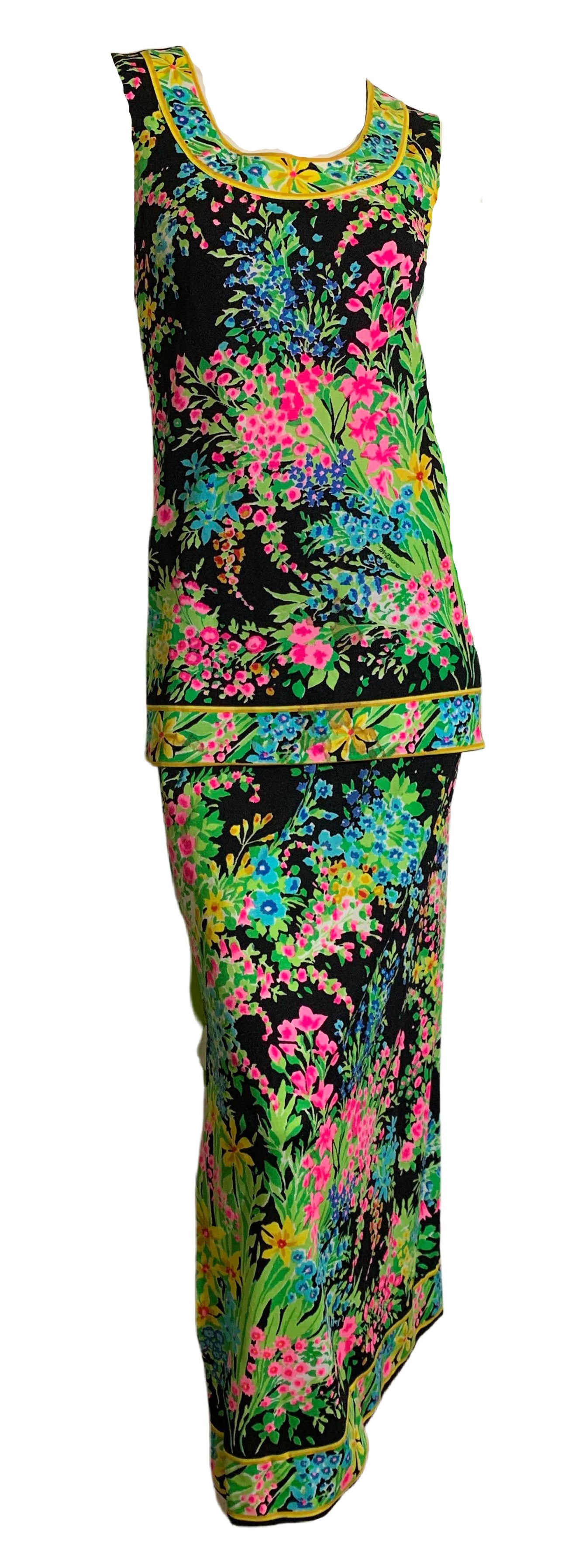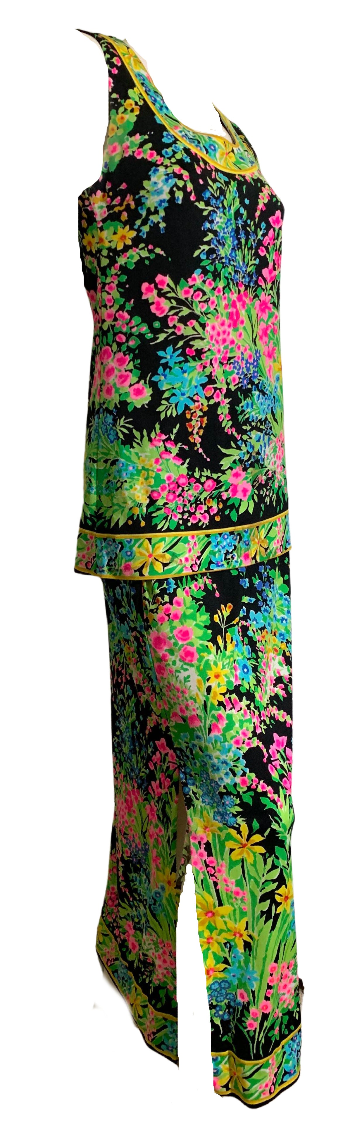 Black silk jersey floral print sleeveless tunic and long pencil skirt with side slits by Mr. Dino. Just amazing worn together or as separates- signed, and classic Mr. Dino! Flawless.