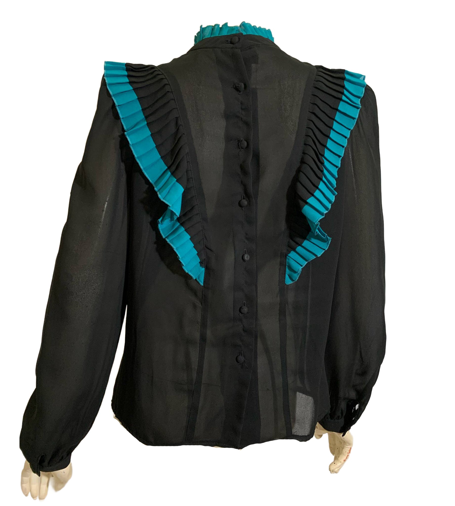 Brilliant turquoise edged black sharp pleated poly crepe semi-sheer 1980s blouse with ruffled collar, buttons down back. It's giving New Wave Blair Warner. No flaws, made by Rae Hepburn California.