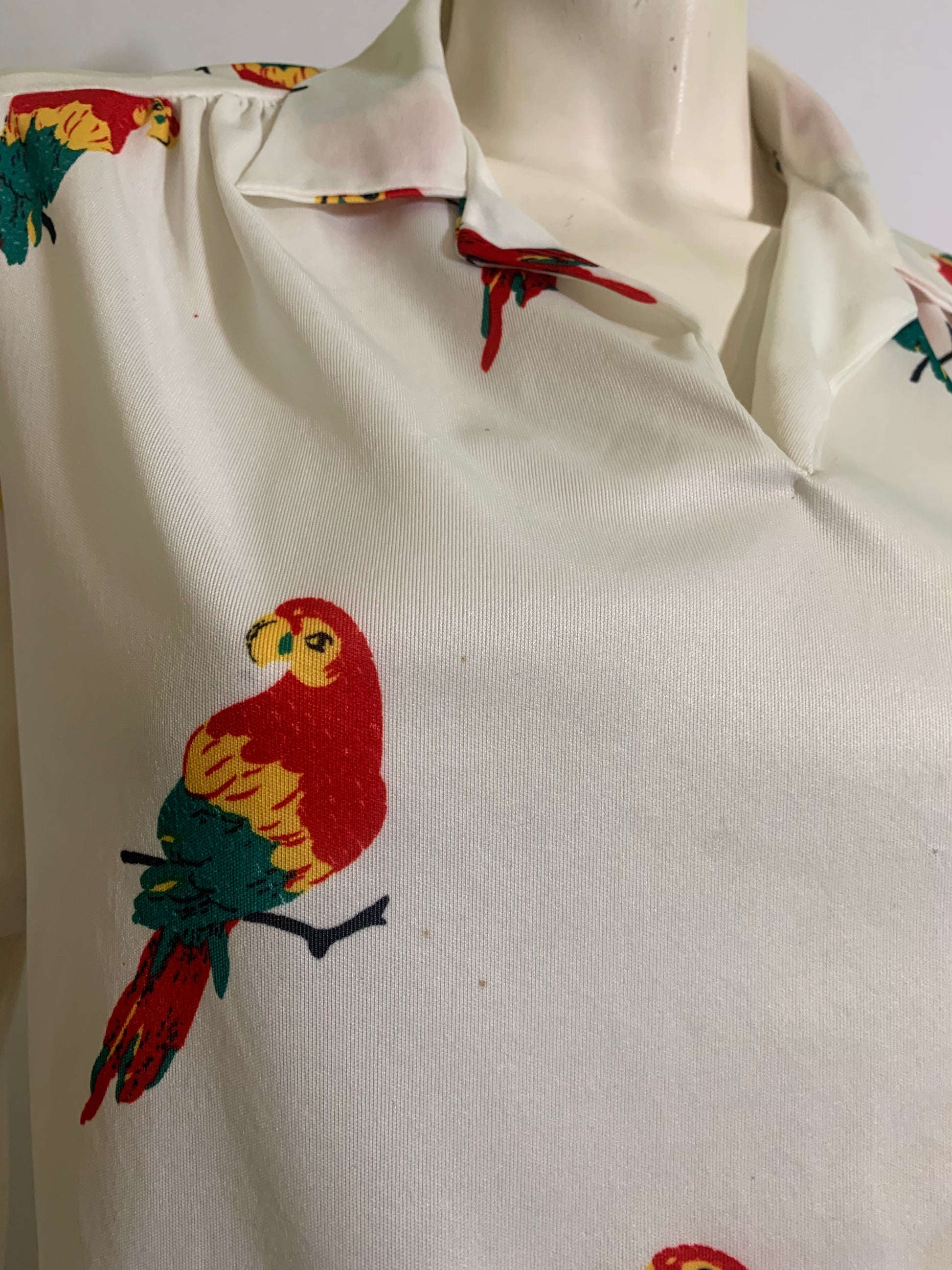 White jersey knit poly blend early 1980s pull over with brilliant parrot print! Shirred at shoulders, a few tiny spots.