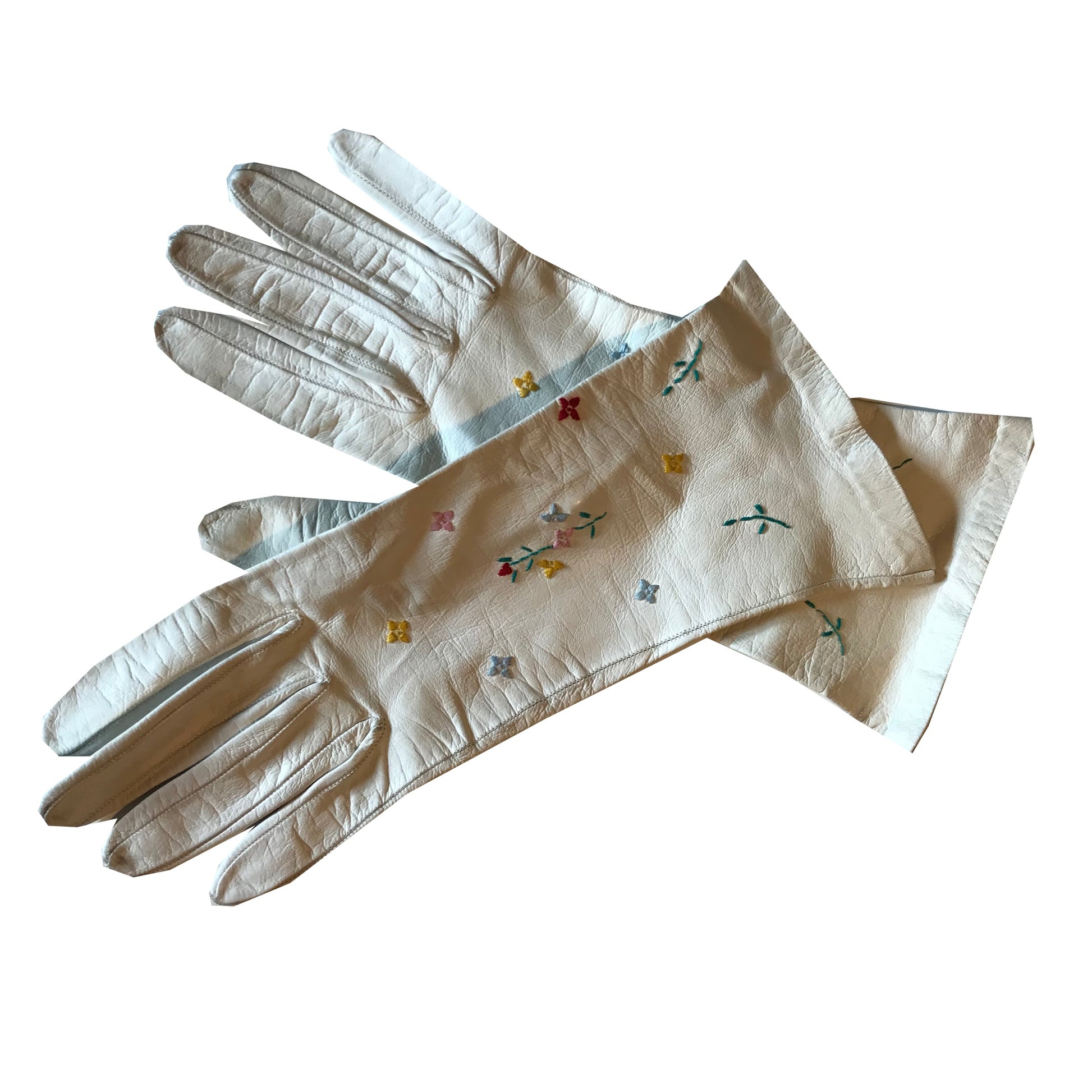 Pastel Floral Embroidered White Leather Gloves circa 1950s