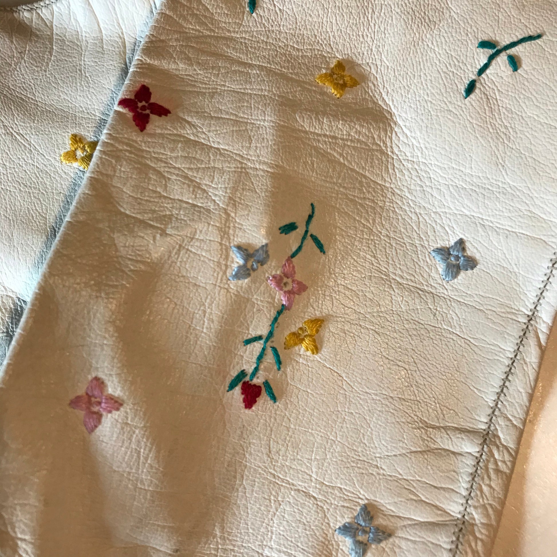 1950s white leather gloves with dainty pastel embroidered flowers on backs of hands and arm, unlined. No label, some slight discoloration to finger tips.