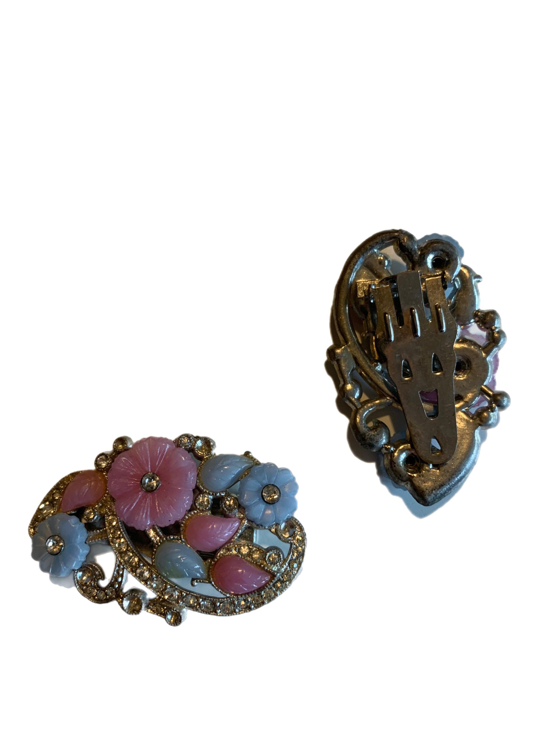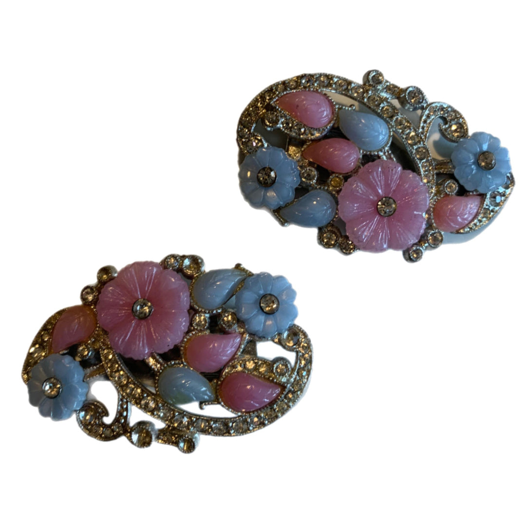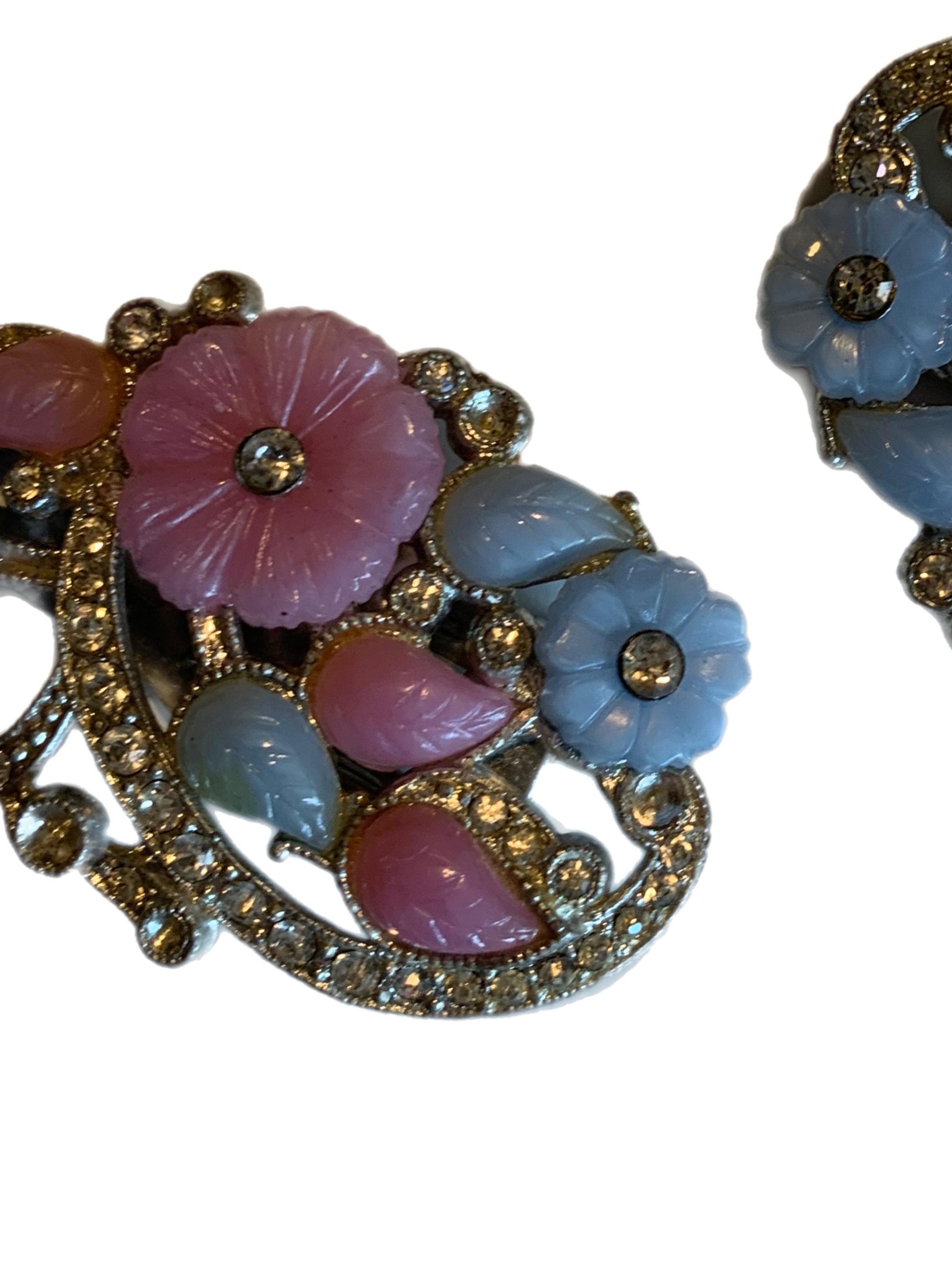 Pastel Floral Glass and Rhinestones Set of Fur Clips circa 1930s