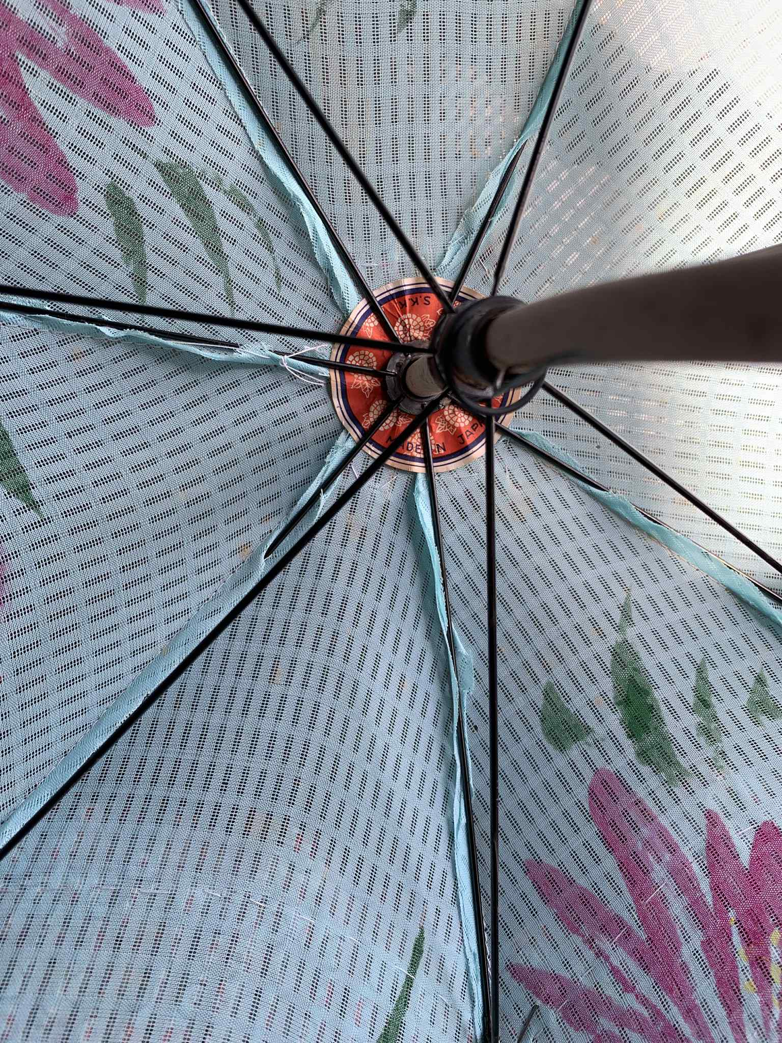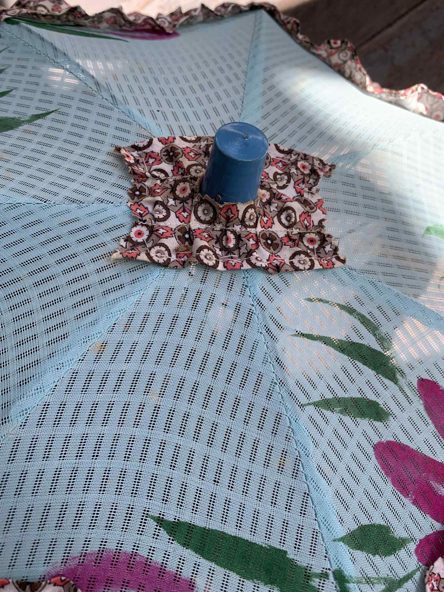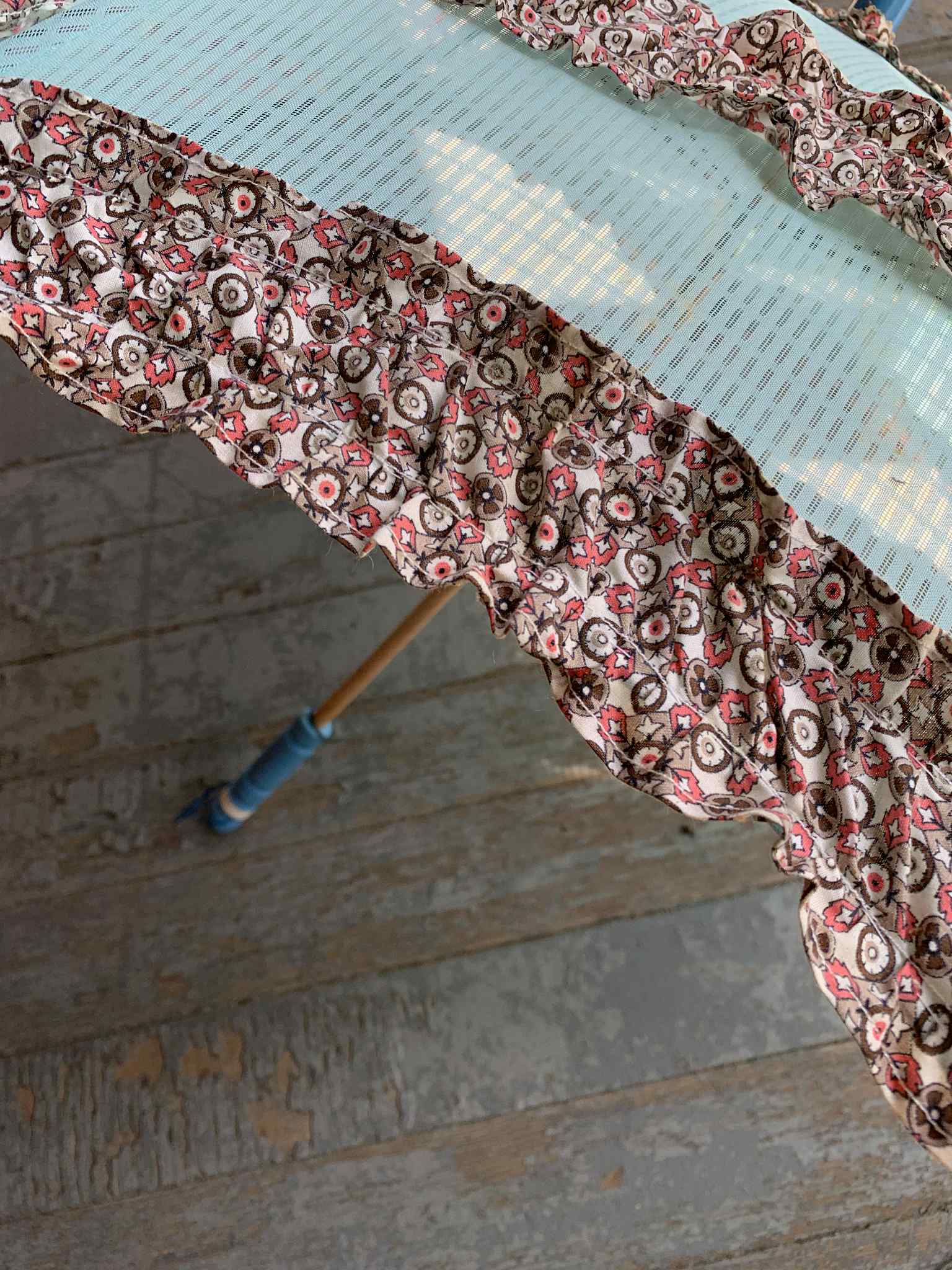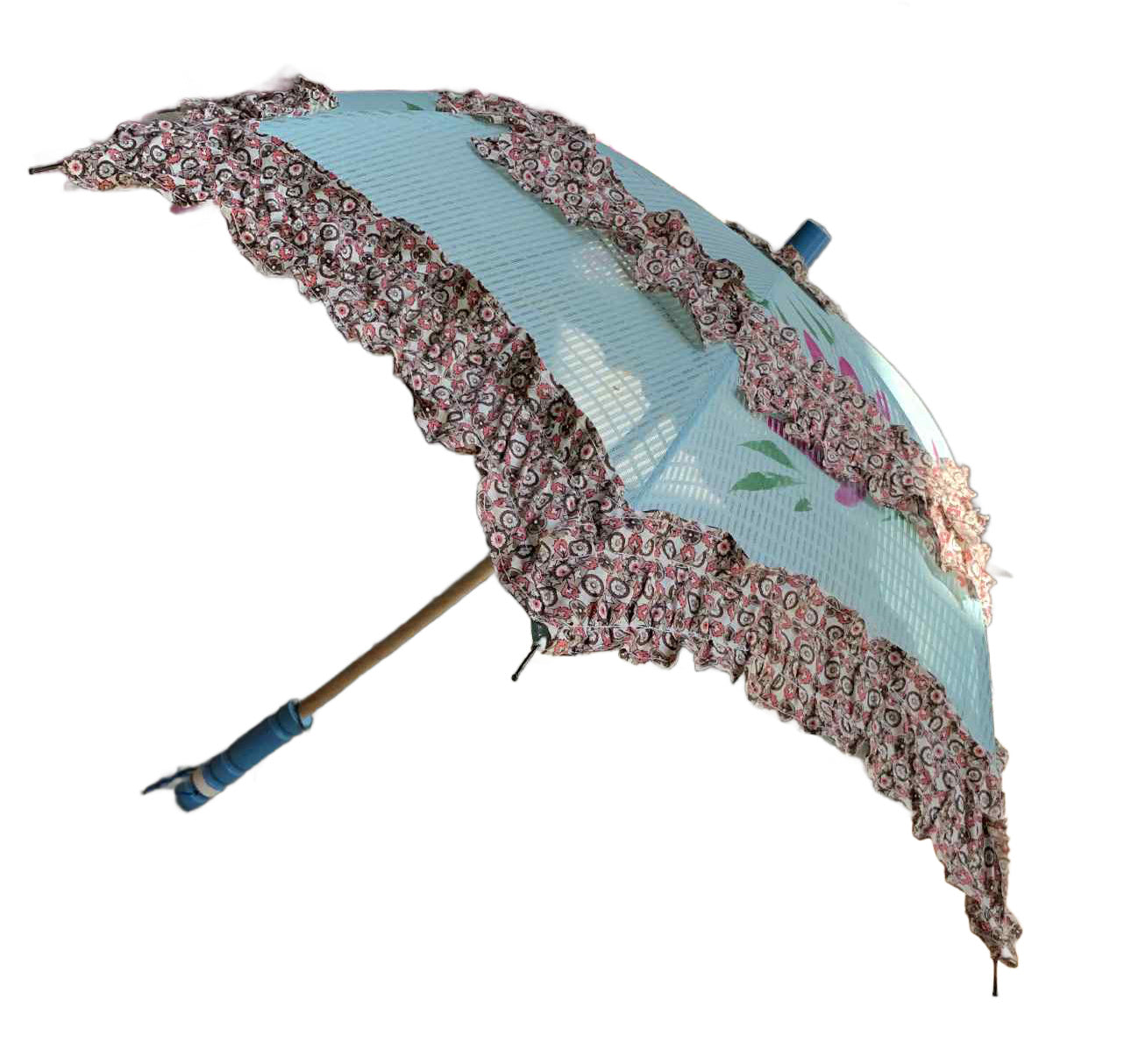 Divine baby blue fabric parasol with semi-sheer design, pink calico ruffles. Wooden stem and handle (painted blue). Made in Japan. 22" wide, 21" handle