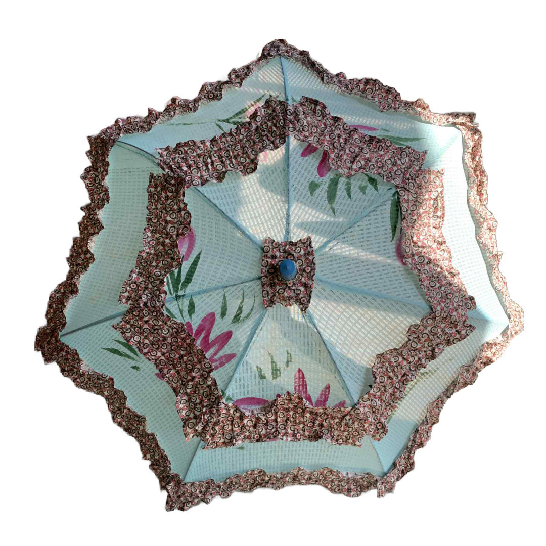 Pastel Painted Baby Blue Mini Parasol with Floral Design and Ruffles circa 1950s