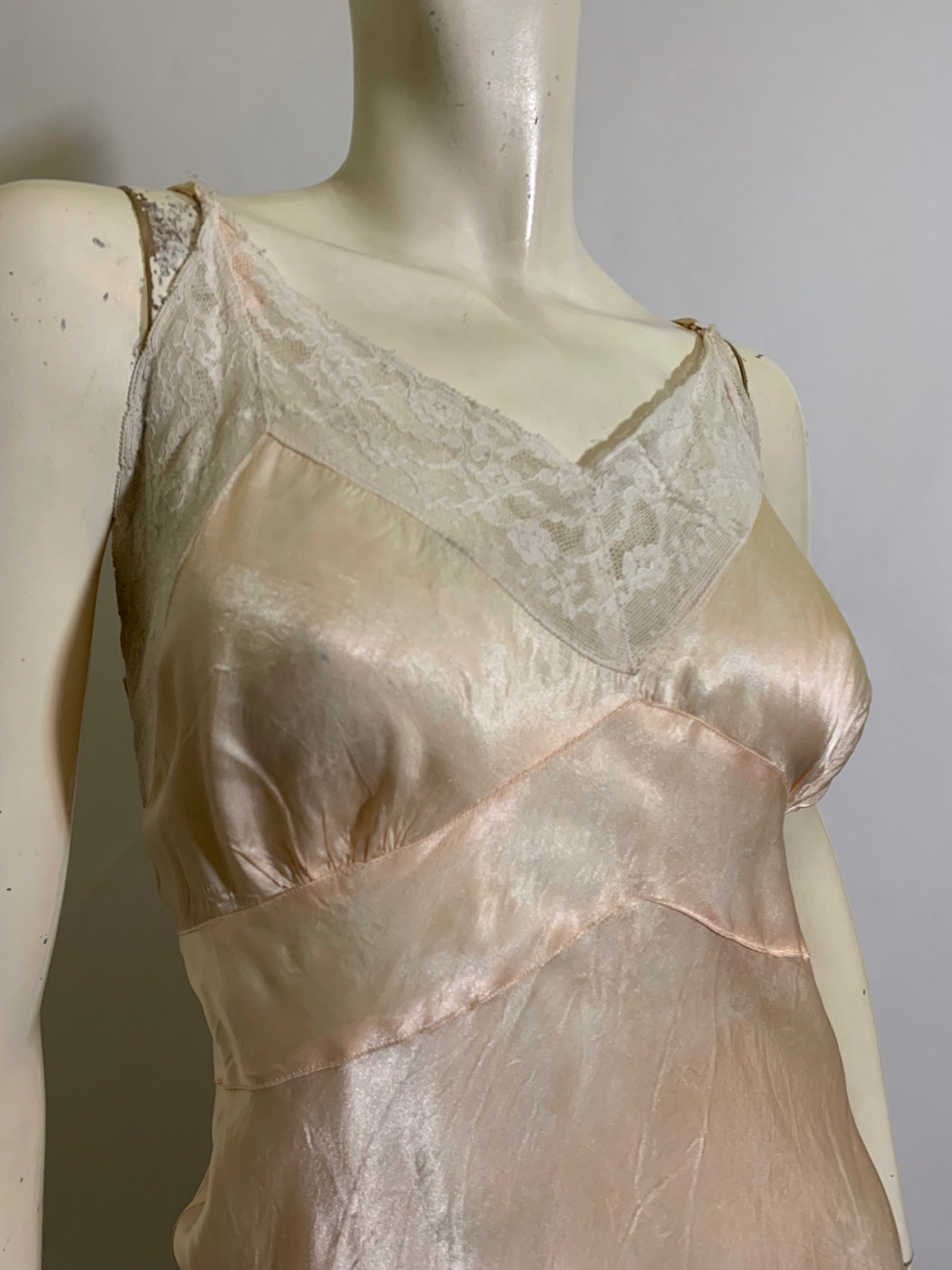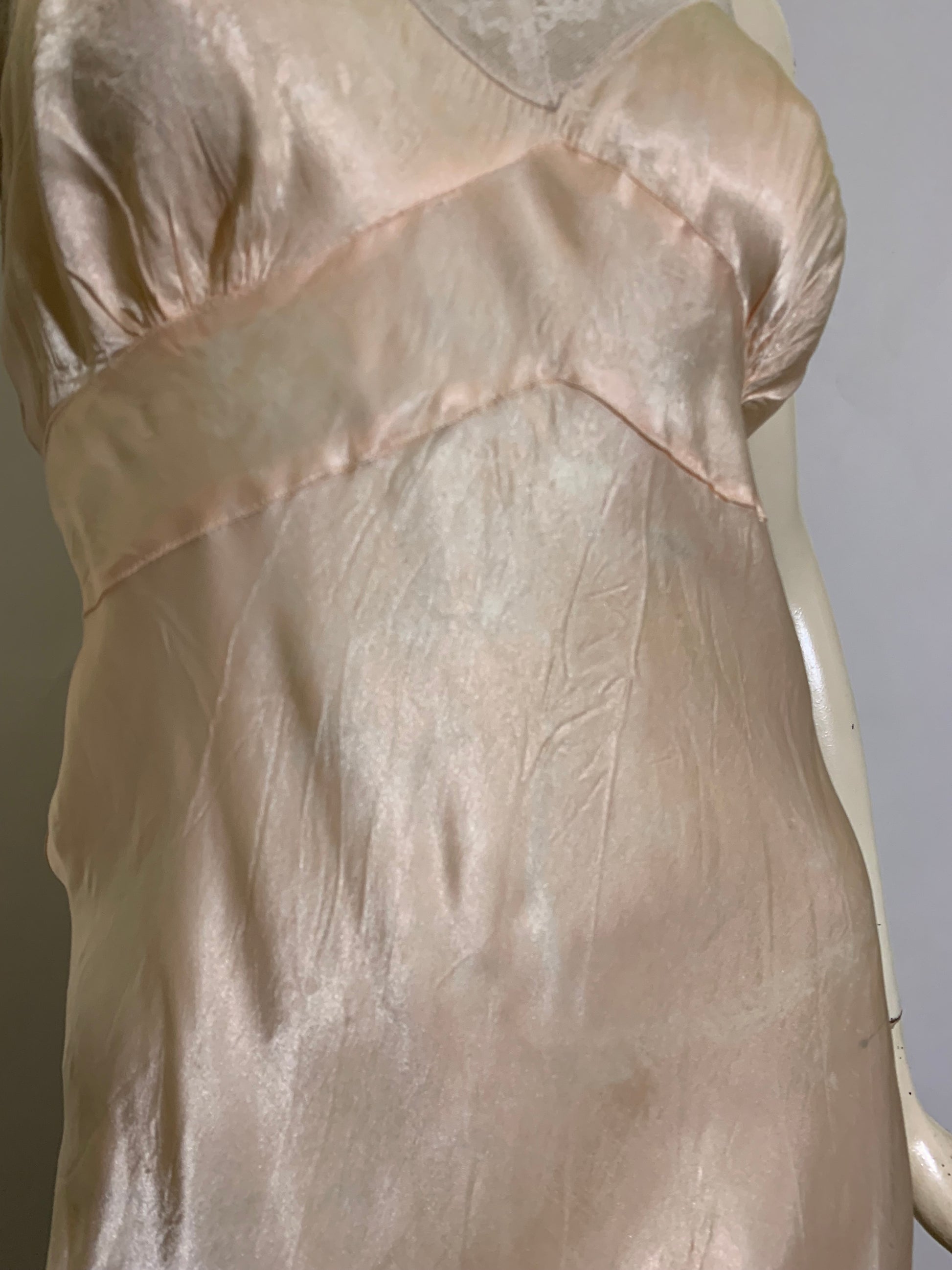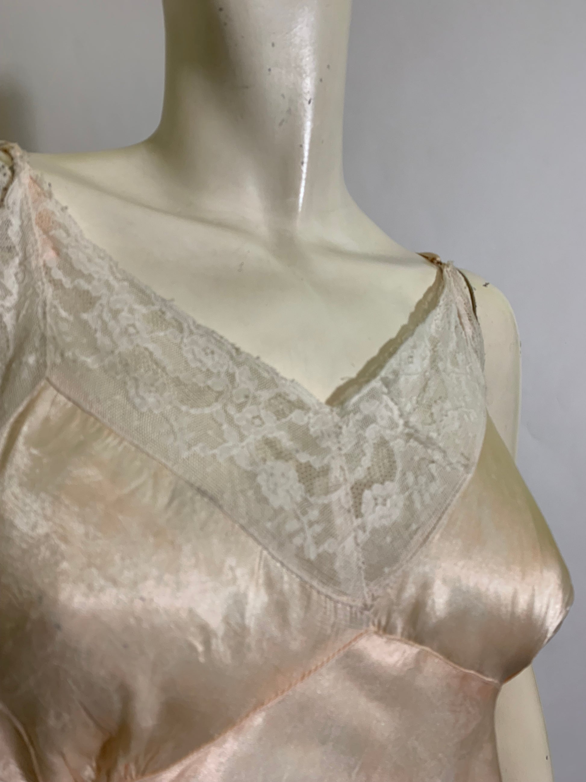 Peach satin acetate lace trimmed full slip with embroidery. No label. Straps reattached. Minor wear.