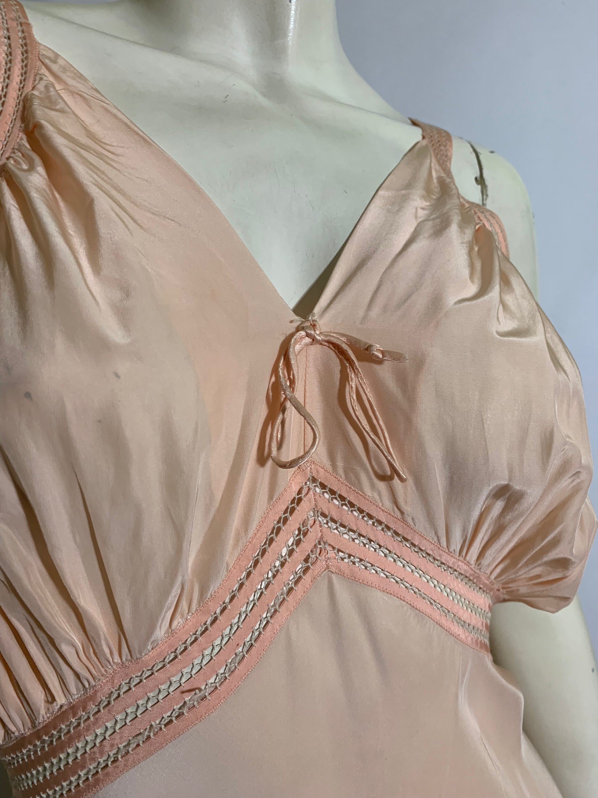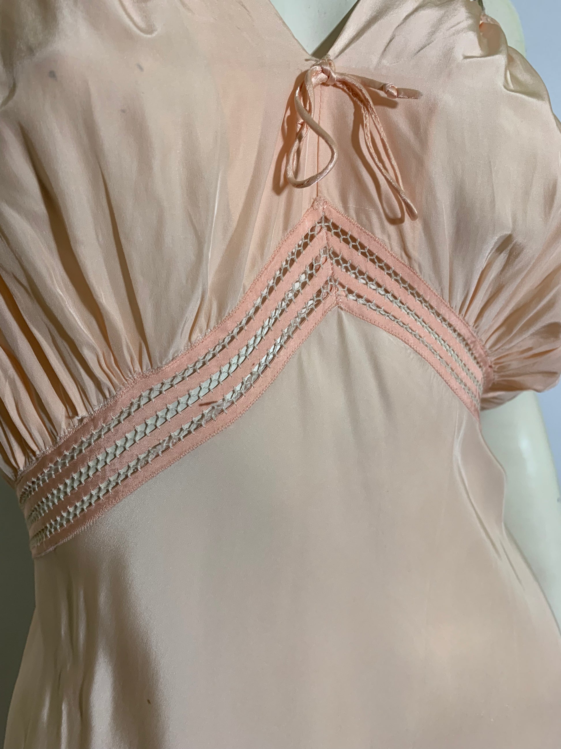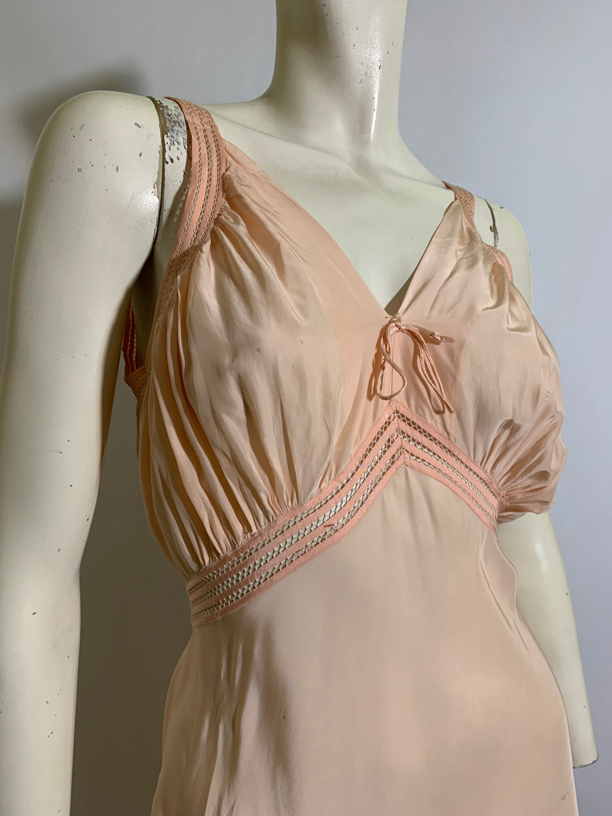 Lovely peach silk 1930s bias cut nightgown with faggoted trim, bow at deep neckline. By Miss New Yorker. No flaws.