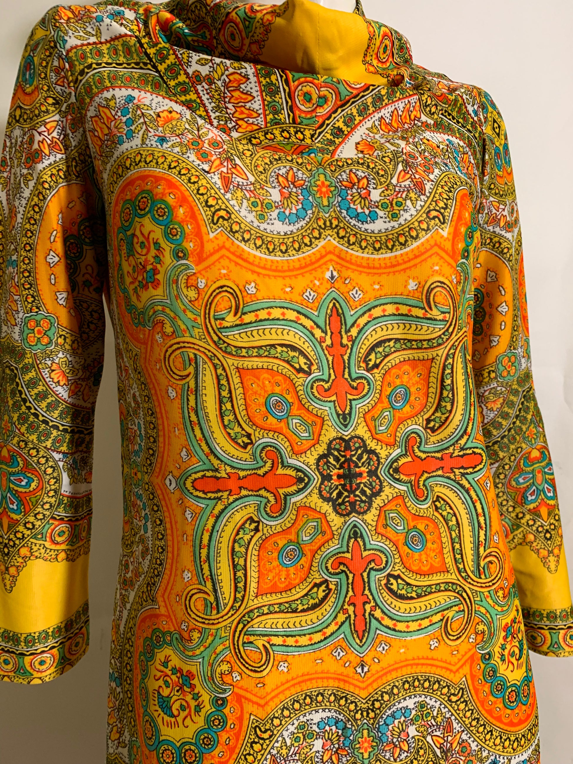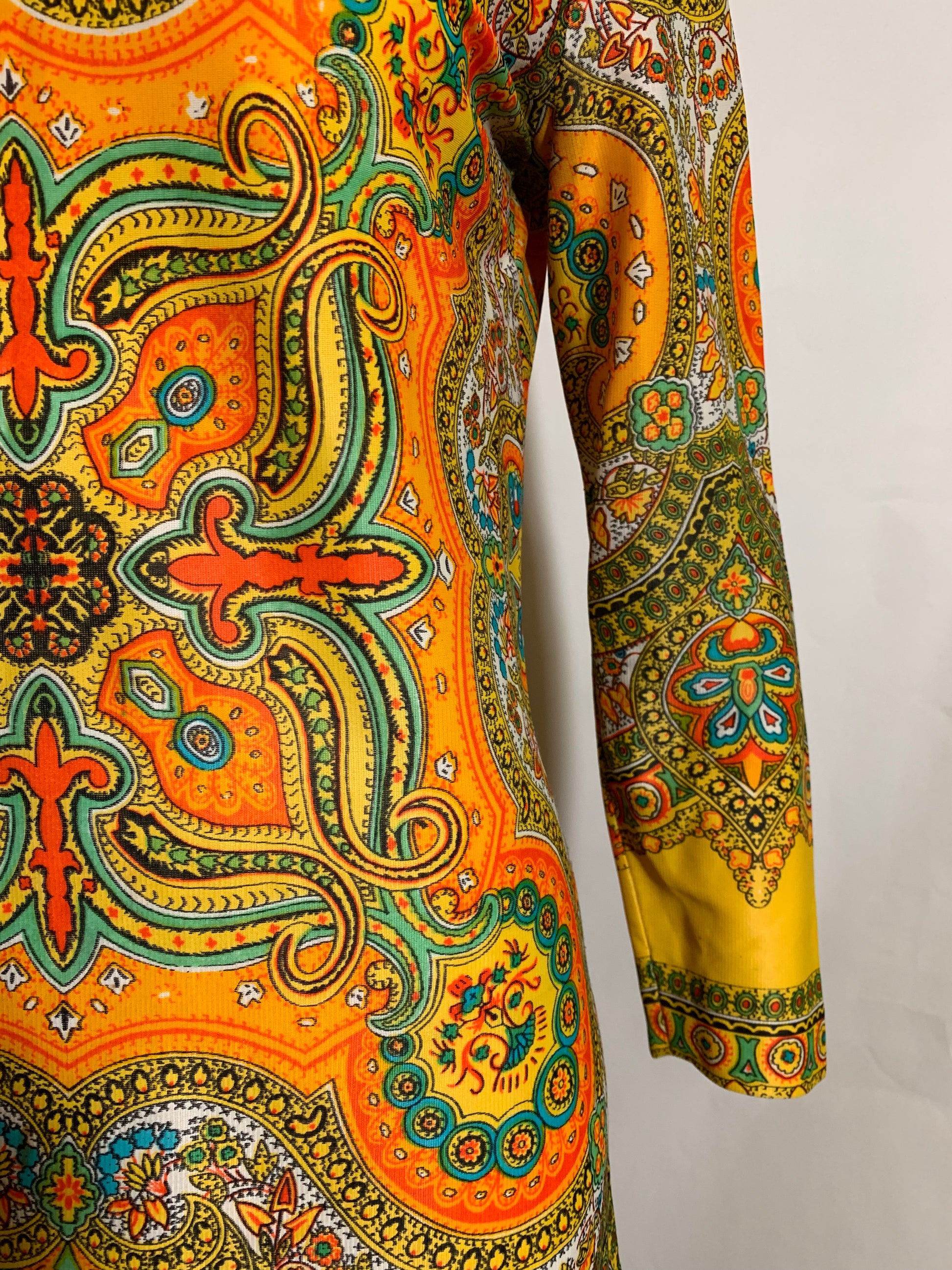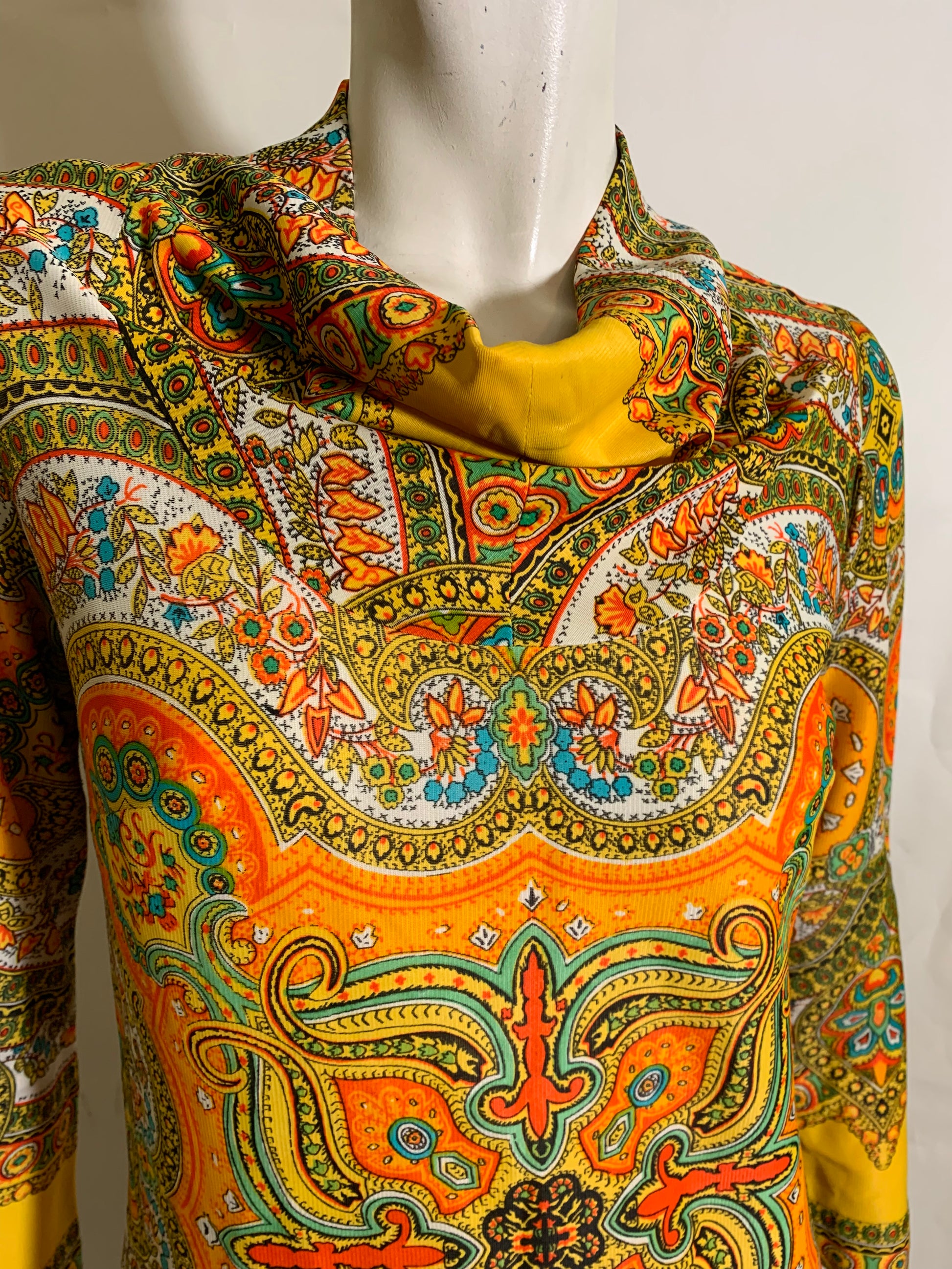 1970s bright saffron and tangerine Persian knit design jersey nylon mini dress, cowl collar. Zips up back, unlined. No flaws.