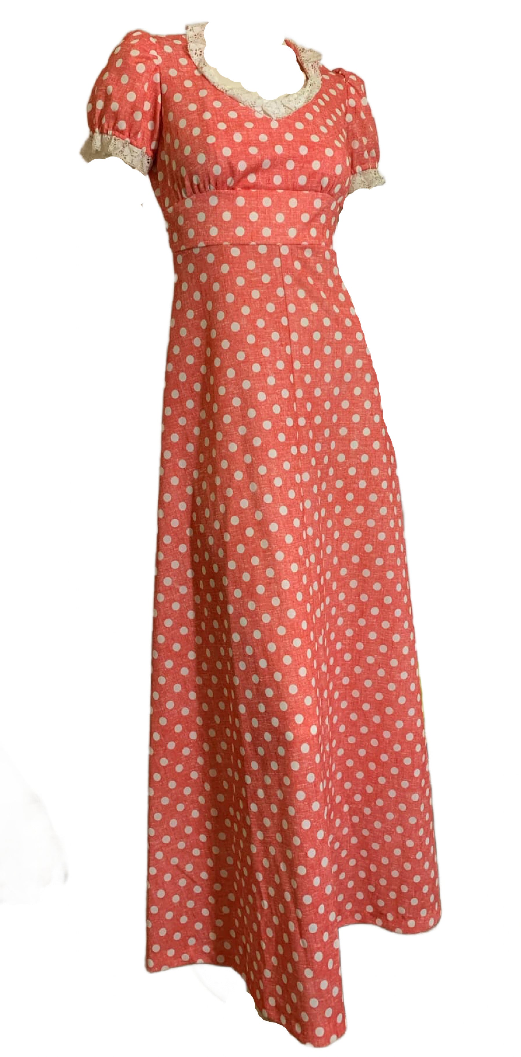 Pink and White Empire Waist Puff Sleeved Polka Dot Maxi Dress circa 1970s