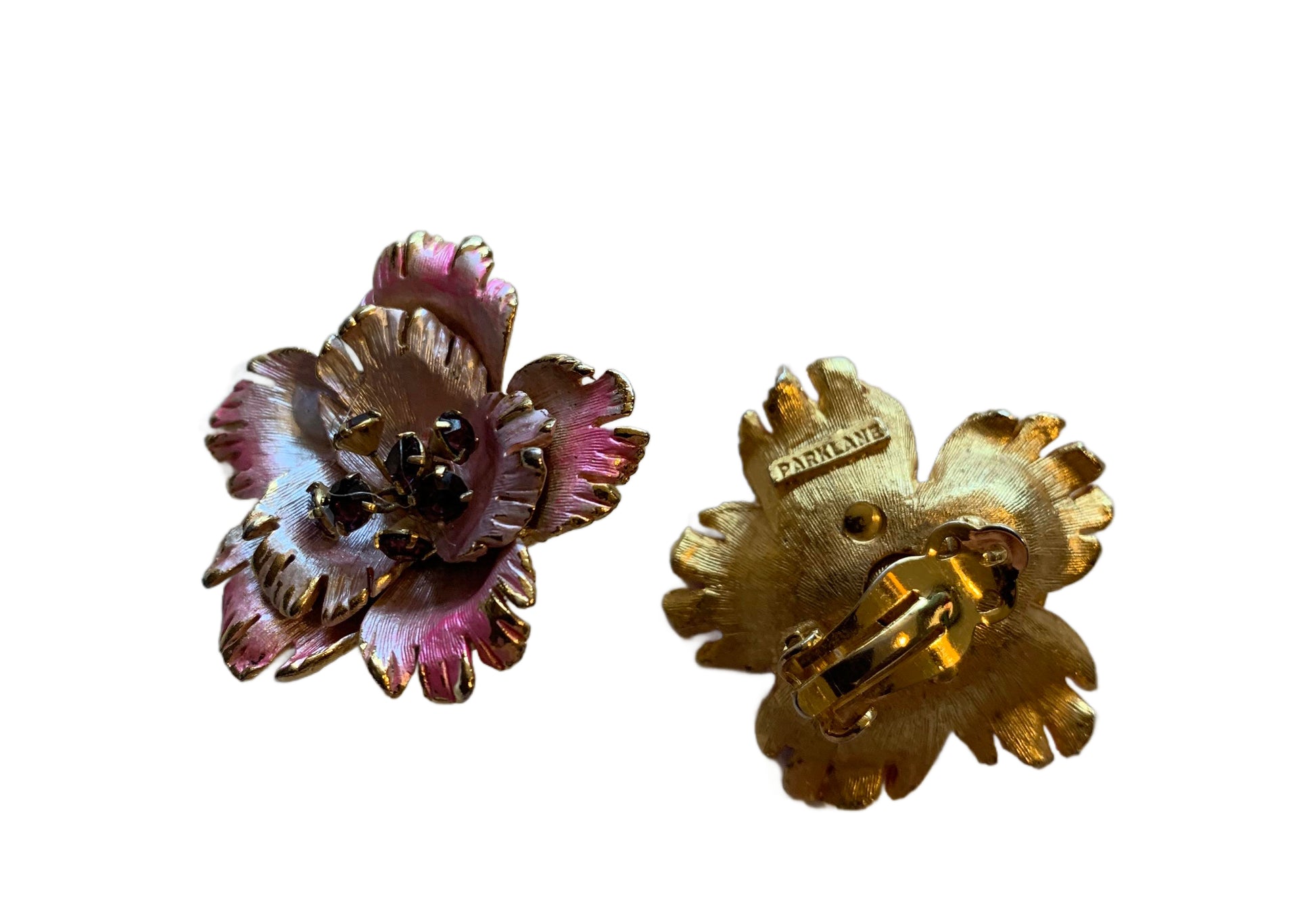 Pink Frosted Metal Hibiscus Clip Earrings with Pink Rhinestone Center circa 1960s