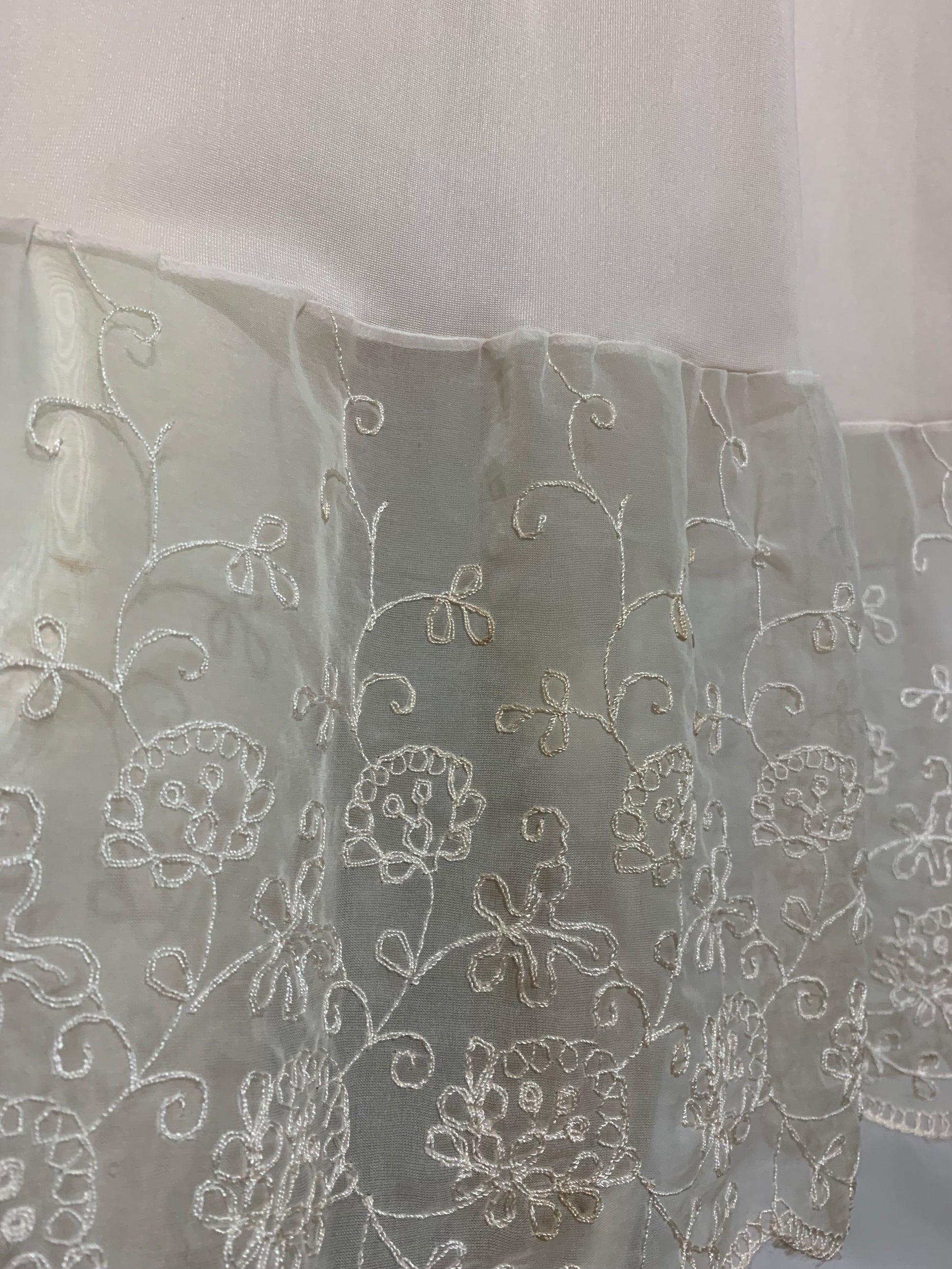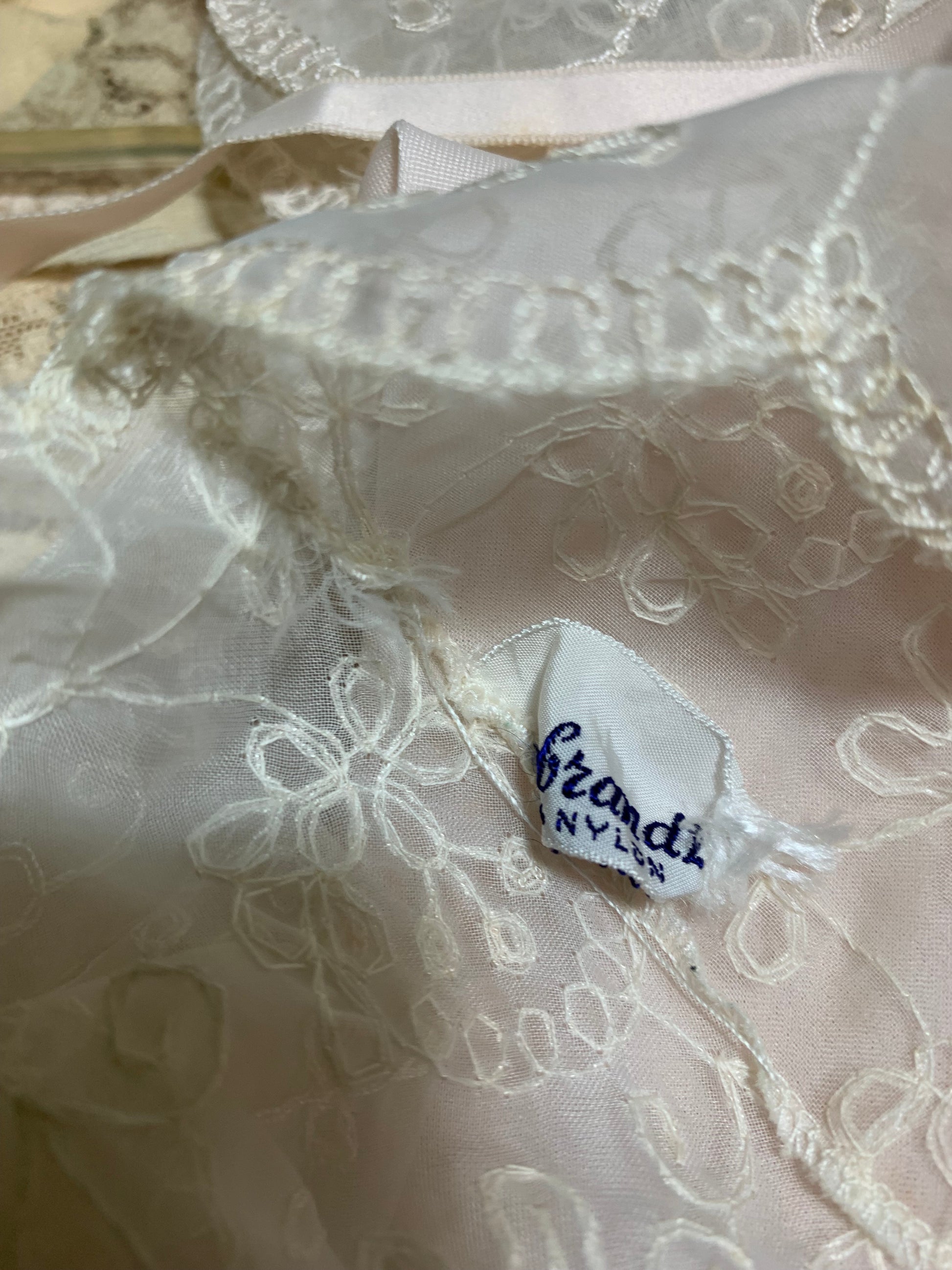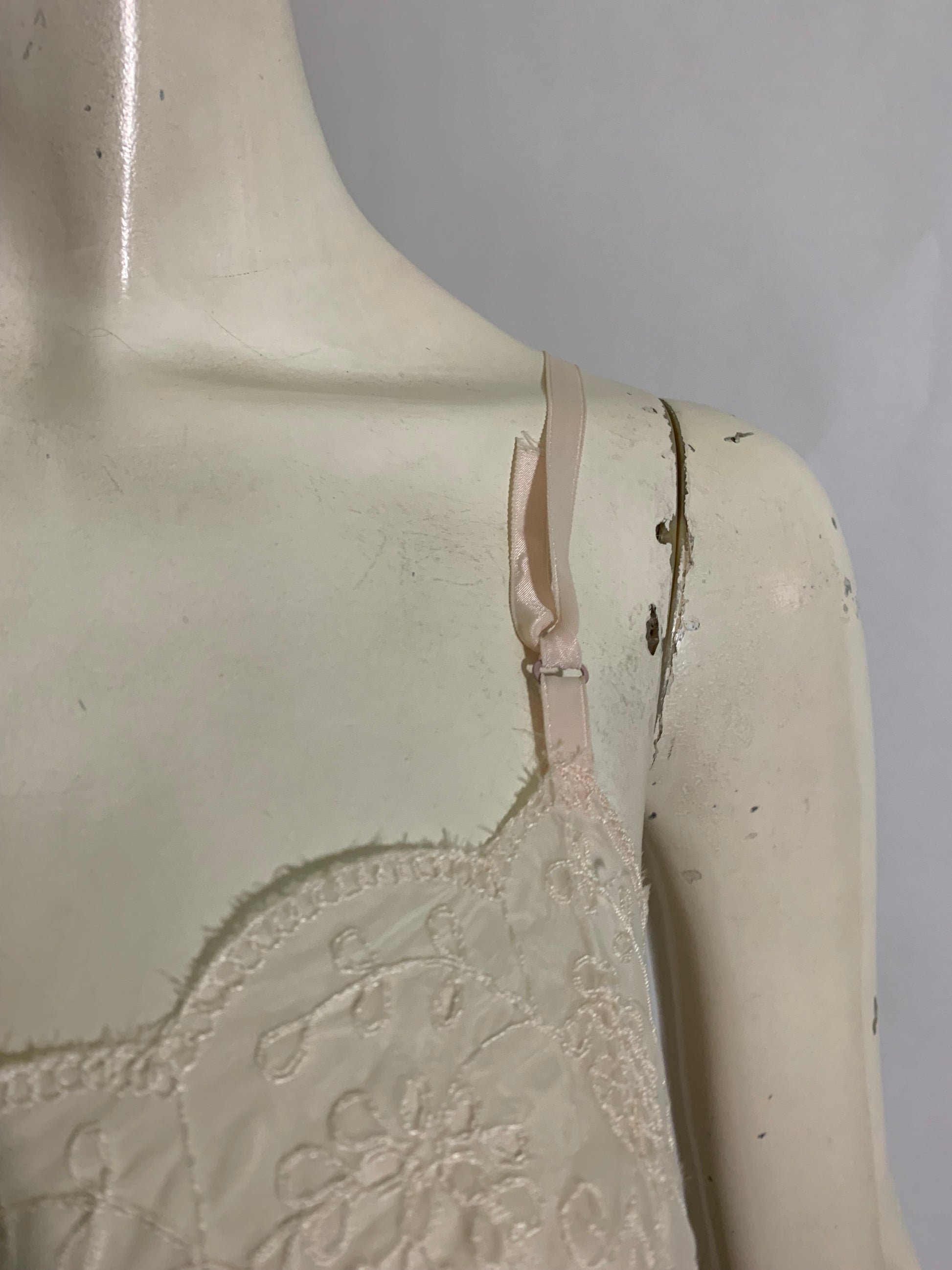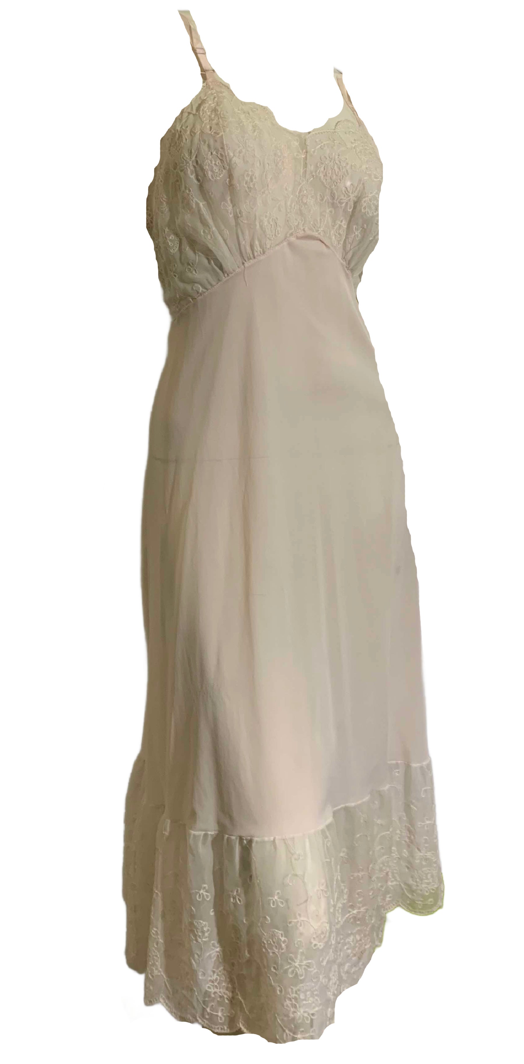 Pale pink nylon long full slip with embroidered sheer white ruffled hem and bodice, size 32. Straps are a little messed up. No label.
