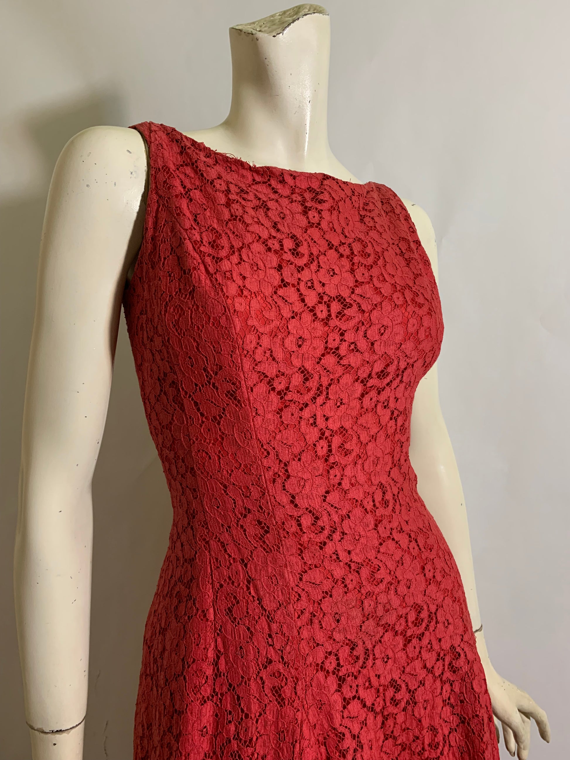 Gently faded red lace 1960s sleeveless party dress- almost pink! Lined in red acetate, back metal zipper. No flaws, just not as vivid as it once was. No label.