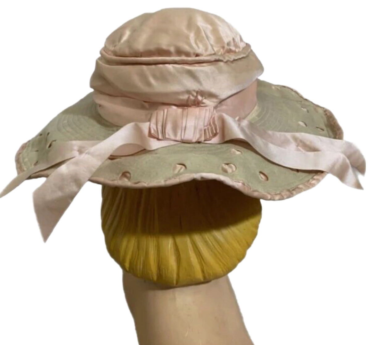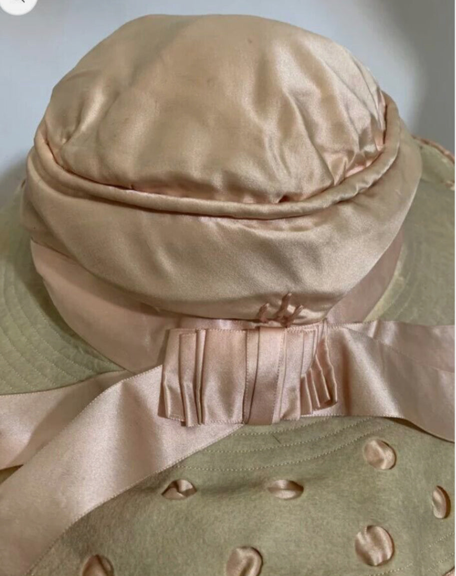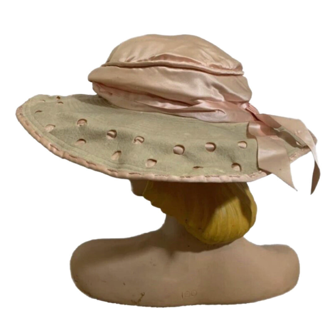 1910s pale pink silk hat with wide brim, soft crown- layered with buff wool boasting cut work polka dots! Pink silk ribbon, silk lined crown. Underneath brim is pink silk with channel stitching. Minor wear. Size 22, brim is 4" wide.