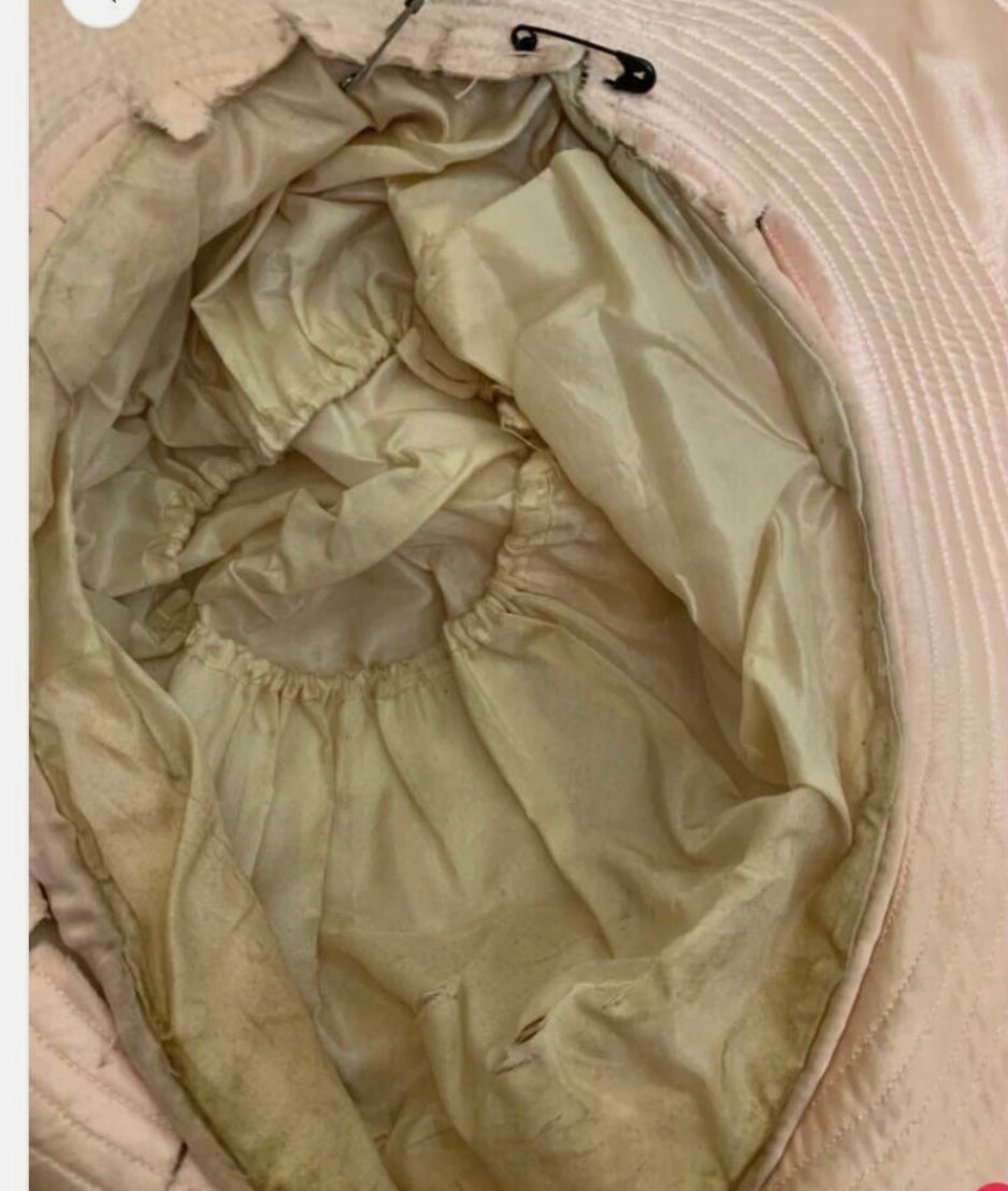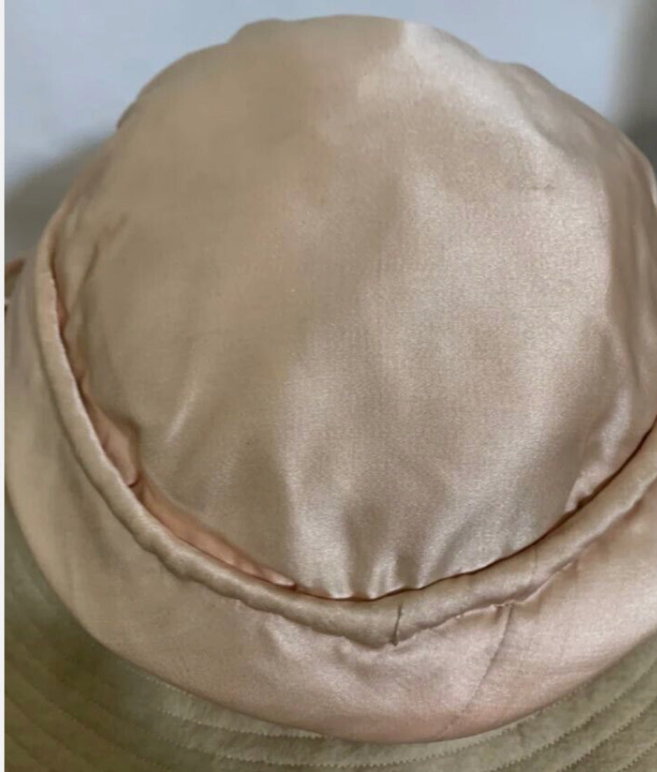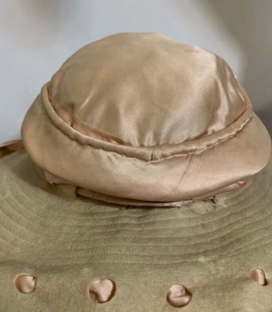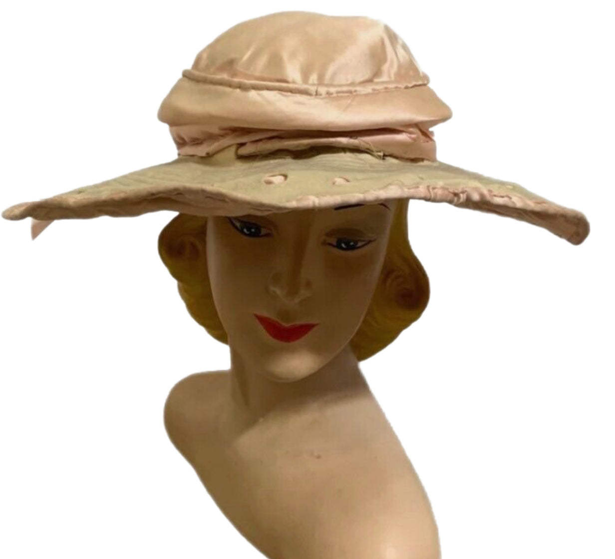1910s pale pink silk hat with wide brim, soft crown- layered with buff wool boasting cut work polka dots! Pink silk ribbon, silk lined crown. Underneath brim is pink silk with channel stitching. Minor wear. Size 22, brim is 4" wide.