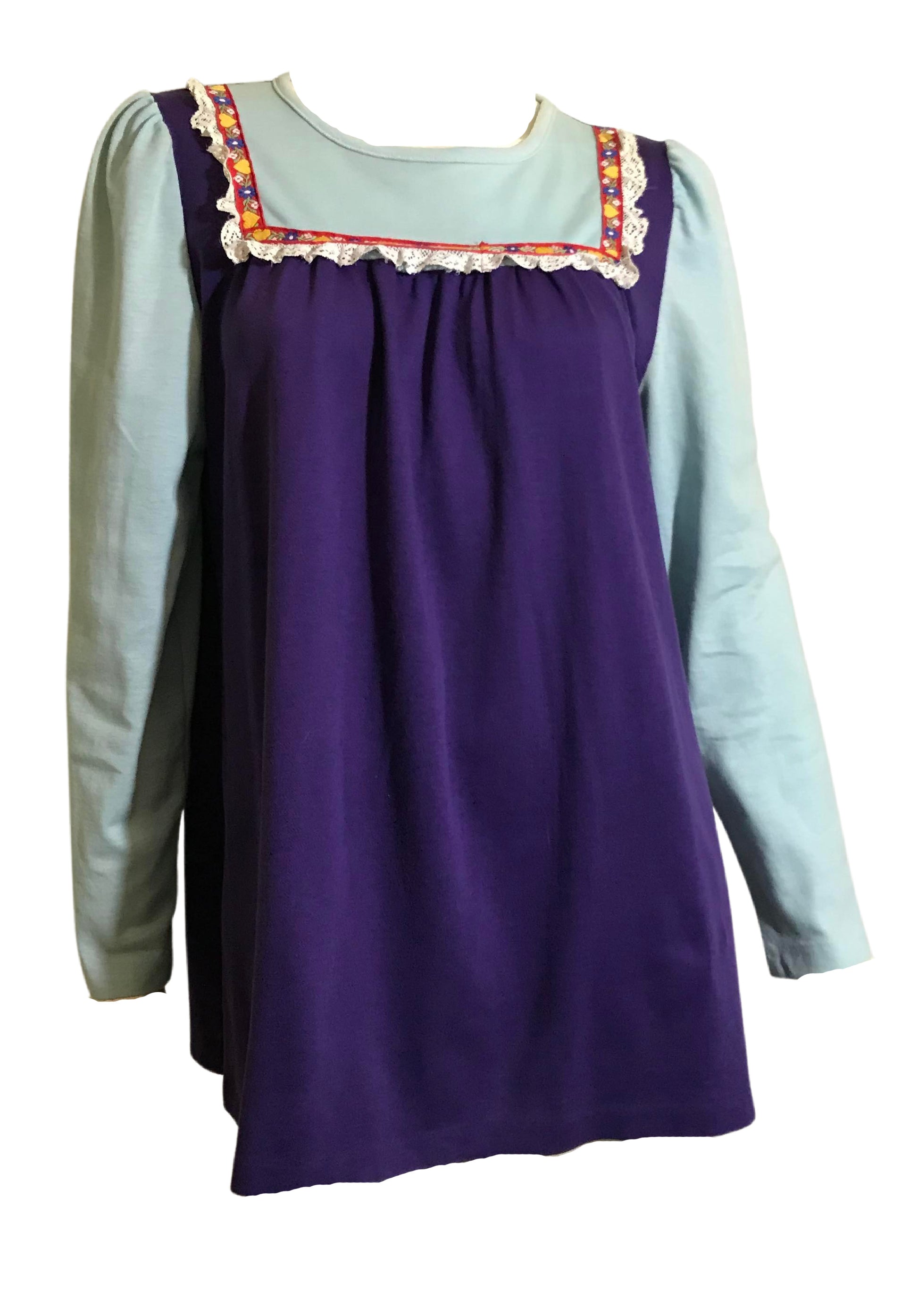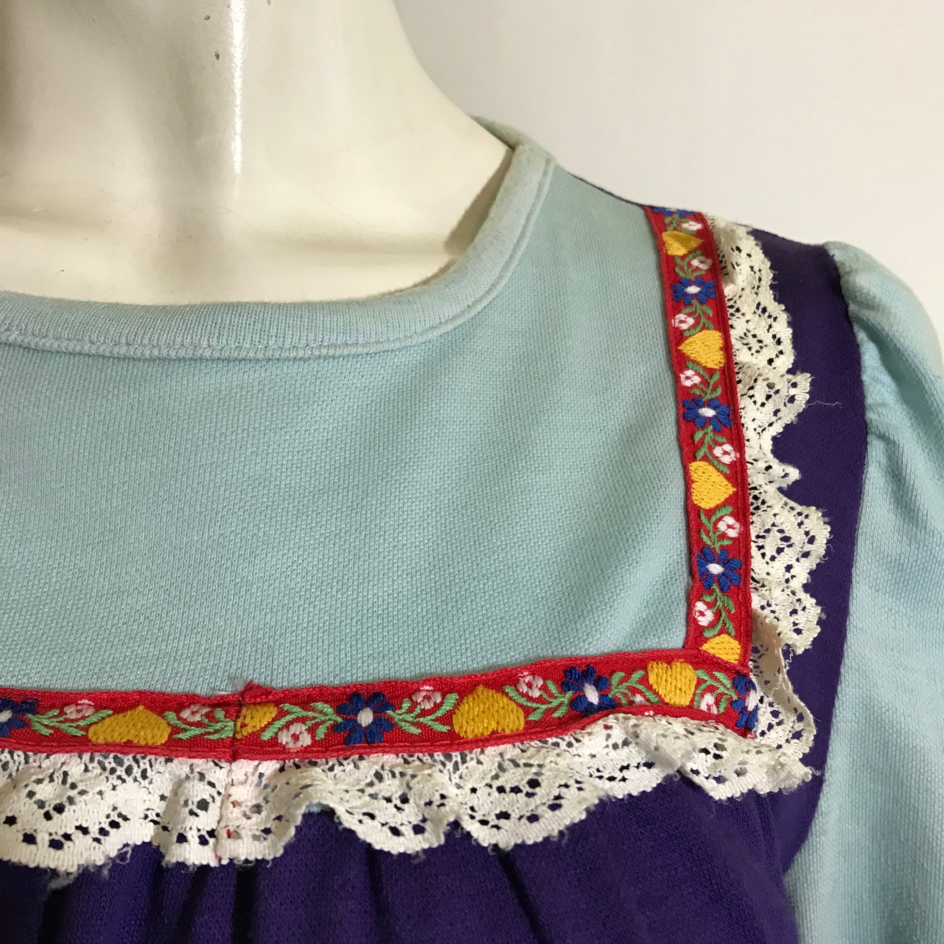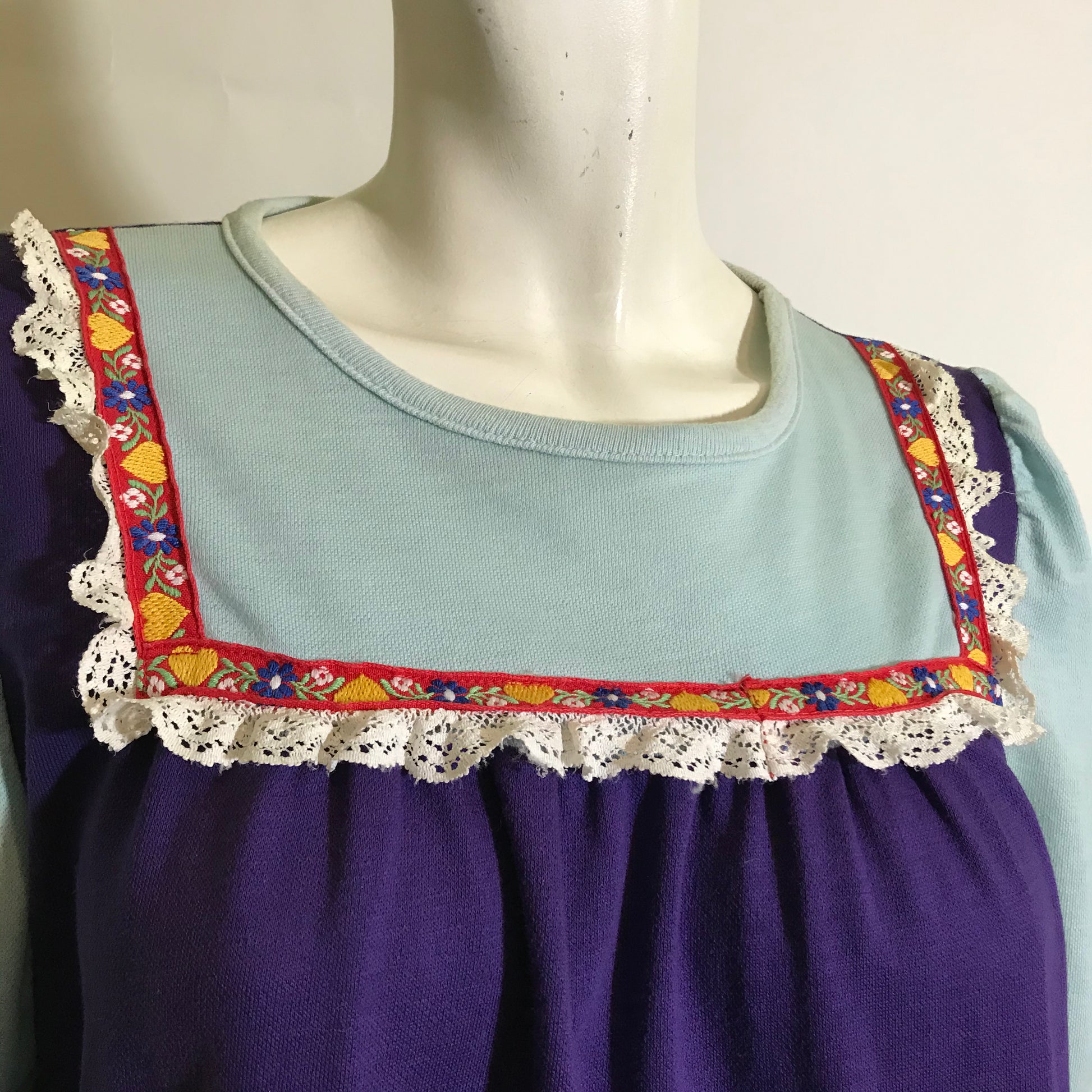 1970s cotton knit micro mini dress (or tunic) in purple and blue with lovely lace and embroidered heart ribbon! Back zip. No flaws.