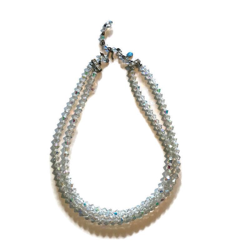 Heavy rainbow crystal double strand necklace from the 1950s. Tiny enameled Virgin Mary charm on back. 14-16" around, no flaws.
