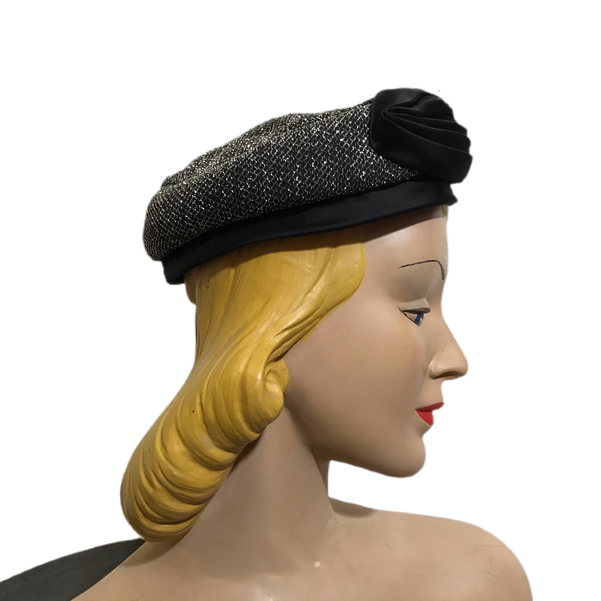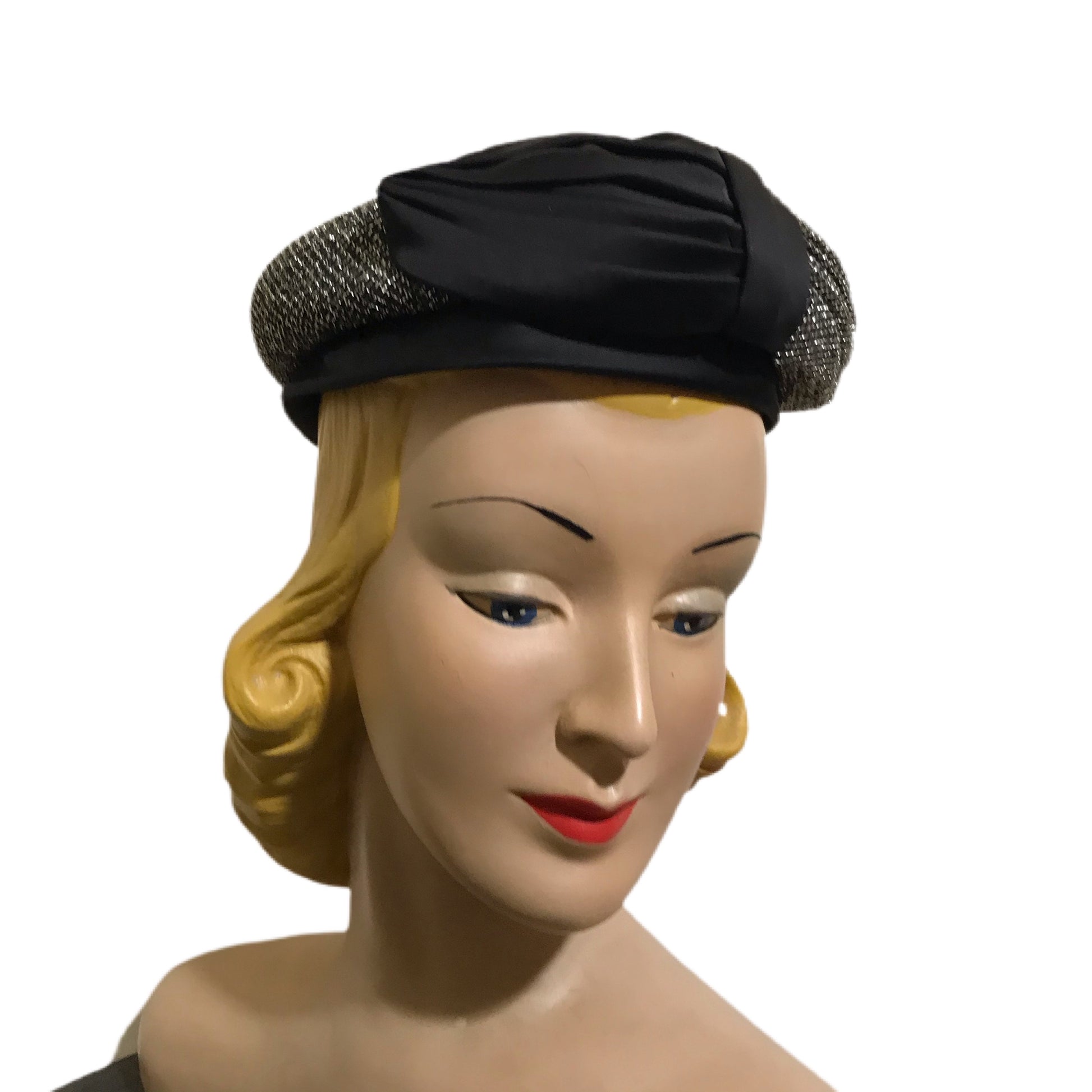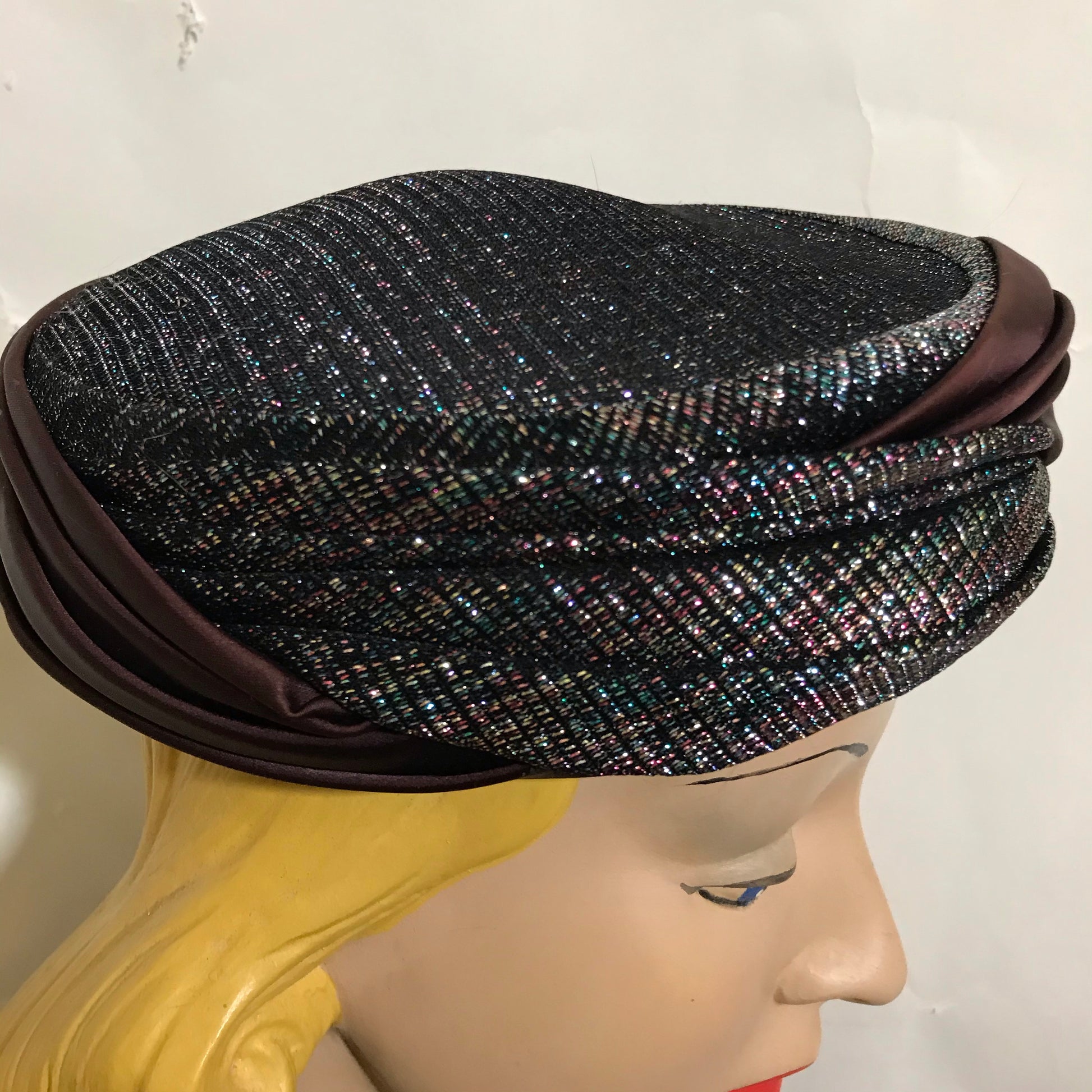 1960s rainbow lurex metallic cocktail hat w/ bronze satin pleated trim and base. No flaws, size 22.