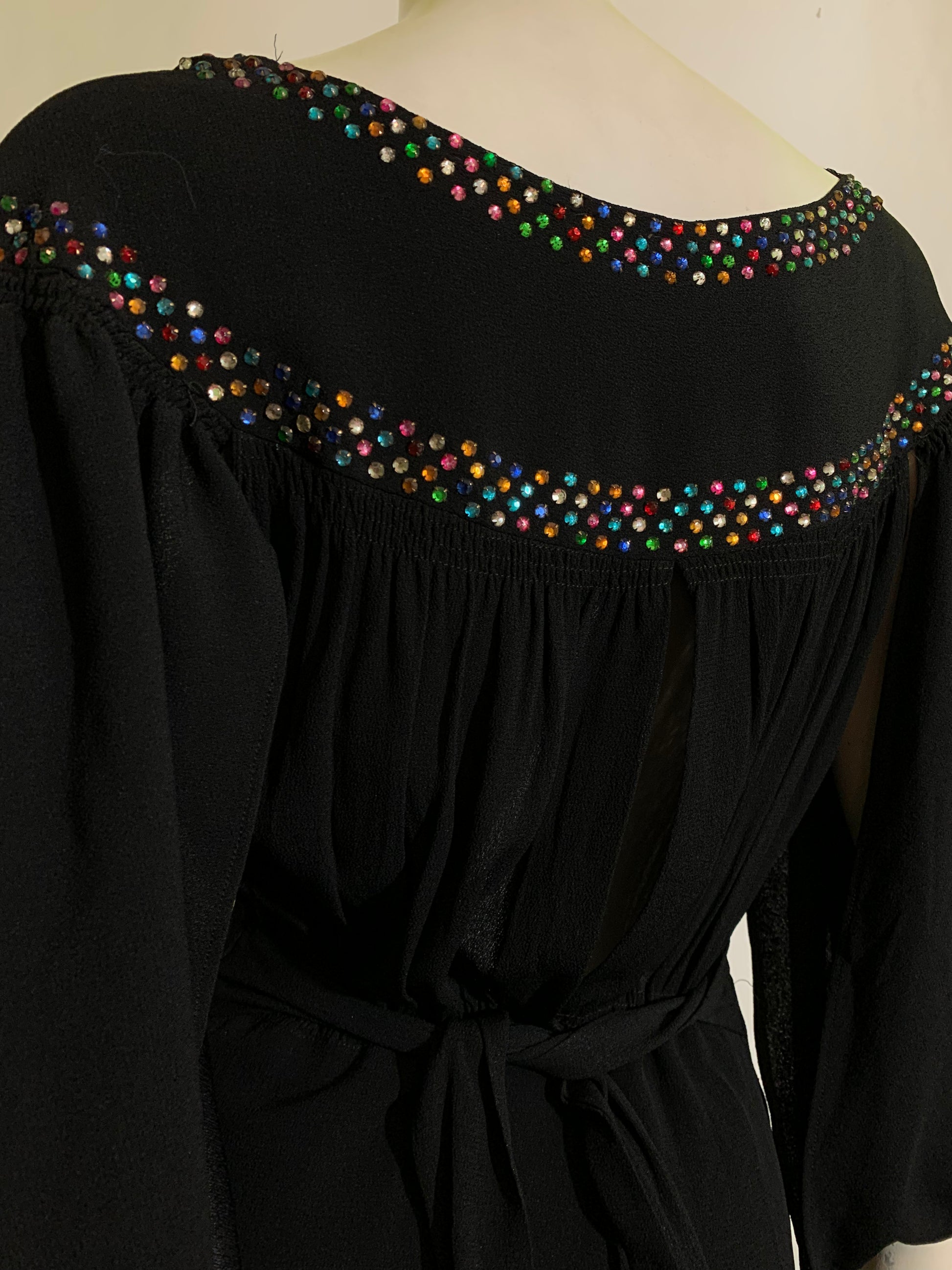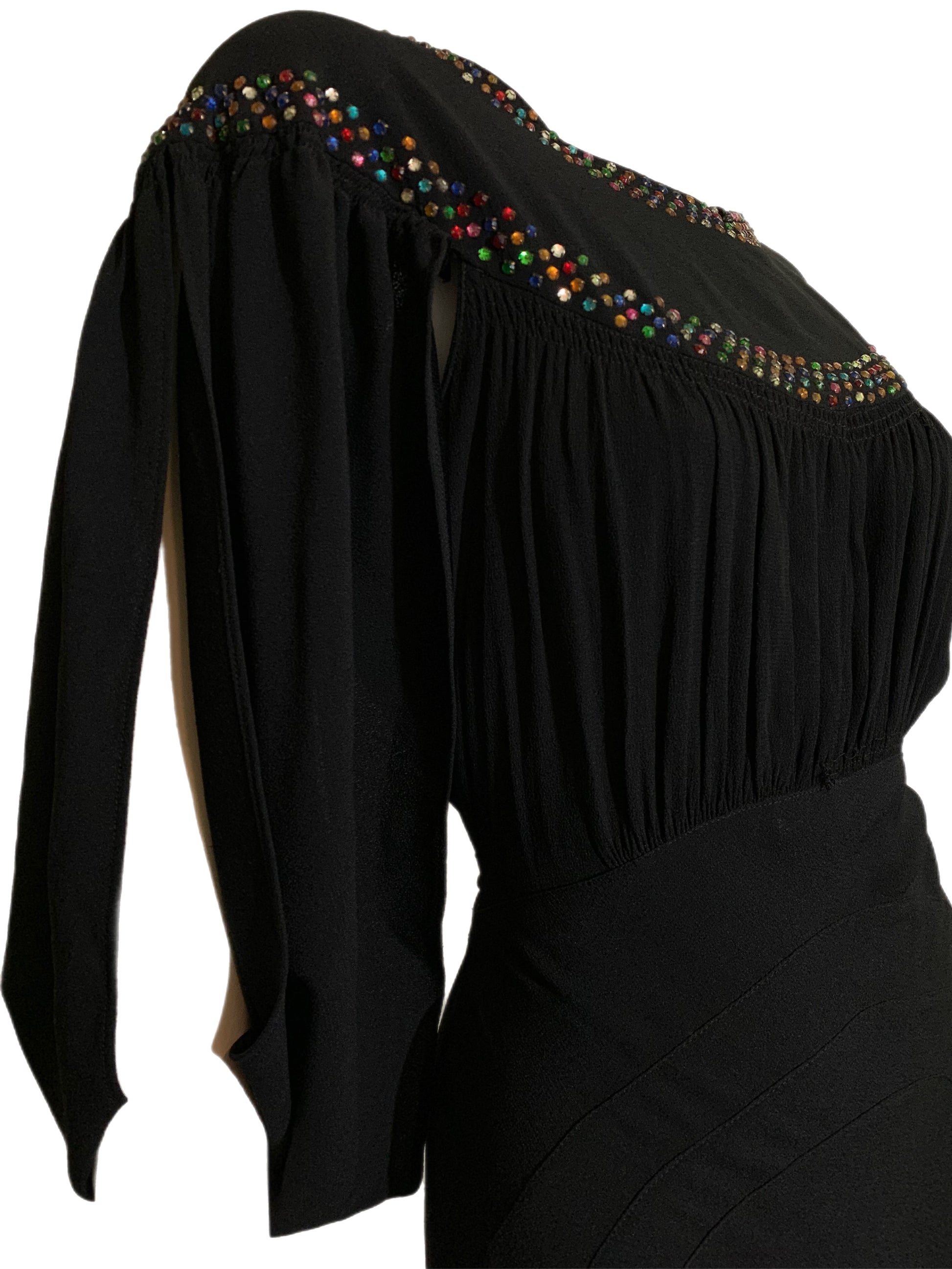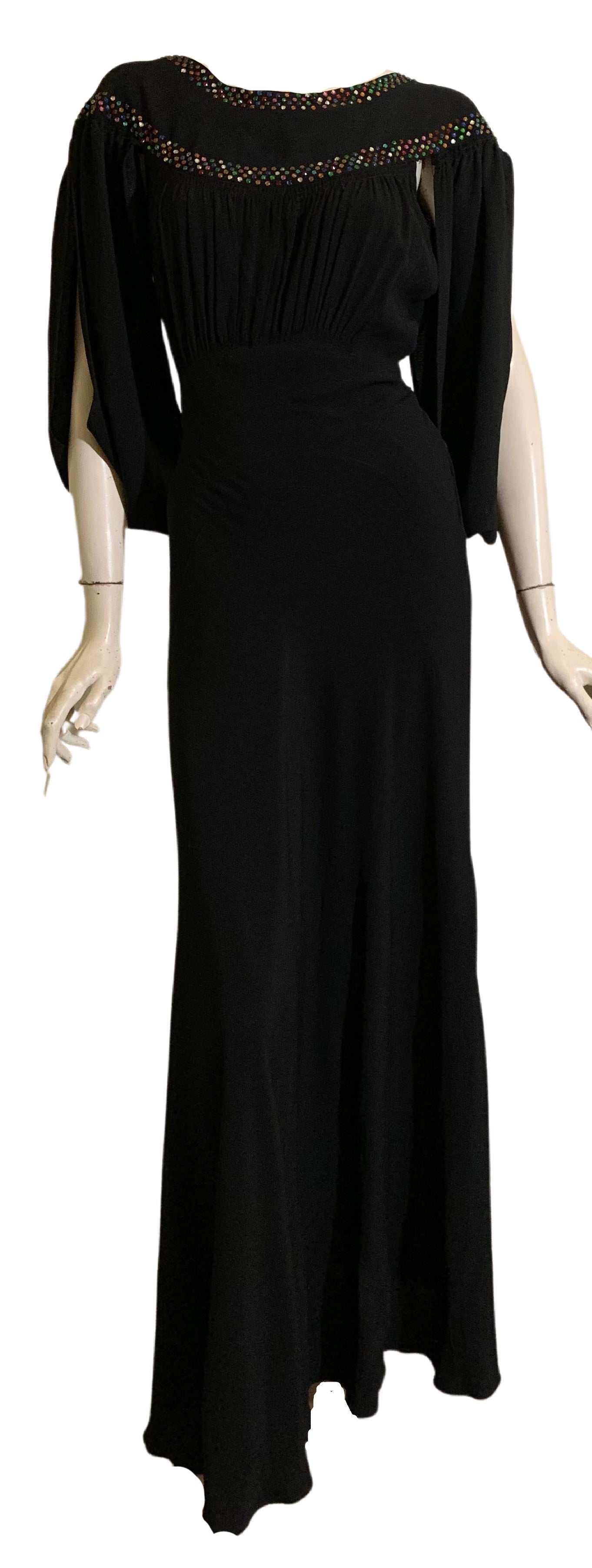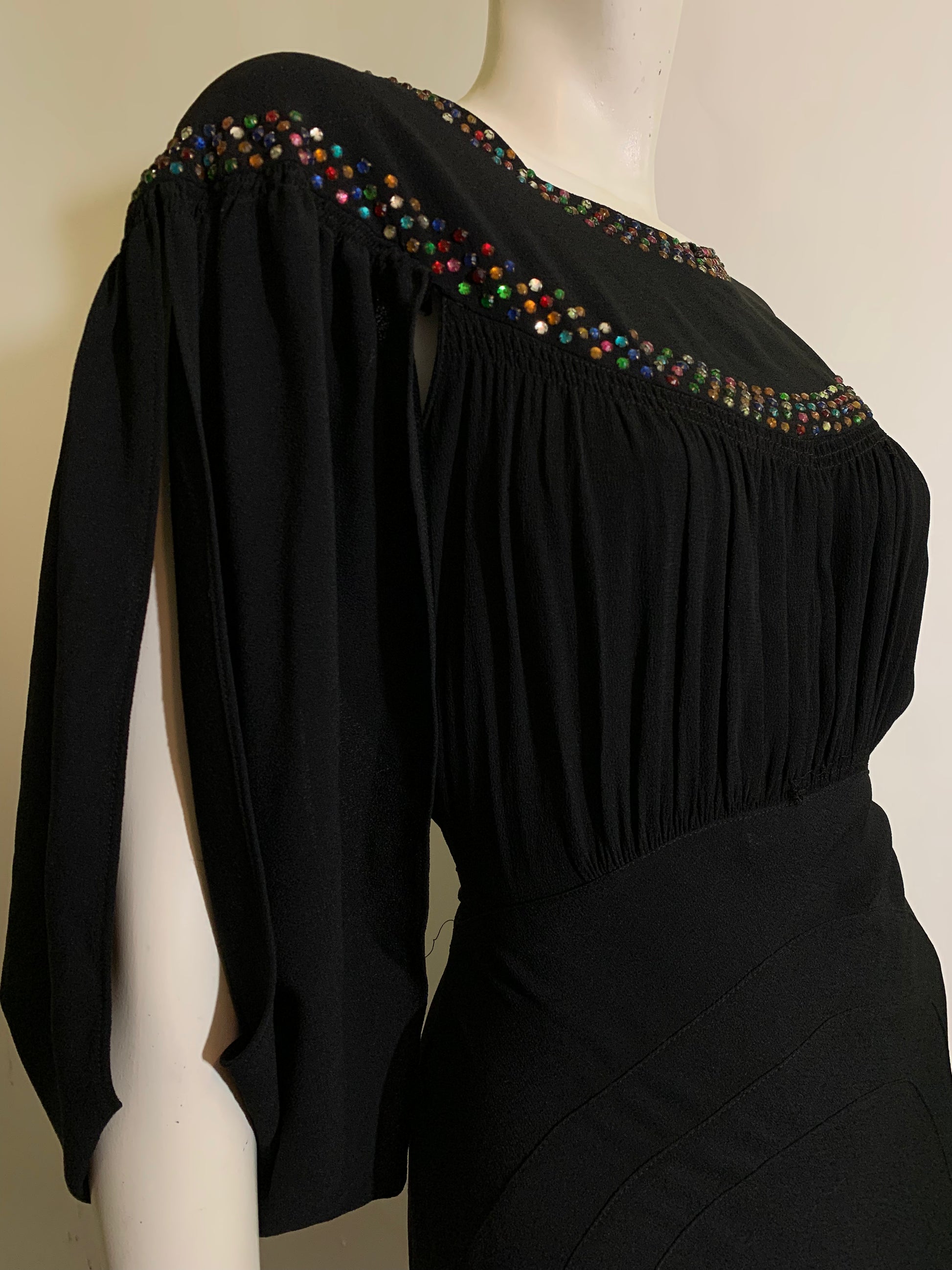 RESERVED Rainbow Vamp! Black Crepe Evening Gown with Rainbow Rhinestones and Side Slit Sleeves and Back circa 1930s