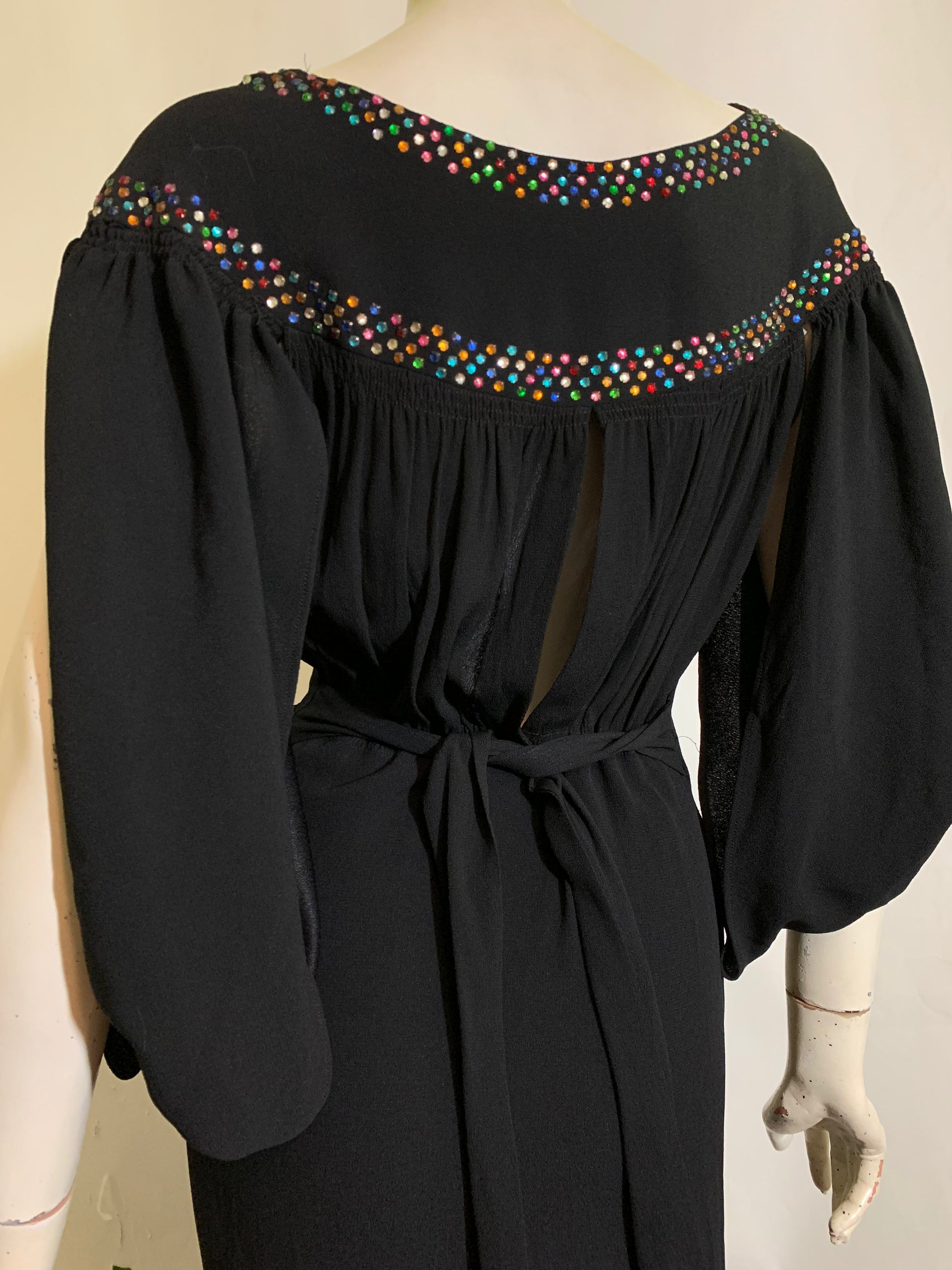 Glorious deep black satin back crepe rayon evening gown with deco seaming at waist, sash tie in back- side metal snaps. Neckline is studded with multicolored prong set rhinestones around front and back- sleeves loop around arm to create slit up side, small slit in back of bodice as well. No label, no flaws.